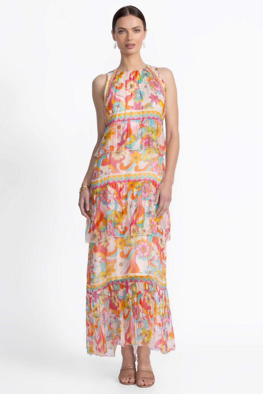 Crafted from luxurious 100% silk, the Karina Tiered Maxi Dress is embellished with a bold vintage-inspired pattern. Featuring a curved neckline and wide shoulder straps, this sleeveless dress is finished with a vibrant tiered skirt and ruffled detailing throughout. Pair with elevated sandals and sparkling gold jewelry for a polished daytime event.
