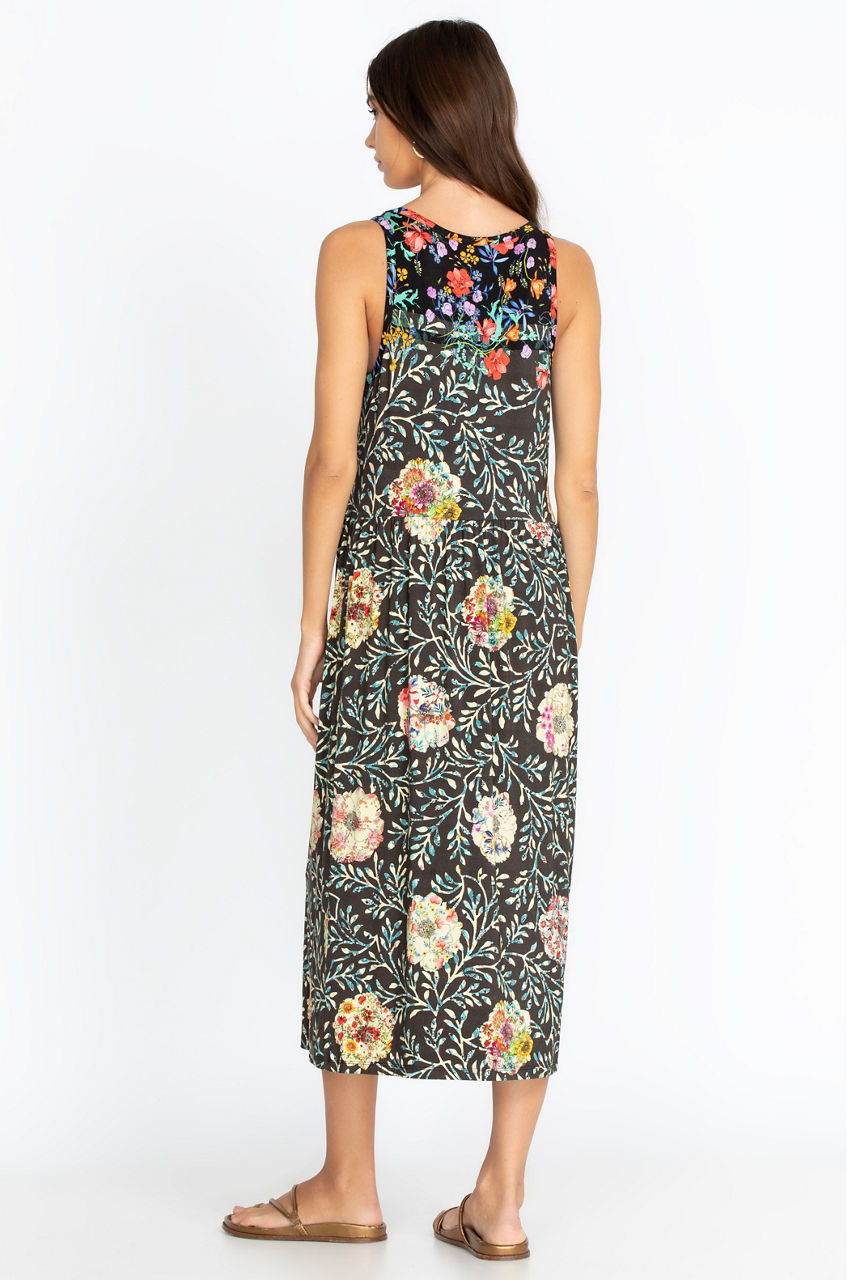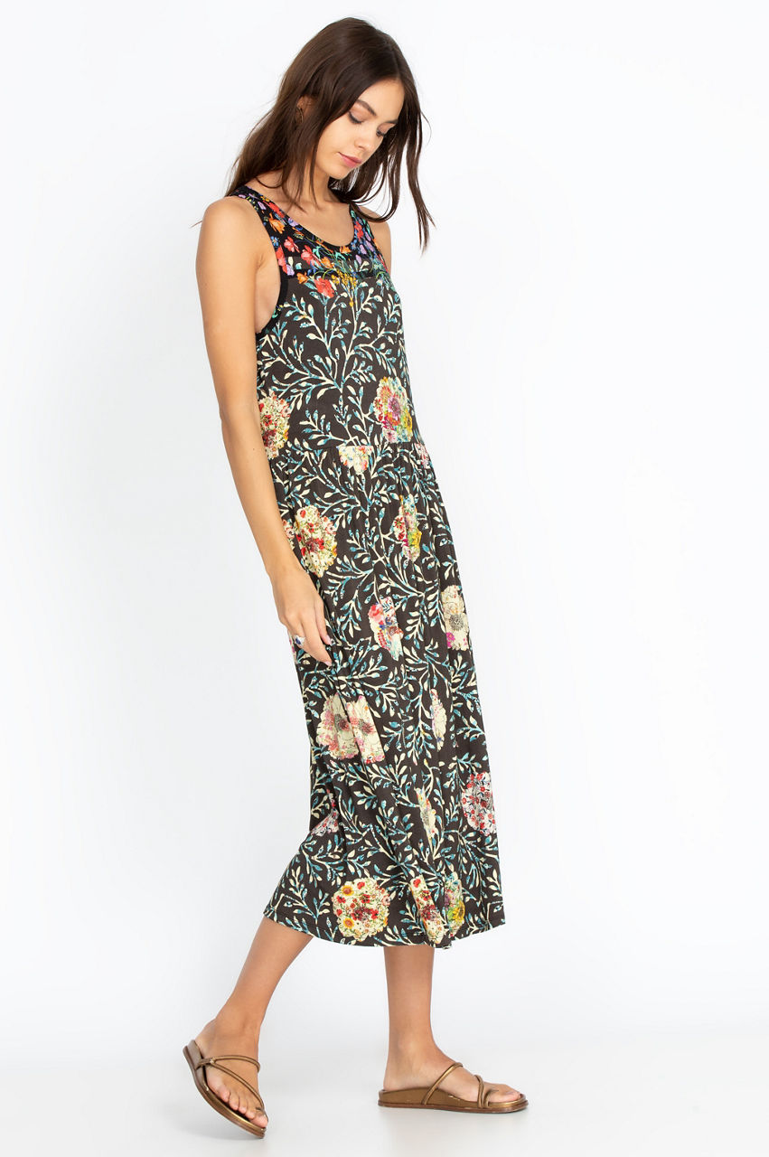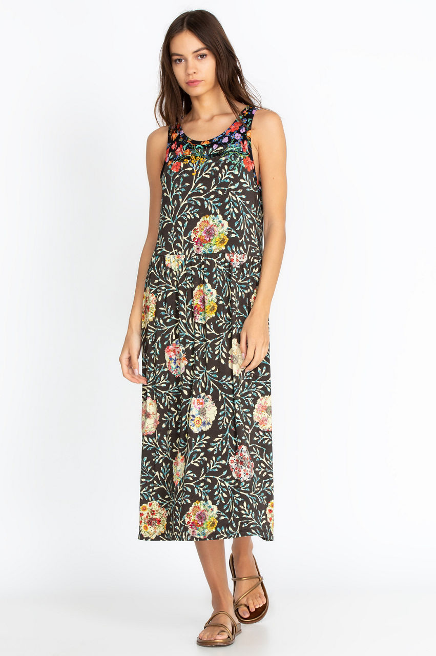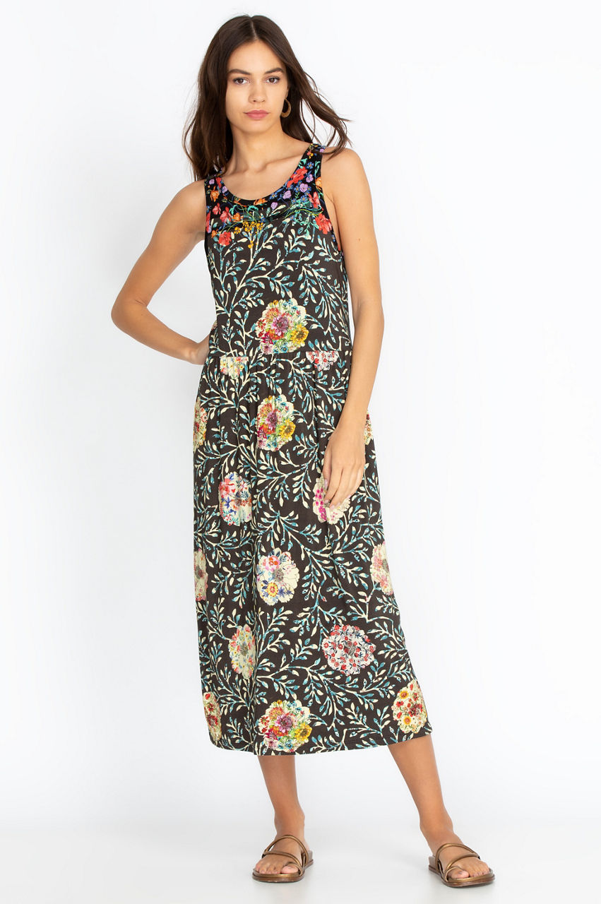 This stunning tank dress combines large floral motifs with a darker background to create a strong contrast. It s a comfortable and elegant piece you ll enjoy wearing for its flowy fit. You can style this versatile dress with some sandals and a simple shoulder bag for a relaxed summertime look or combine it with a leather jacket and some ankle booties for the fall.