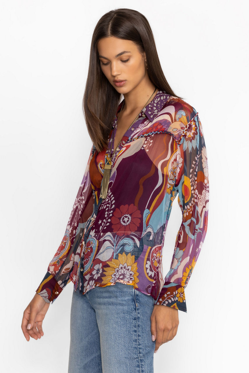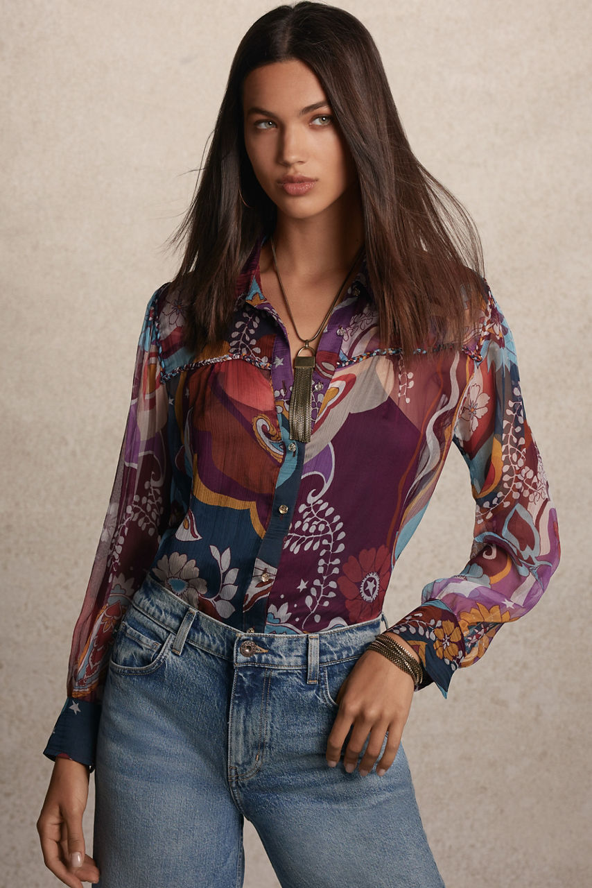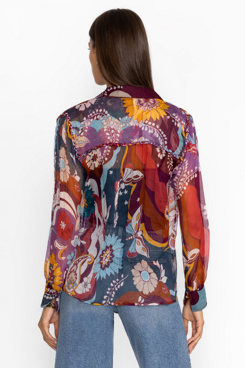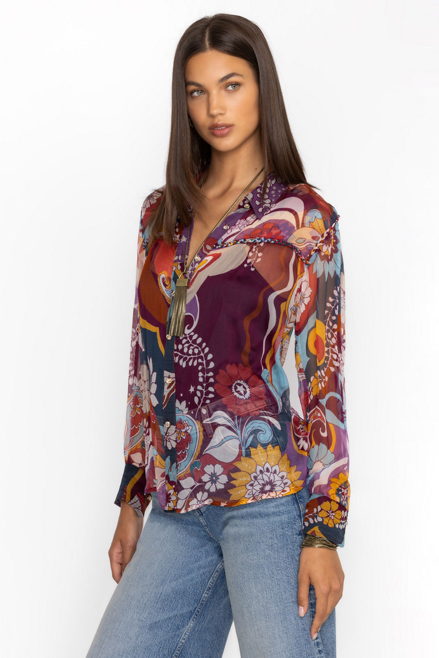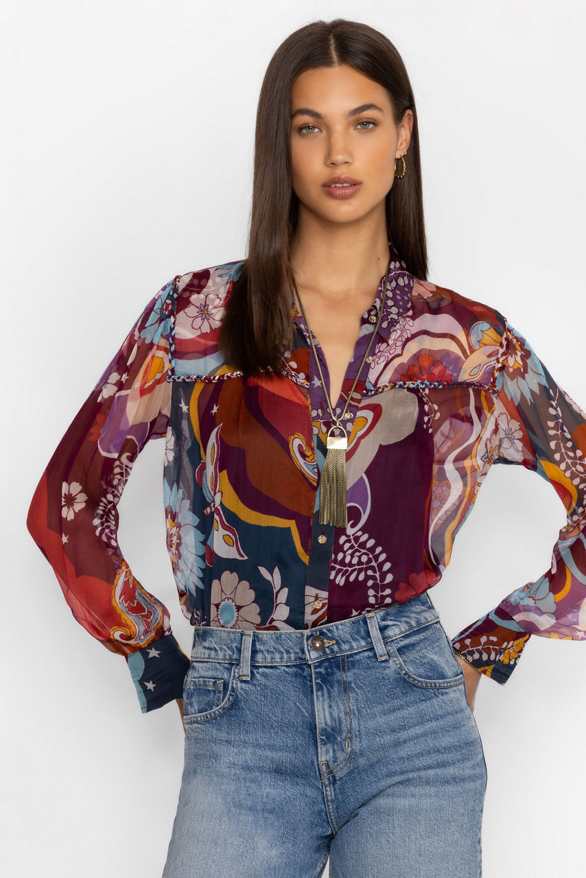 Crafted from 100% luxurious silk, the Katerina Braided Blouse is adorned with a bold and colorful multi-dimensional pattern. Featuring a collared button-front and cuffs at the sleeves, this slip-lined blouse offers intricate braided detailing at the yoke for a unique look. Pair with a classic pencil skirt and smart flats for a polished work look.