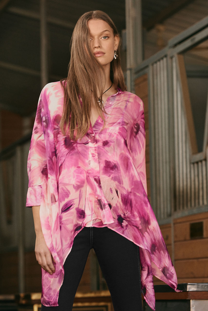 Offering a dramatic take on a classic button-down, the Katia Oversized Blouse is adorned with brilliant floral color. Crafted from a lightweight flowing fabric, this button-front blouse features a banded collar and a relaxed silhouette with a flowing handkerchief hemline. Pair with coordinating fitted pants and kitten heels for a polished daytime look.