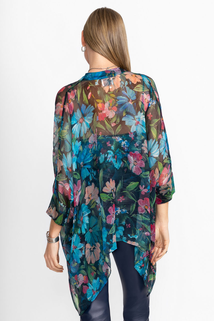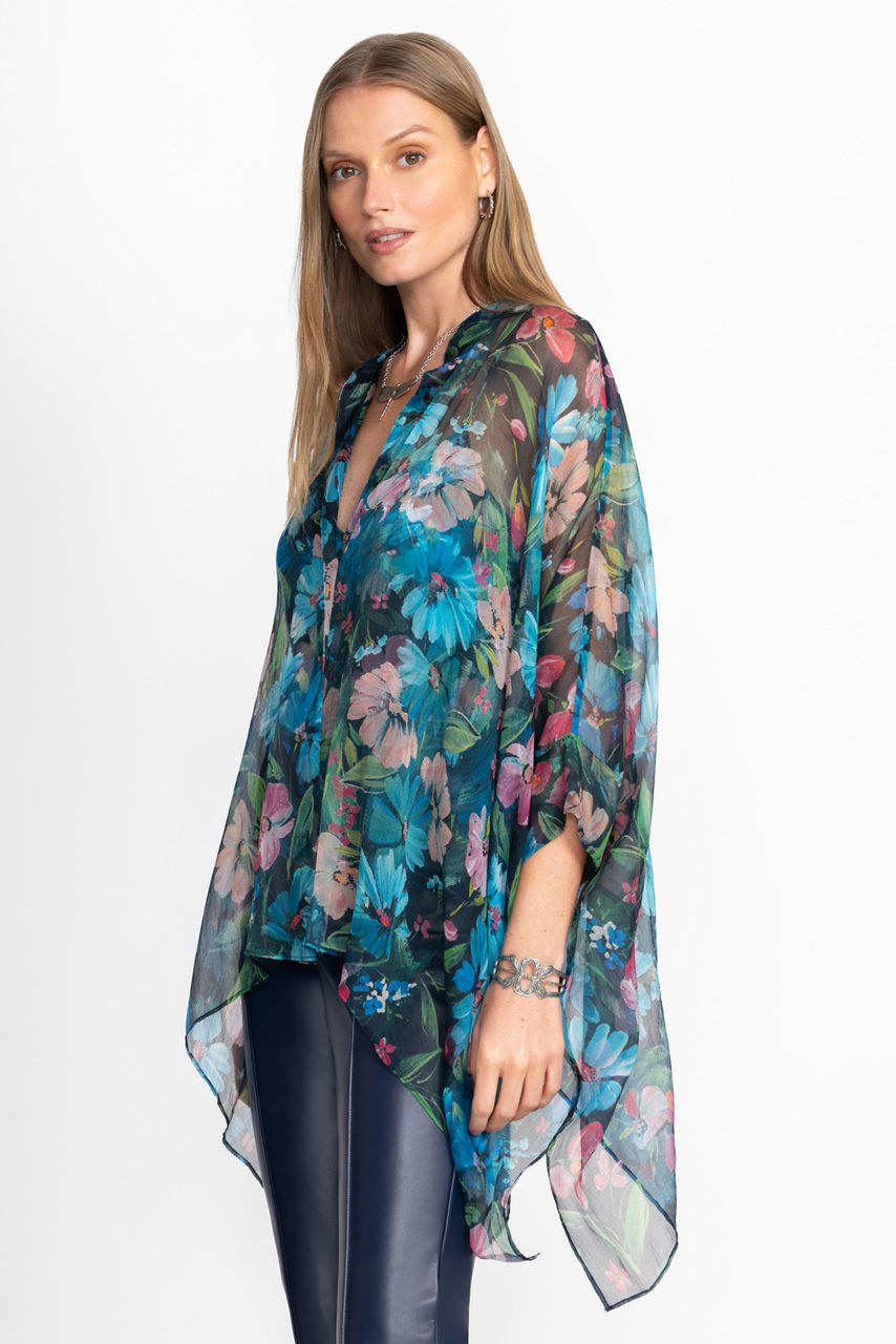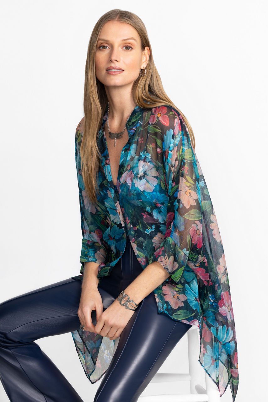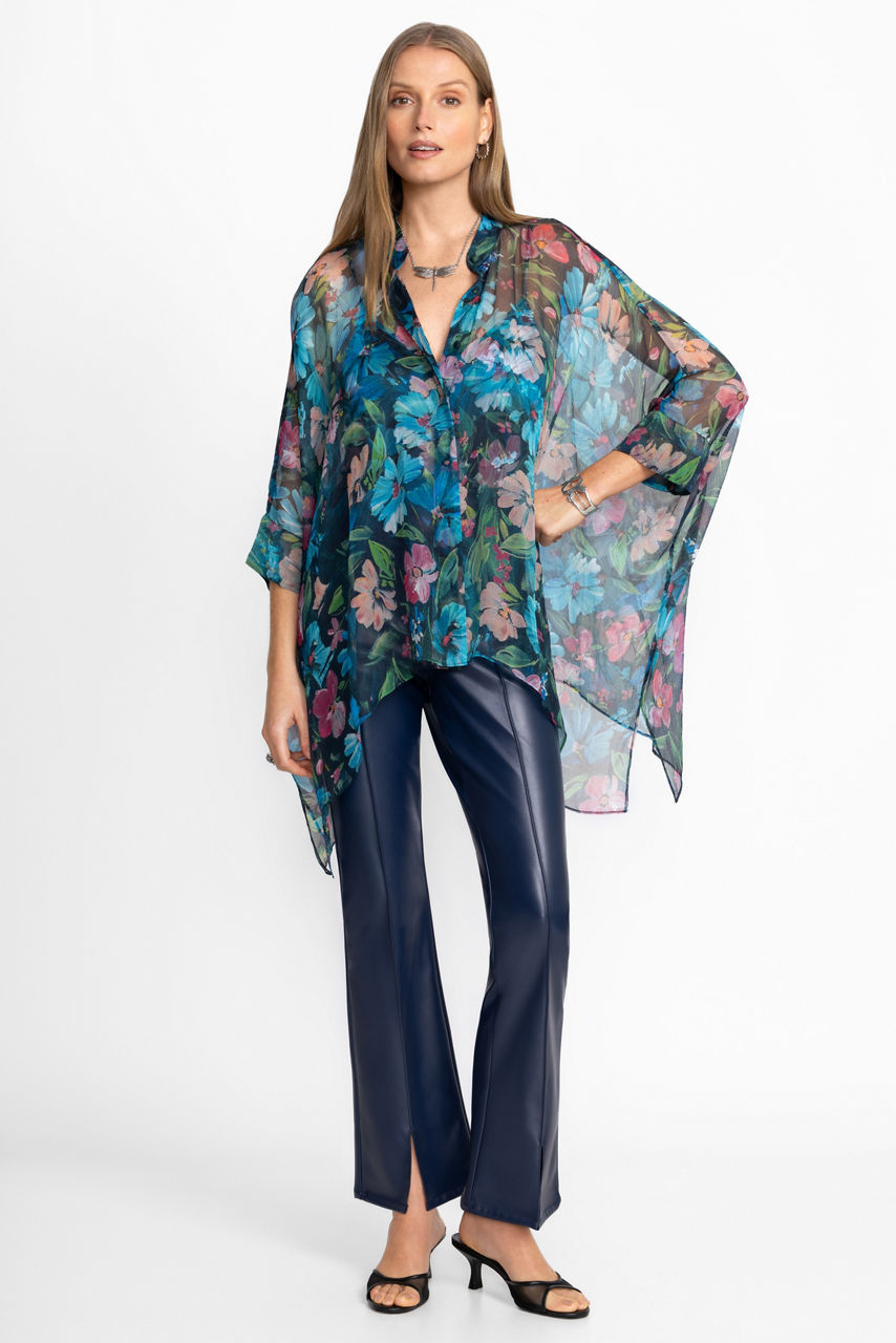 The Katia Oversized Blouse is crafted from 100% luxurious silk. Designed with a standing collar and button-front, this 3/4 sleeve blouse offers a mesh shell and matching cami and is finished with a flowing handkerchief hemline. Pair with a fitted skirt and bold flats for a modern work ensemble.