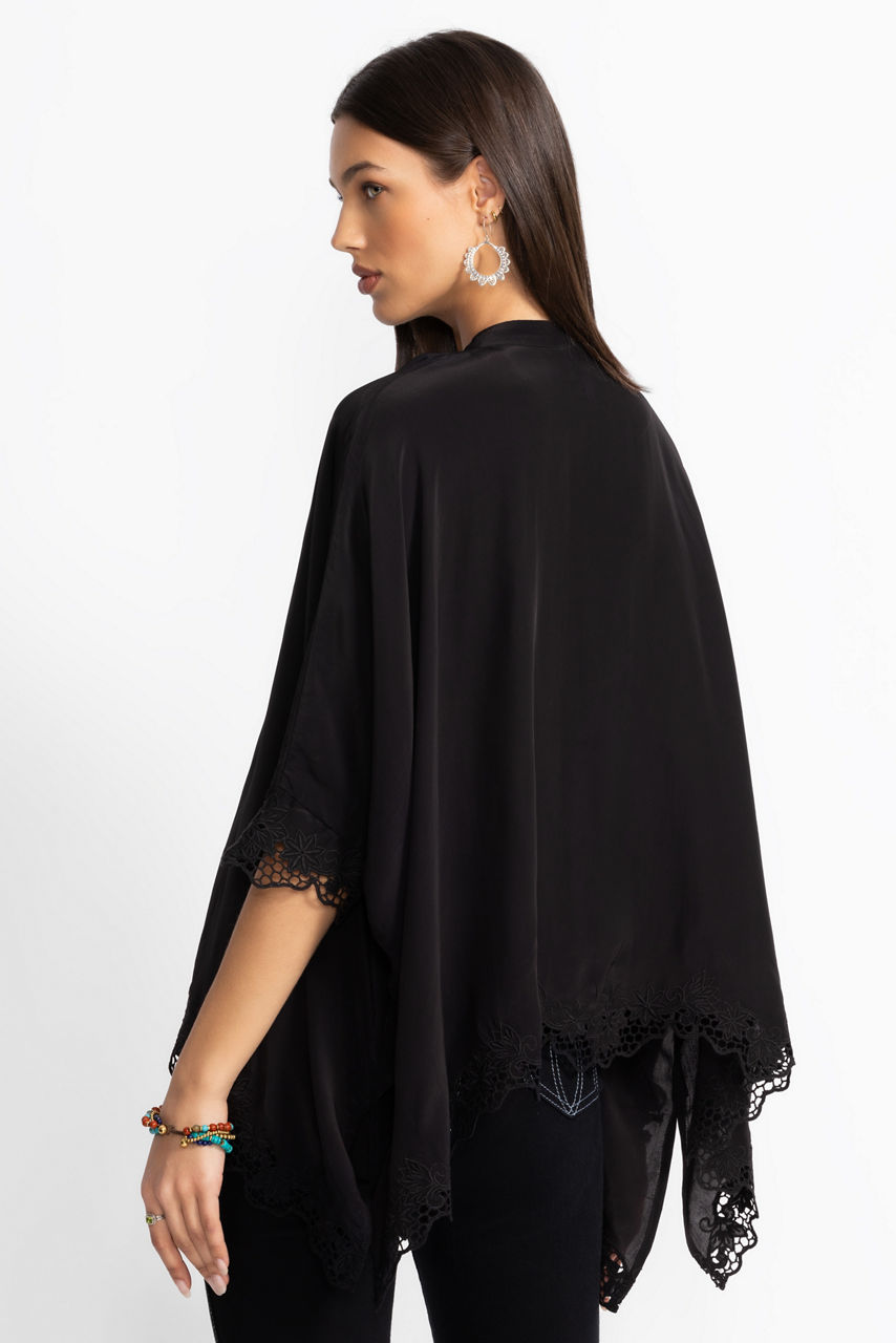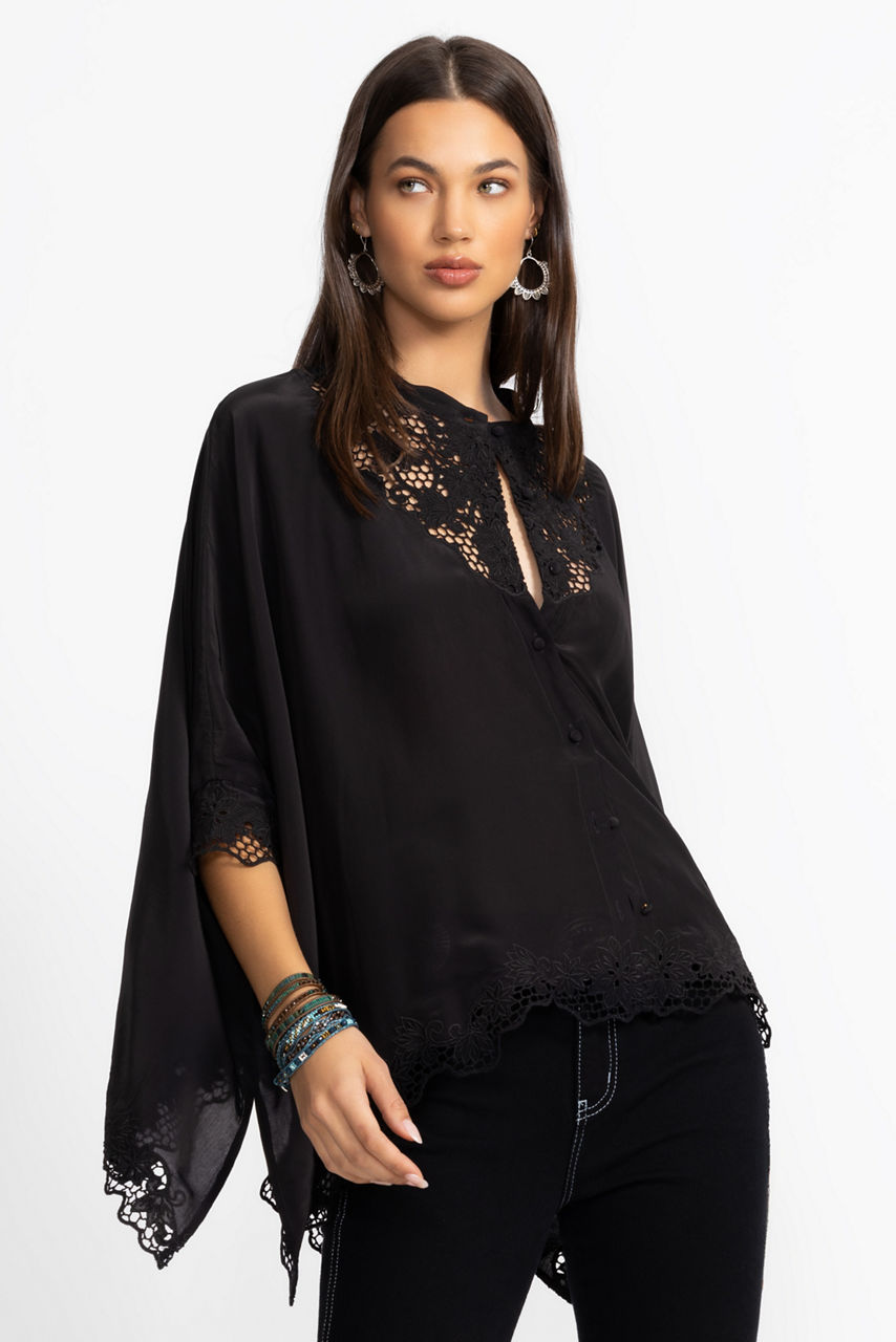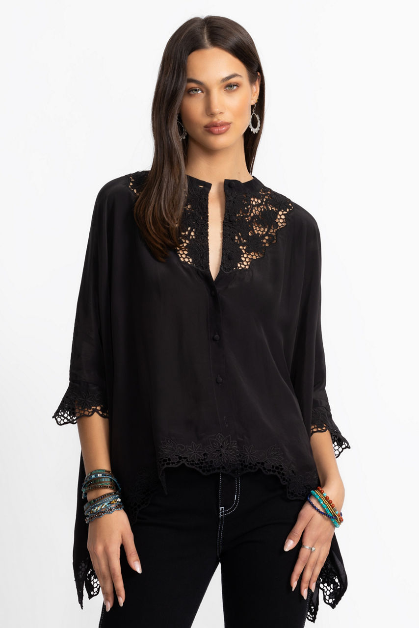 Offering a dramatic take on a classic button-down, the Katia Oversized Blouse is designed with a unique cut. Crafted from 100% viscose and featuring a banded collar and intricately embroidered lace panels at the neck and sleeve cuffs, this beautiful blouse is finished with a flowing handkerchief hemline. Pair with coordinating fitted pants and kitten heels for a polished evening look.