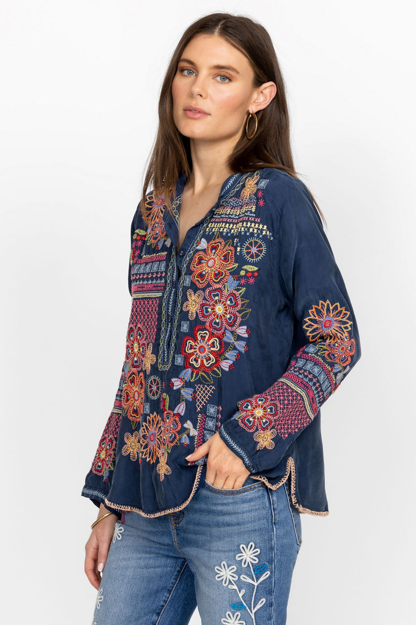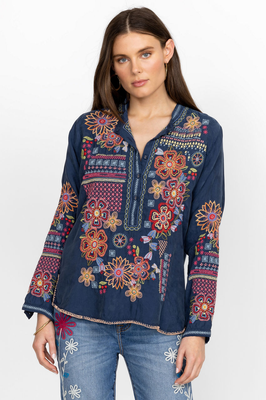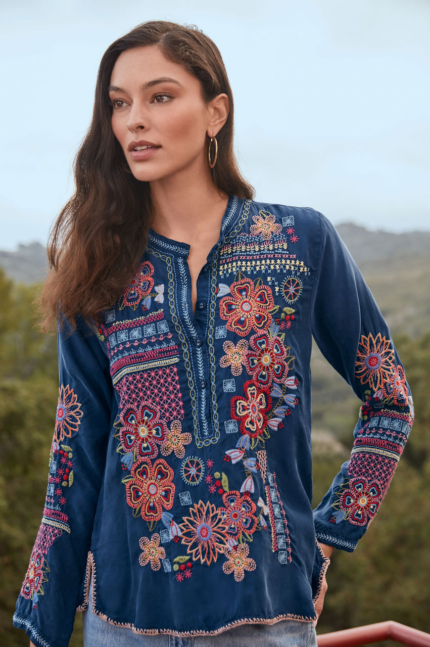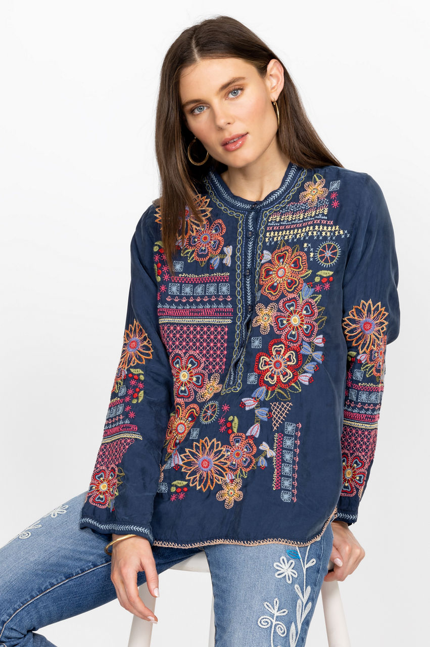 Infused with optimism, the Katie Blouse brings a joyful touch to a timeless wardrobe staple. Made from a comfortable material with a subtle repeated background pattern, this blouse features a round neck, a front button closure, long sleeves, and a colorful placement embroidery comprising happy floral motifs. Wear with denim or pair with linen pants for a nonchalant daytime look.