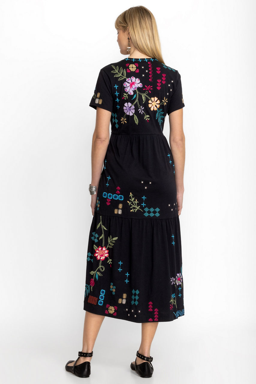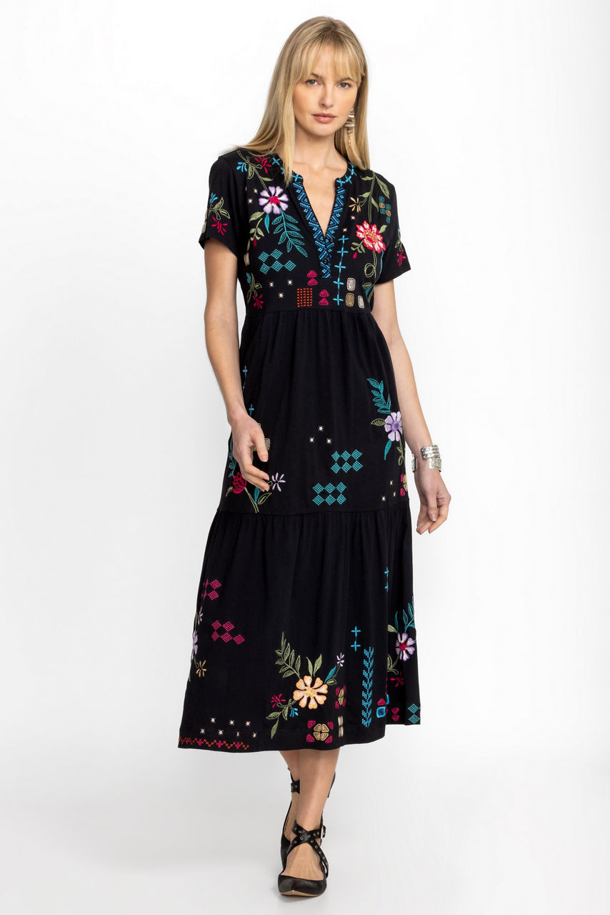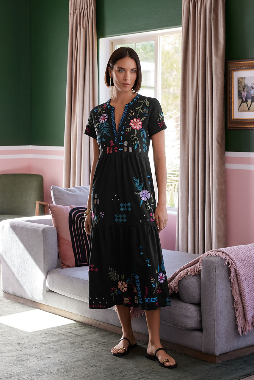 Thoughtfully crafted with warm days in mind, the Katie Henley Tiered Knit Dress is crafted from 100% breathable cotton. Featuring a Henley neckline and cap sleeves, this three-tier maxi dress is embellished with vibrant placement embroidery. Pair with colorful flats and sparkling silver jewelry for a polished look for a weekend getaway.