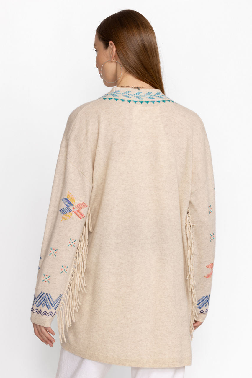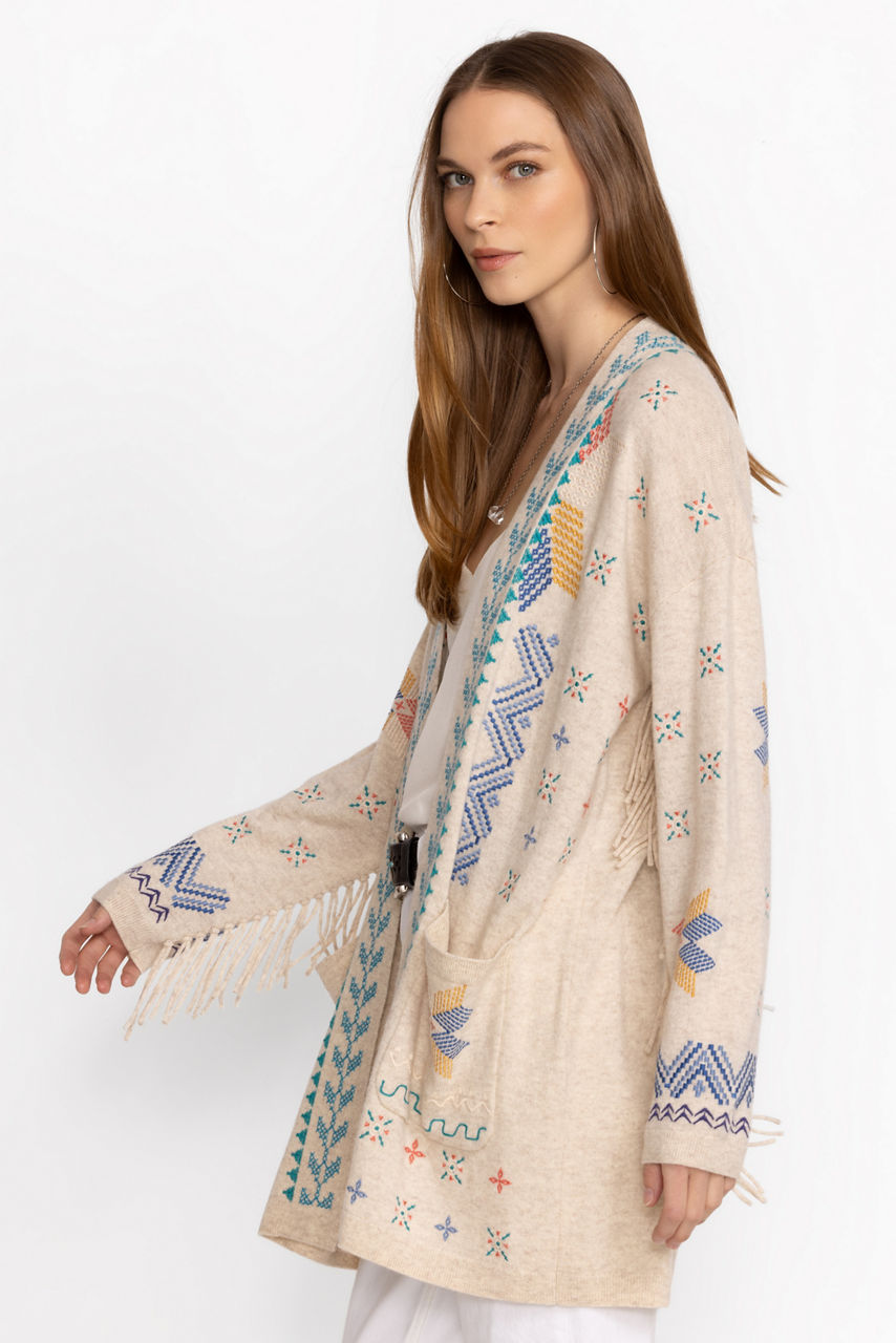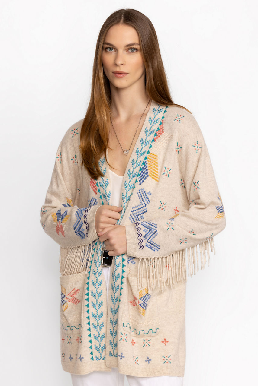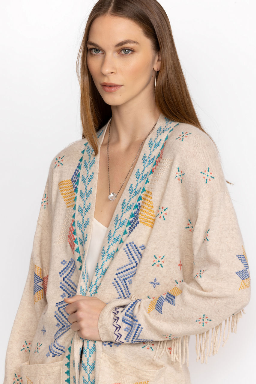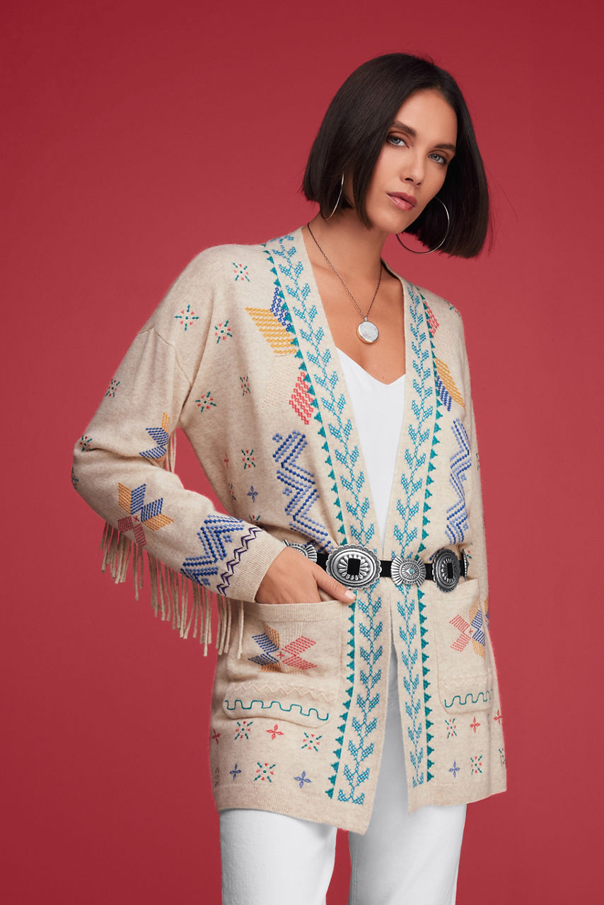 A versatile addition to your layering wardrobe, the Katie Long Cardigan offers a vibrant display of texture and color. Crafted from a cozy cashmere blend, this unique cardigan is adorned with vibrant placement embroidery and finished with playful fringe at the sleeves. Layer over a solid blouse and pair with jeans as ankle boots for cooler days.