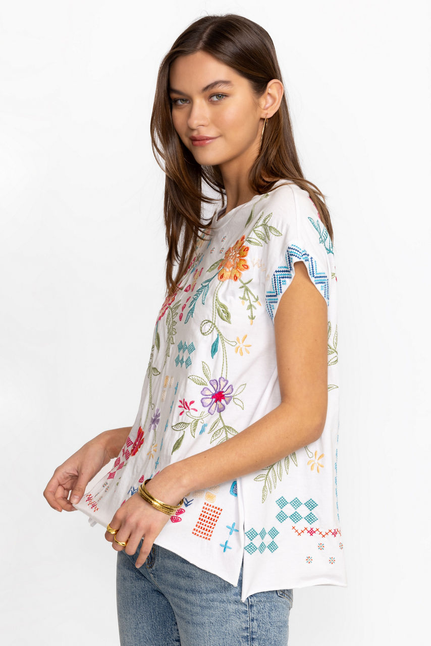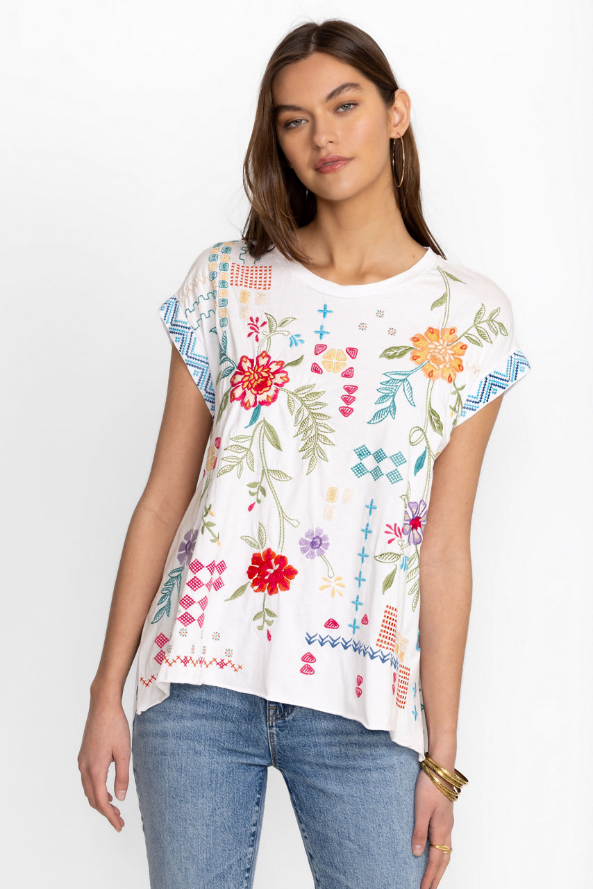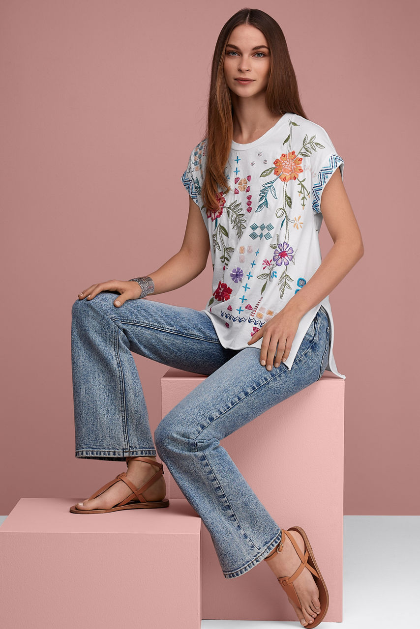 Crafted from 100% breathable cotton, the Katie Relaxed Drape Tee offers unmatched comfort with a splash of color. Featuring a gently curved boatneck and capped sleeves, this relaxed fit tee is adorned with vibrant placement embroidery. Pair with linen shorts and leather sandals for a stylish look for the warmest days.