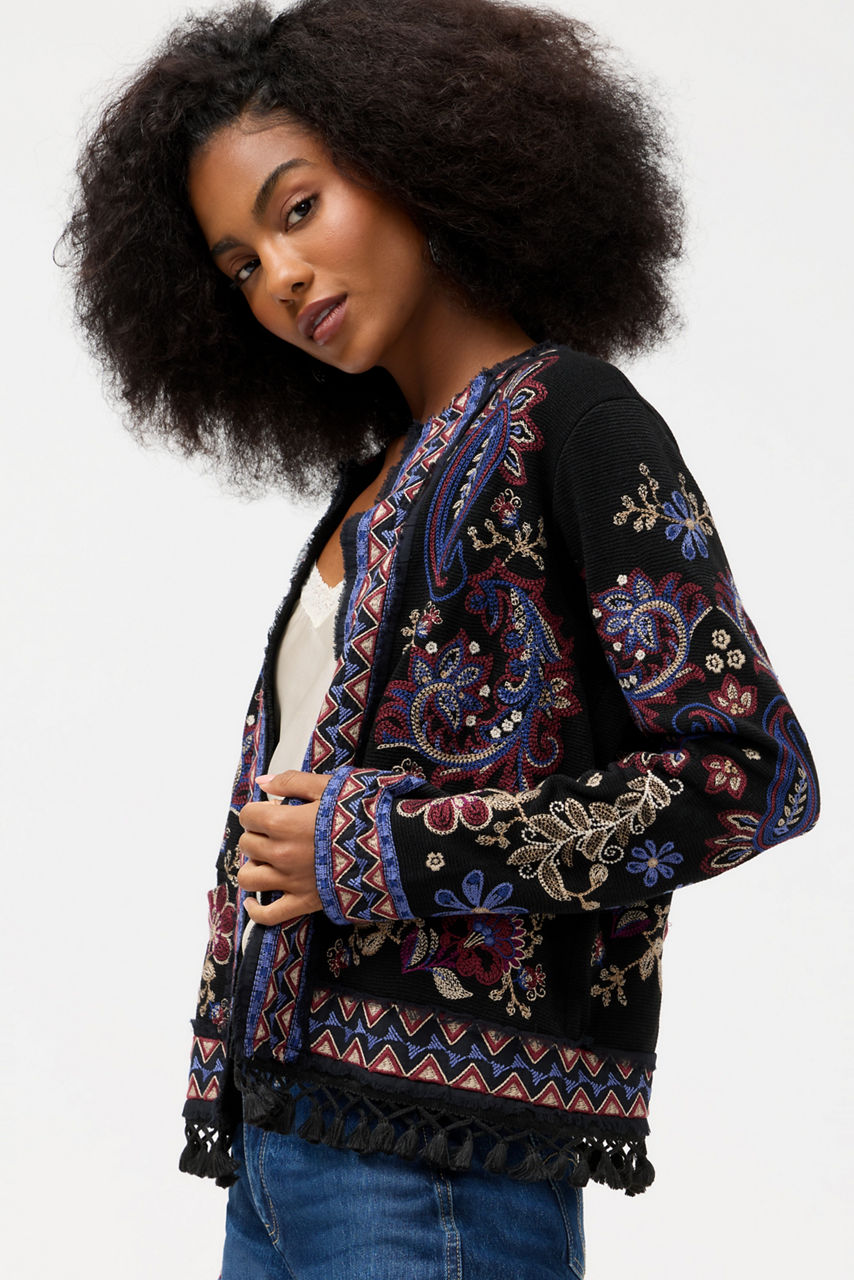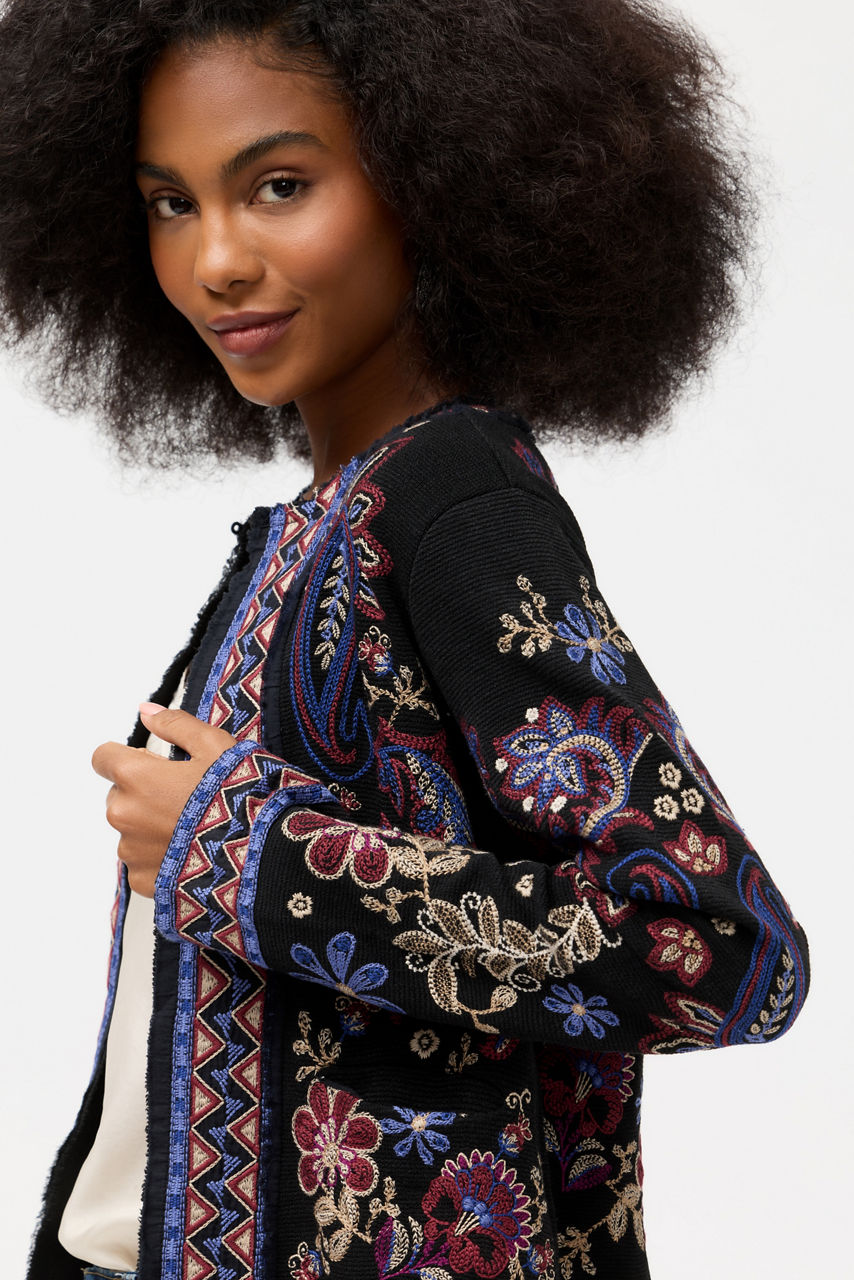 Beautifully embellished with a vibrant kaleidoscope of color, the Montanna Katiuska Short Fringe Jacket features intricately embroidered detailing. Designed with a rounded neckline and contrasting trim, this cropped jacket is finished with pockets and an eye-catching fringe detail at the hemline. Layer over a classic black dress for a splash of bold color.