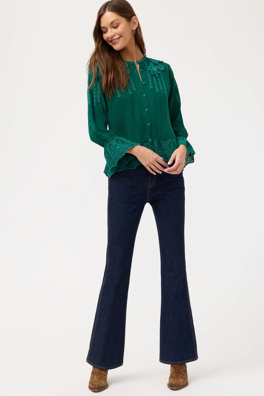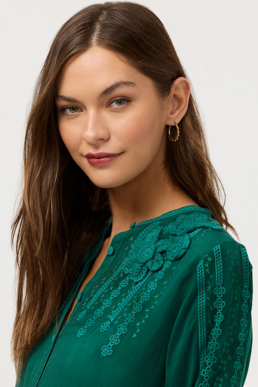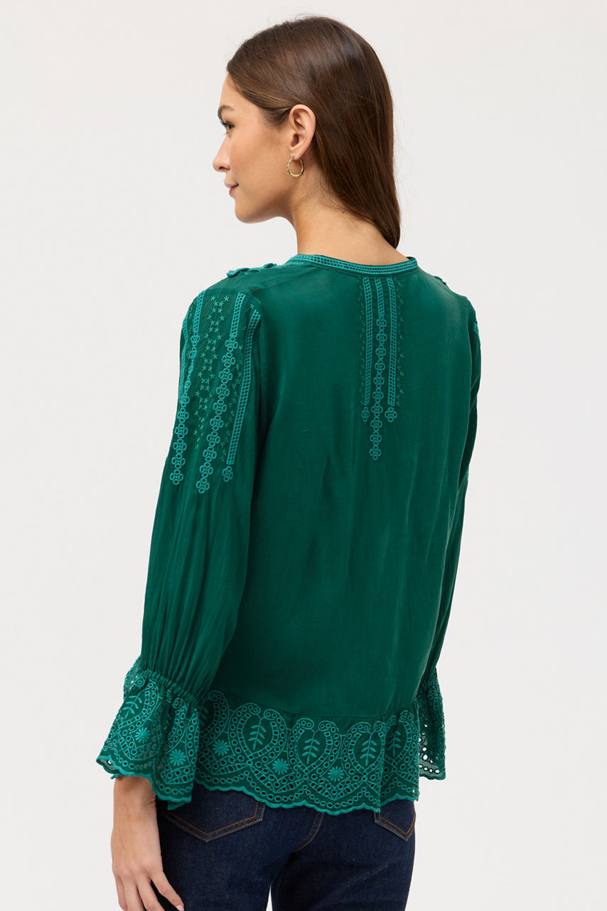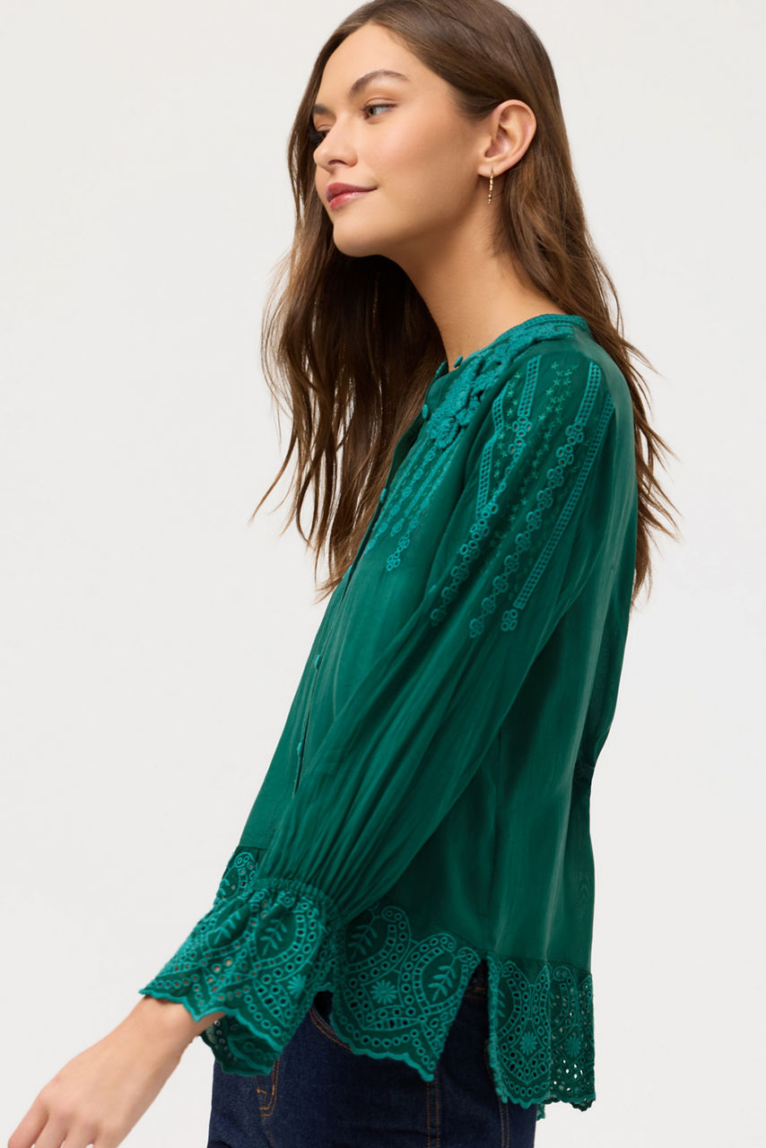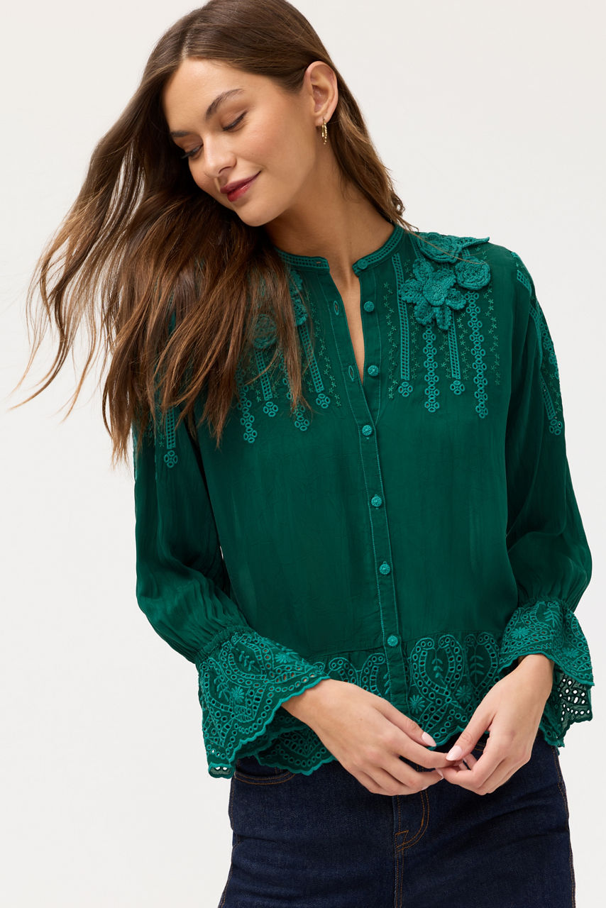 Beautifully embellished with delicate eyelet and appliqu embroidery, the Katya Shirt perfectly combines intricate detail and a distinctive feminine silhouette. Featuring a rounded collar and Bishop sleeves, this blouse is finished with a button-front and scalloped edges at the sleeves and hemline. Pair with classic trousers and easy flats for a modern workday look.