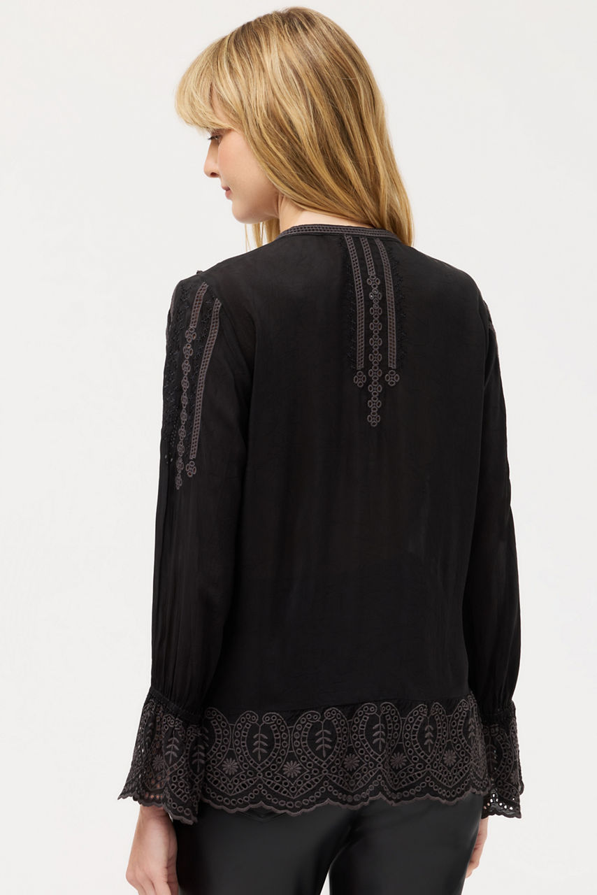 Beautifully embellished with delicate eyelet and appliqu embroidery, the Katya Shirt perfectly combines intricate detail and a distinctive feminine silhouette. Featuring a rounded collar and Bishop sleeves, this blouse is finished with a button-front and scalloped edges at the sleeves and hemline. Pair with classic trousers and easy flats for a modern workday look.