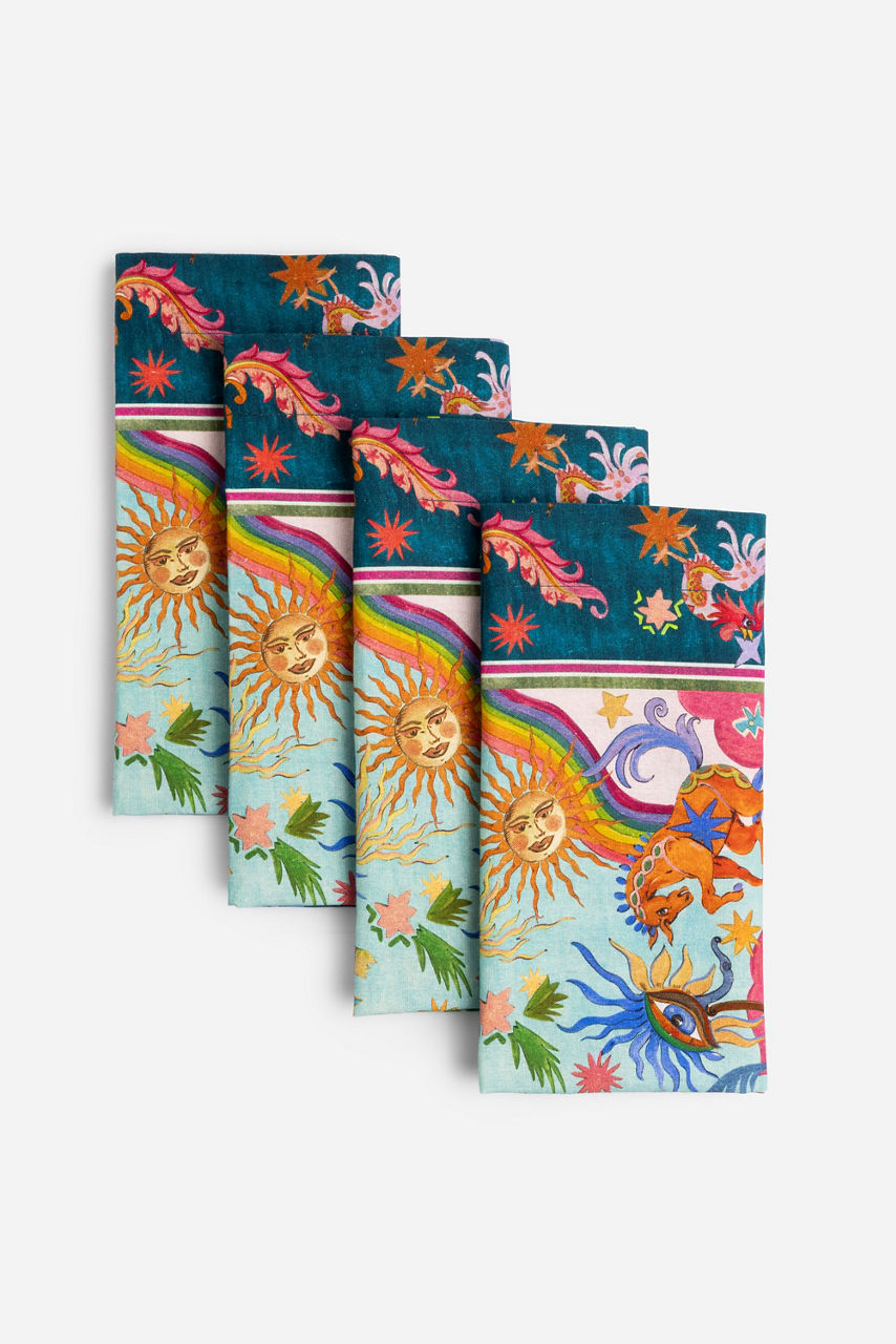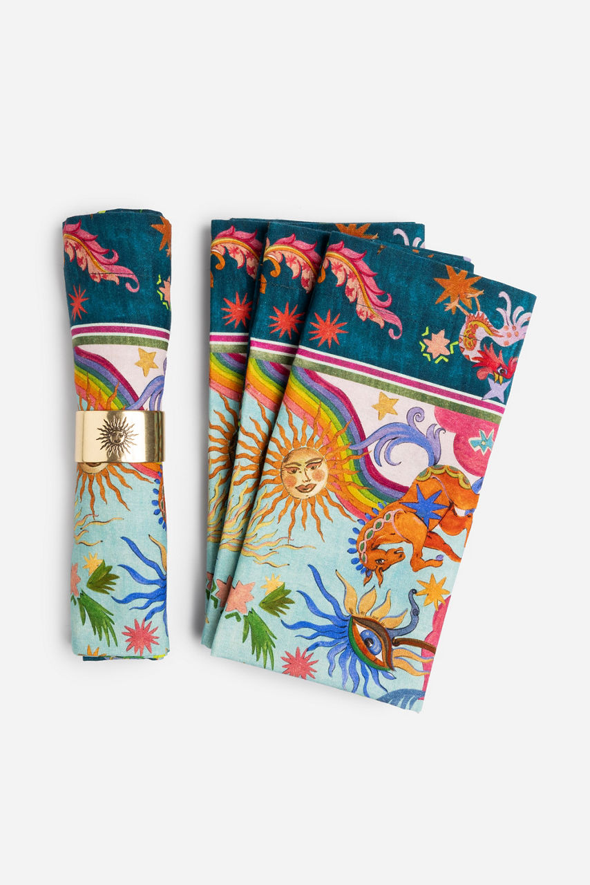 Crafted from a durable cotton and linen blend, the Kayla Napkins add a pop of color to your dining experience. Embellished with brilliant color and an intricate pattern, these napkins are finished with a contrasting border for visual interest. Pair with the Kayla Placemats and Napkin Rings for a coordinated casual dining set.