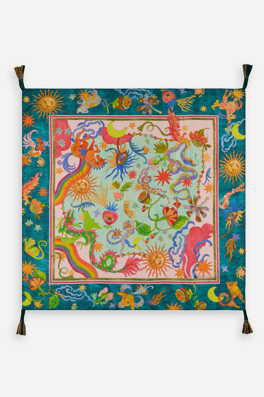 Crafted from luxurious 100% silk, the Kayla Silk Scarf is adorned with a vibrant pattern accented by a contrasting border. Thoughtfully designed to enhance any look, this square scarf is finished with tassels at each corner for added texture. Tie at the neck or at the handle of your favorite handbag for a pop of color.