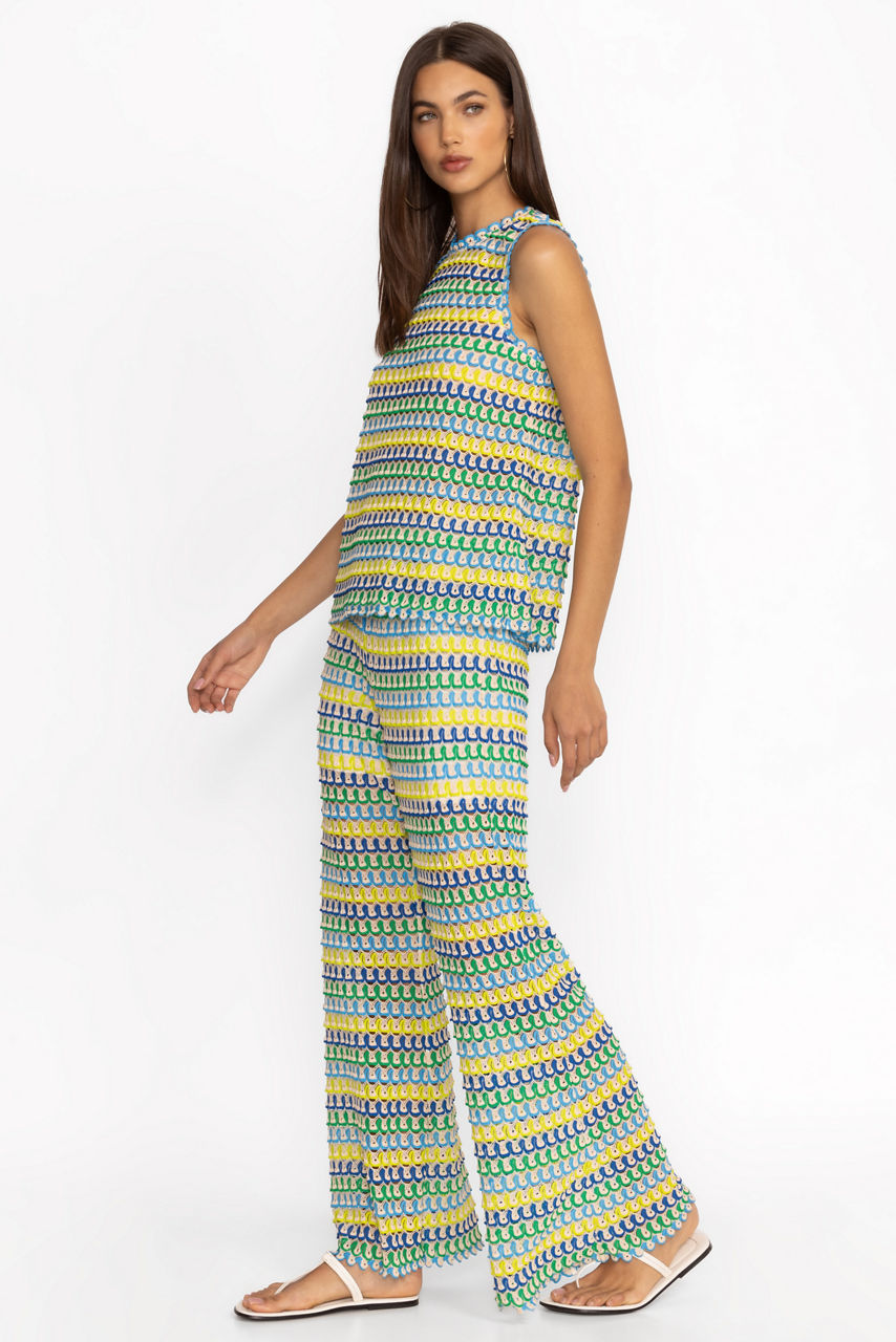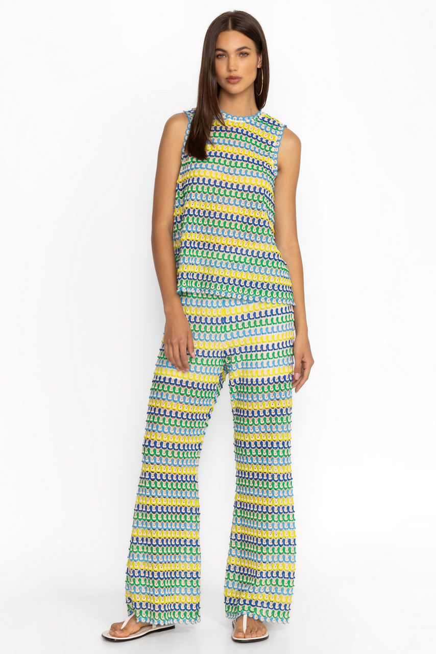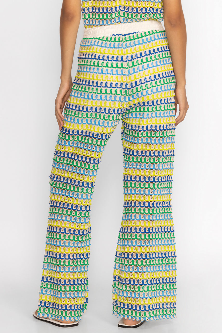 The Kaylani Pants are crafted from a lightweight fabric and are embellished with a bold linear pattern creating dimension and visual interest. Featuring an elastic waist and flared legs, these unique pants are lined with shorts for additional coverage. Pair with a solid tank and a flowing kimono for a vacation-worthy ensemble.