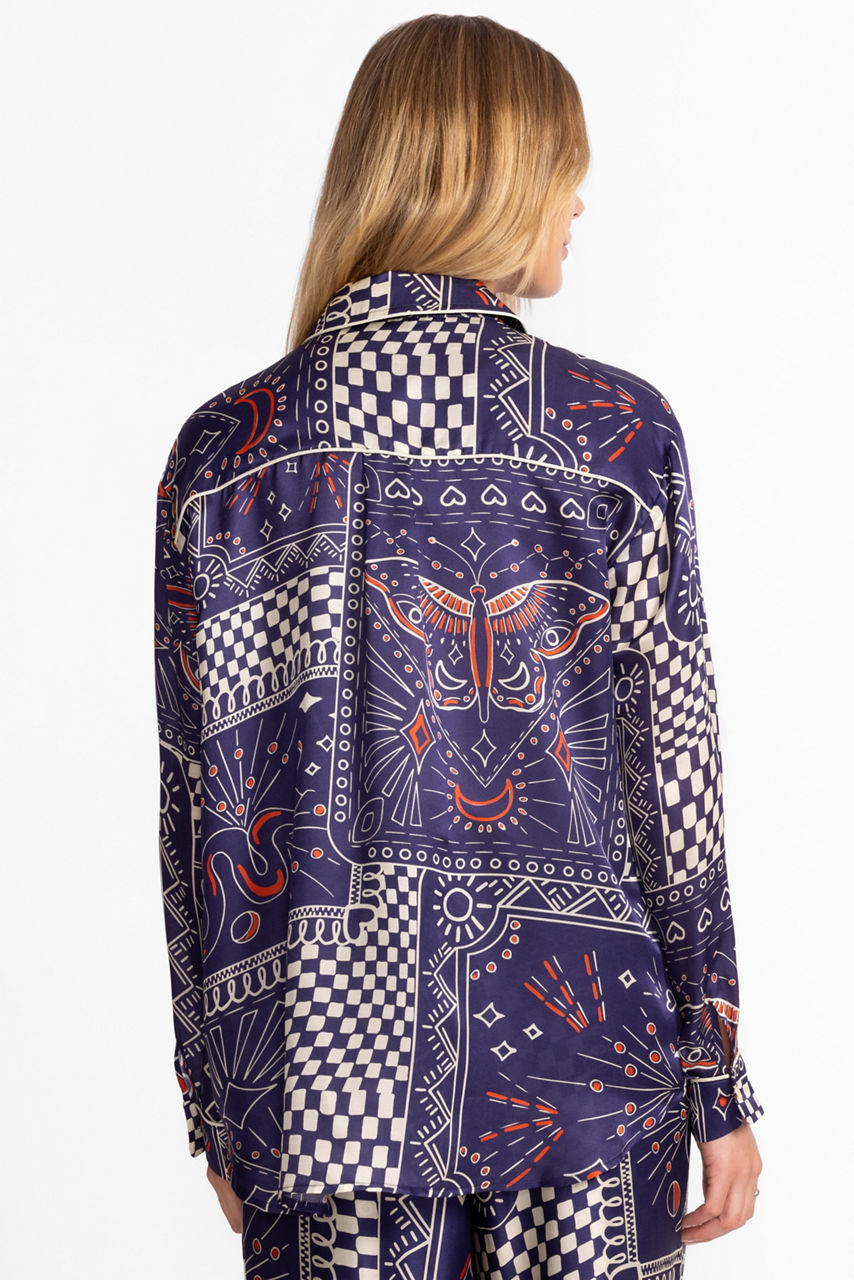 Crafted for a rich silk blend, the Oversized Shirt offers a vintage-inspired fit and pattern. Embellished with a unique patchwork pattern featuring a bold butterfly, this loose-fitting top is finished with pearl snap buttons at the front. Layer over black leggings and a white silk cami for a polished casual look with a lot of style.