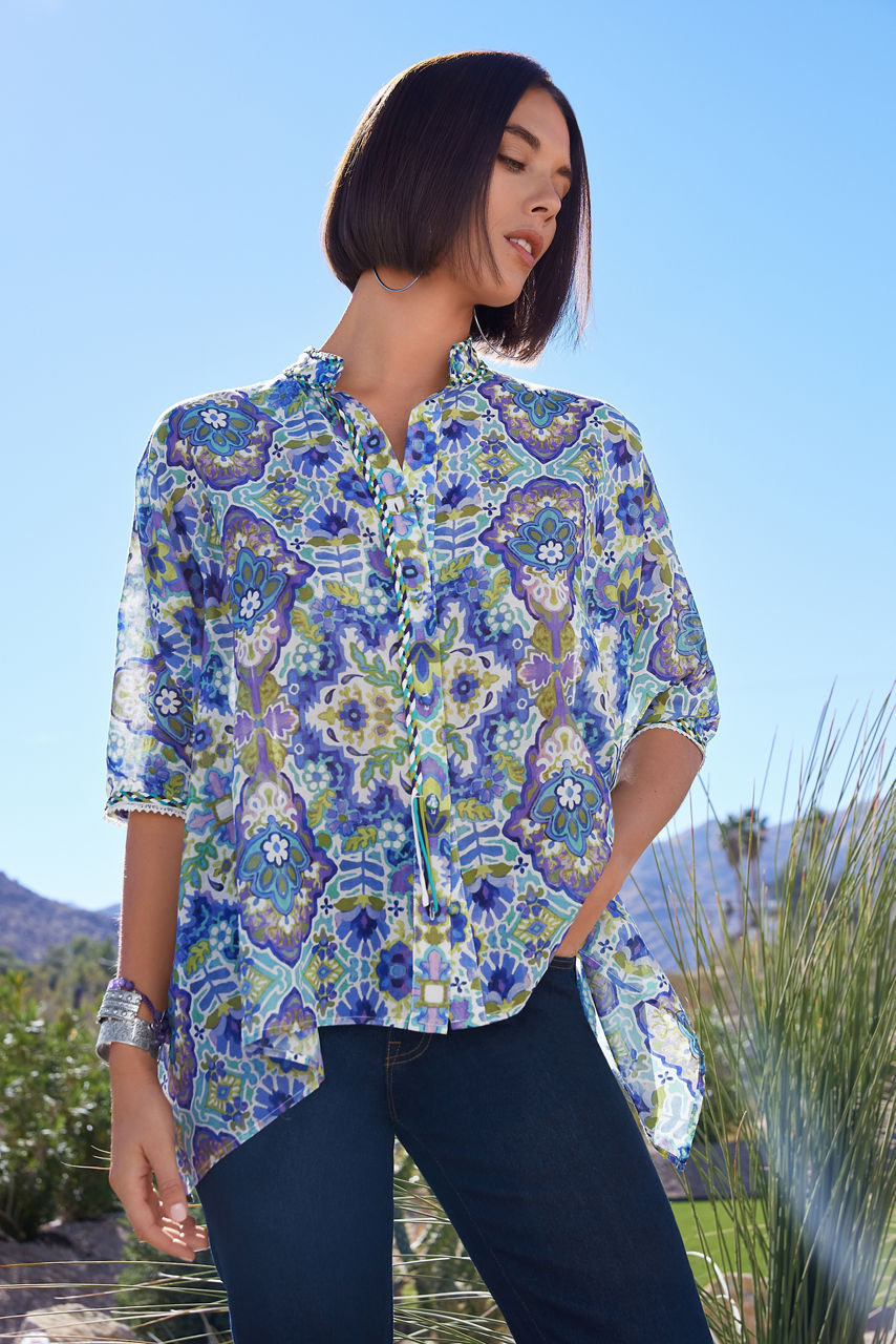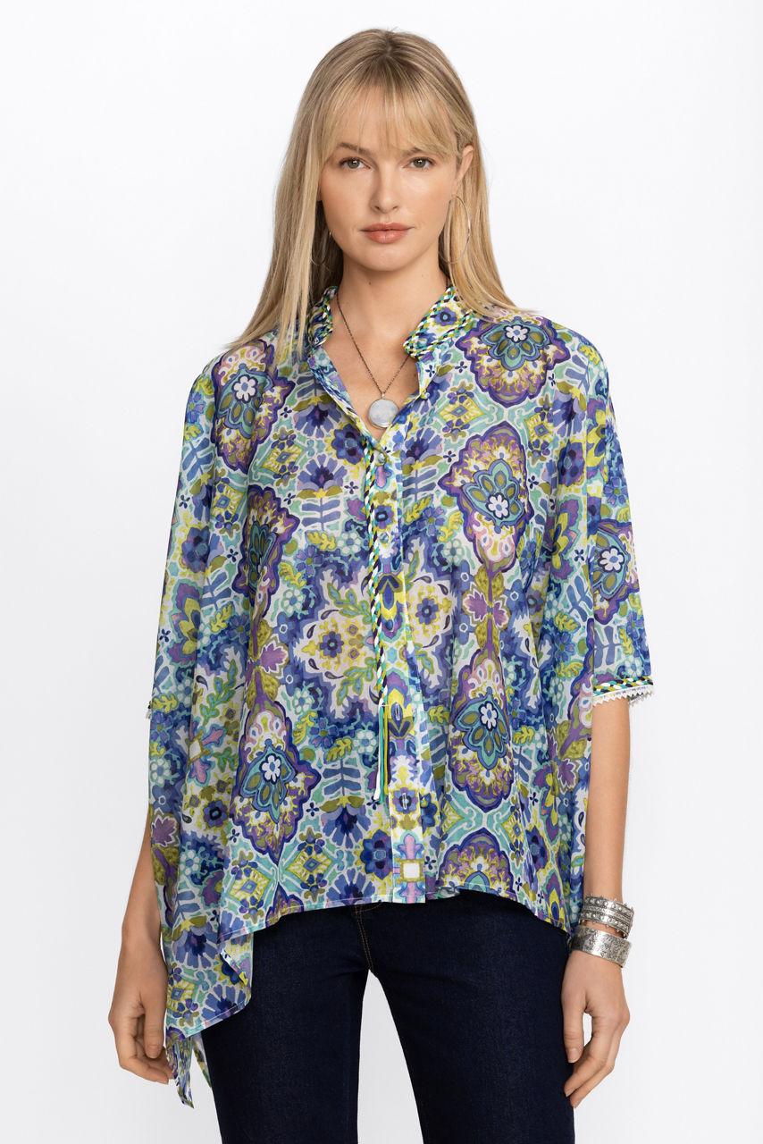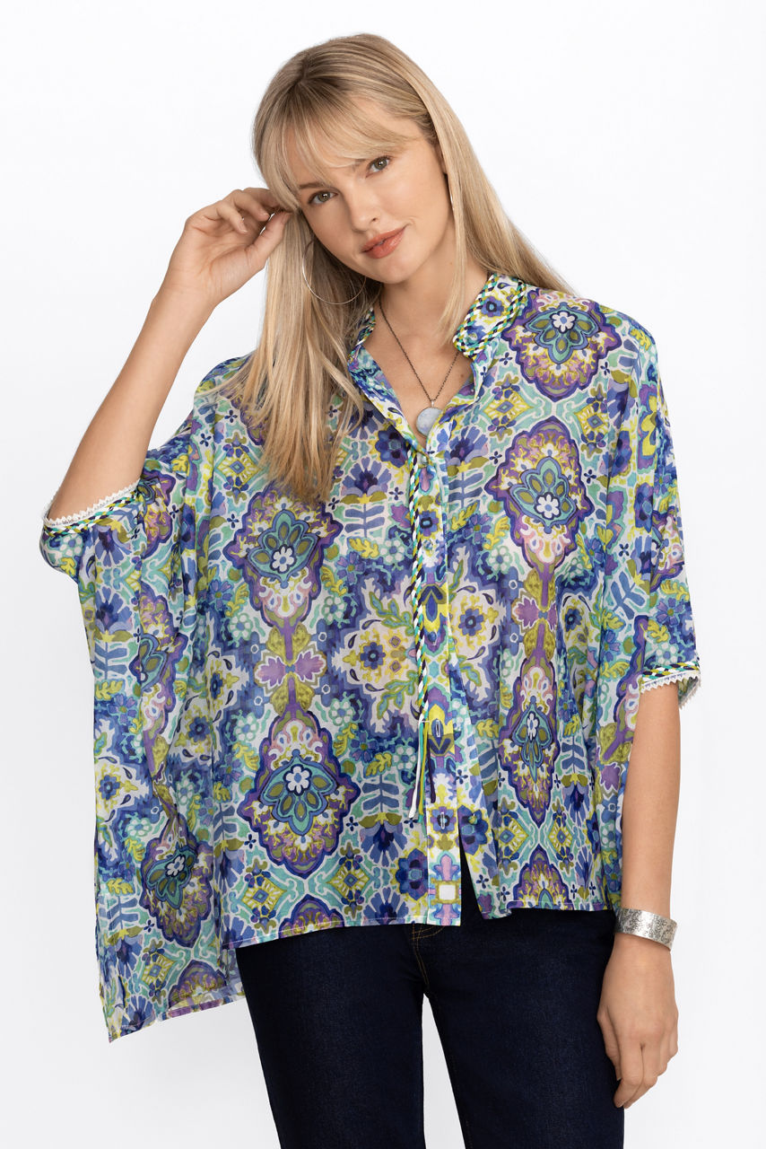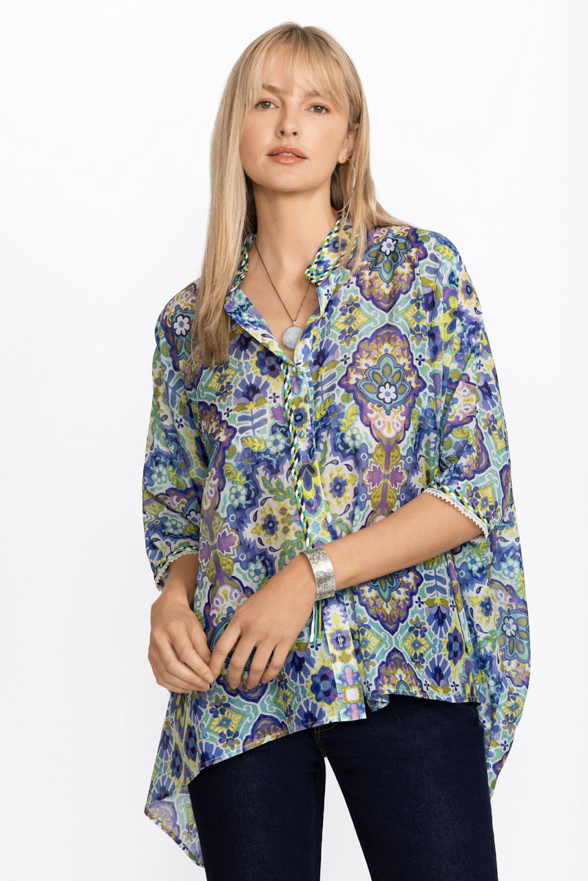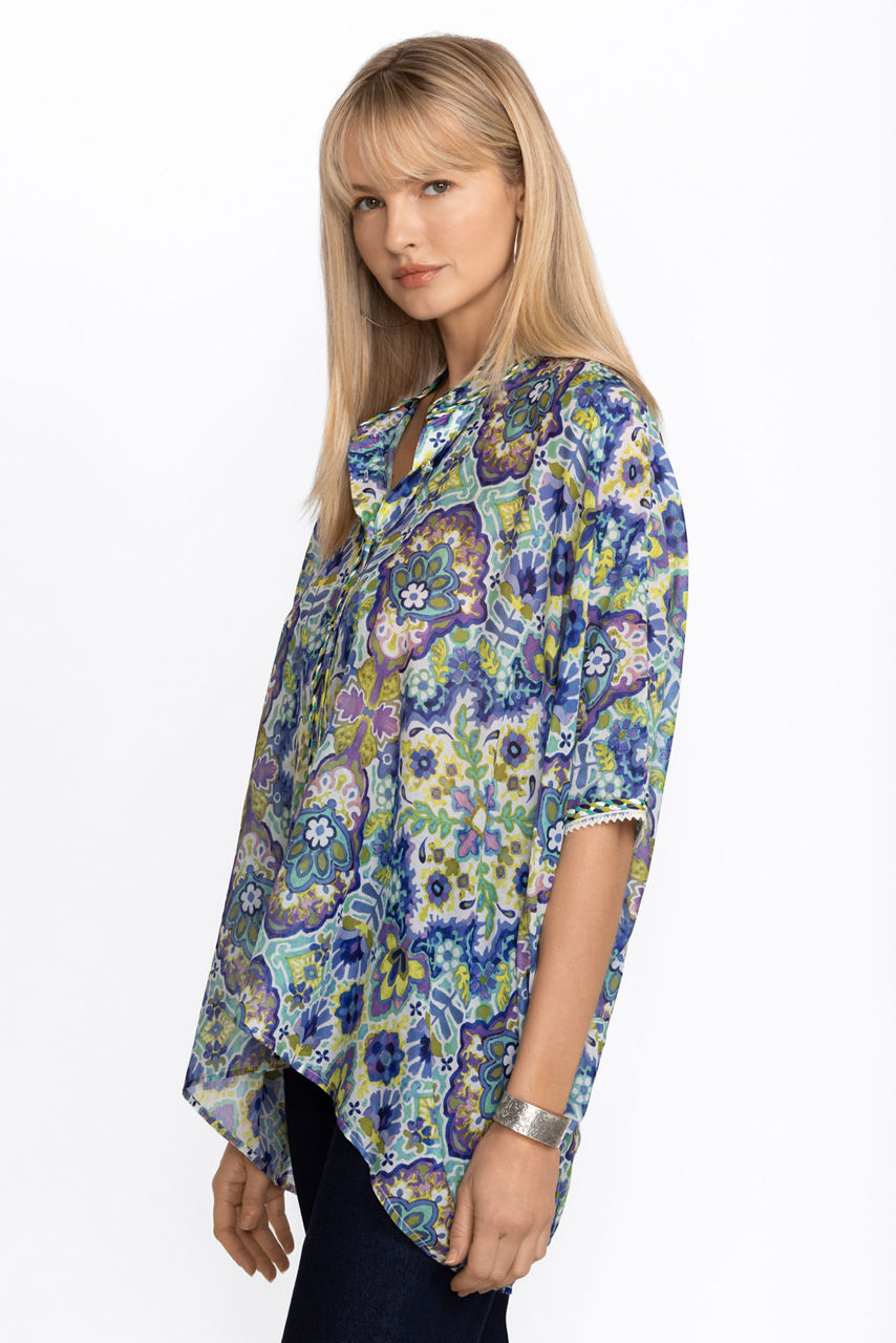 Crafted from a breezy silk and cotton blend, the Kiara Silk Blouse offers a brilliant kaleidoscope of color and pattern. Featuring a button front and a generous boxy cut allowing the fabric to flow freely and move as you move. Pair with fitted pants and ankle boots for a stylish girls' night out.