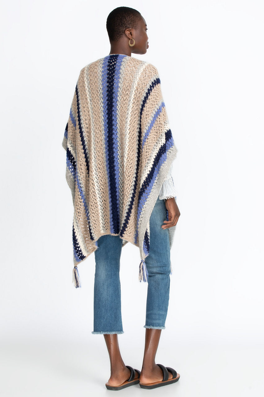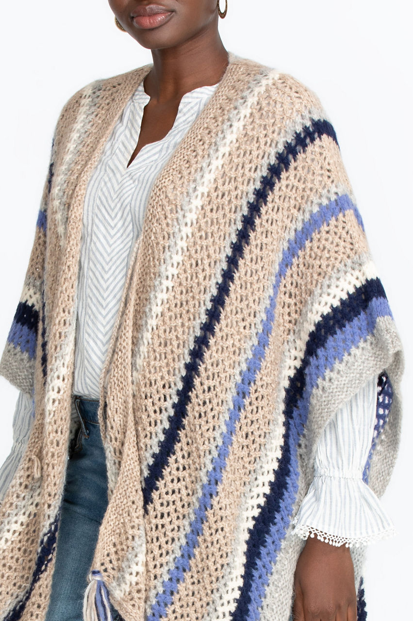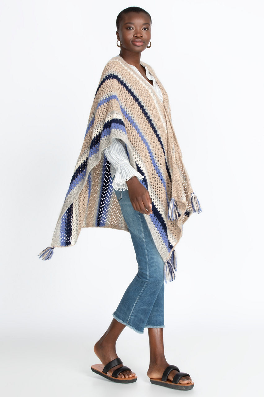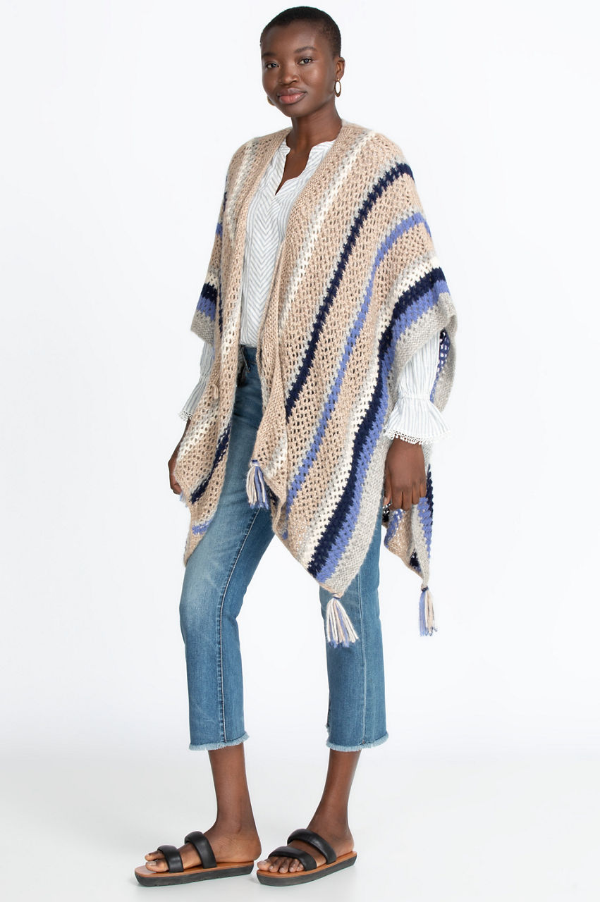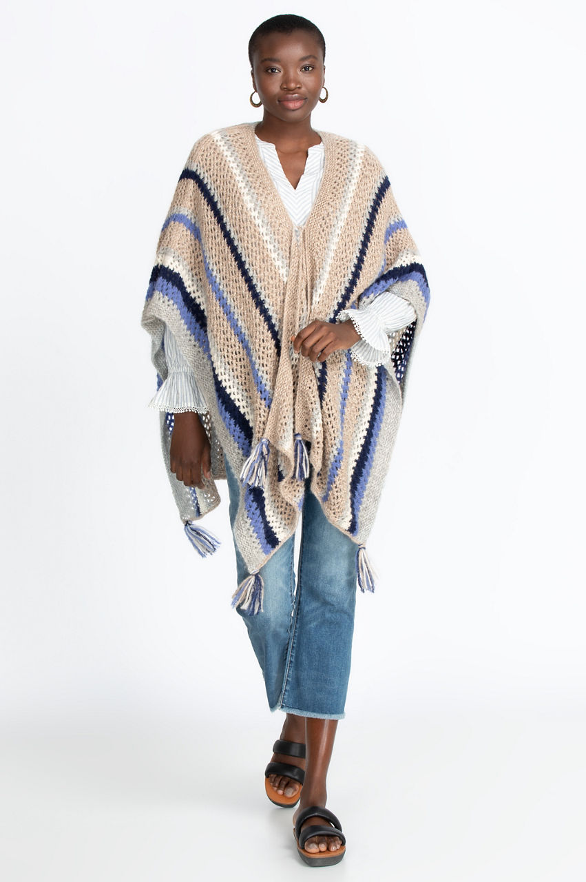 Whether you re looking for a comfortable piece or like playing with shapes and textures, the Kika Stripe Crochet Cape will make a gorgeous addition to your wardrobe. The chunky knit texture brings out the geometrical motifs of the cape for a stunning result. Wrap yourself in this comfortable cape to complete your favorite lounging outfits, or layer it over a neutral blouse and dark slacks for a sophisticated look.