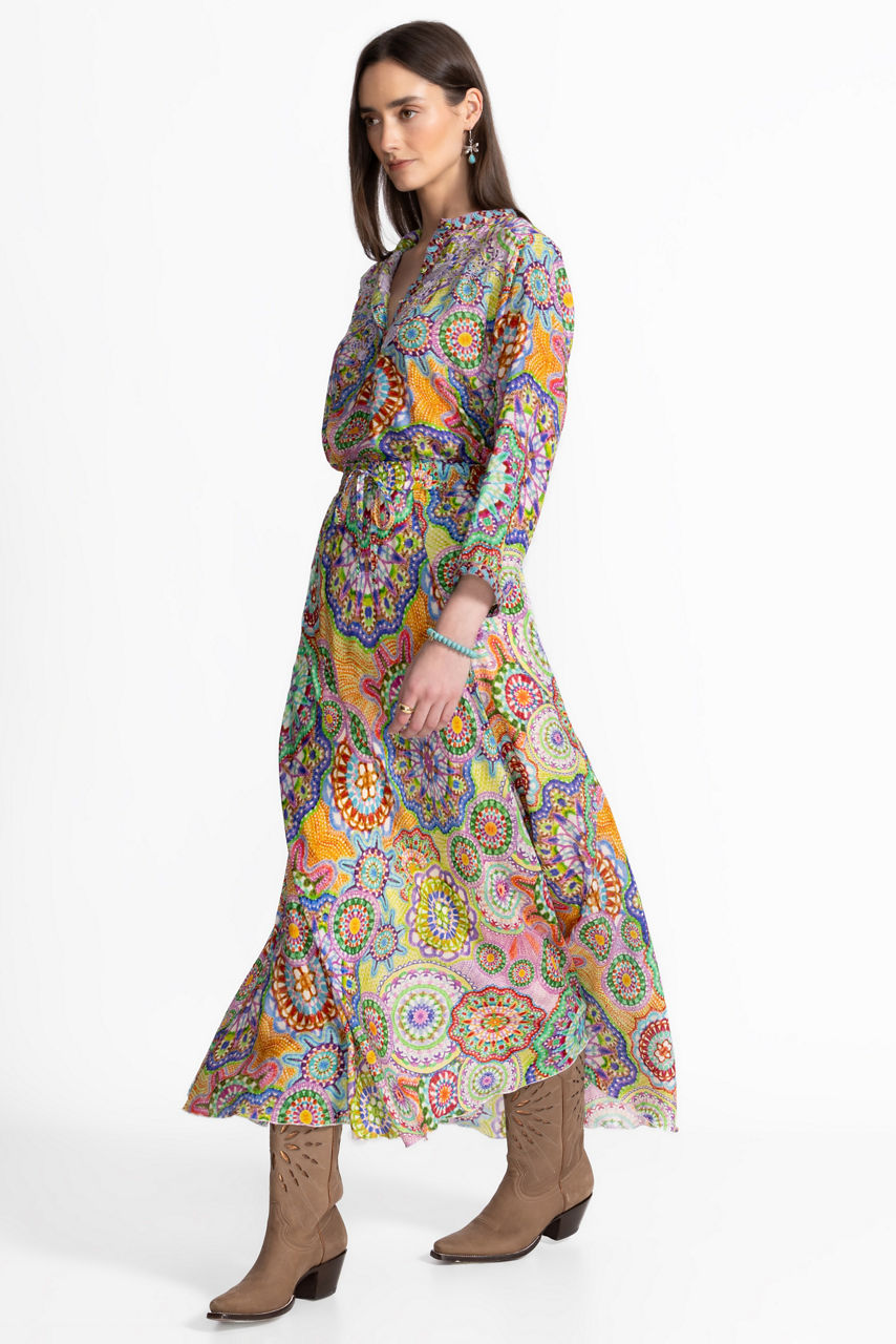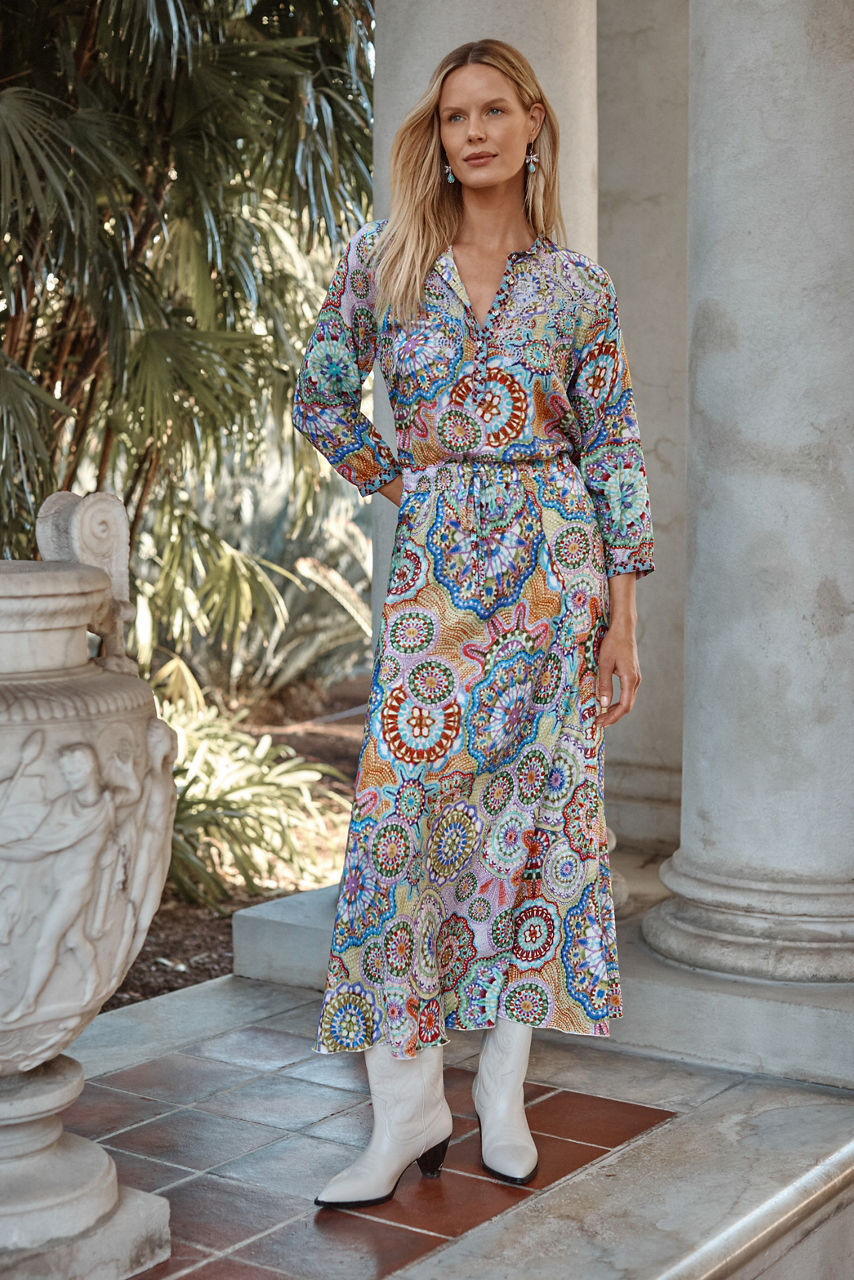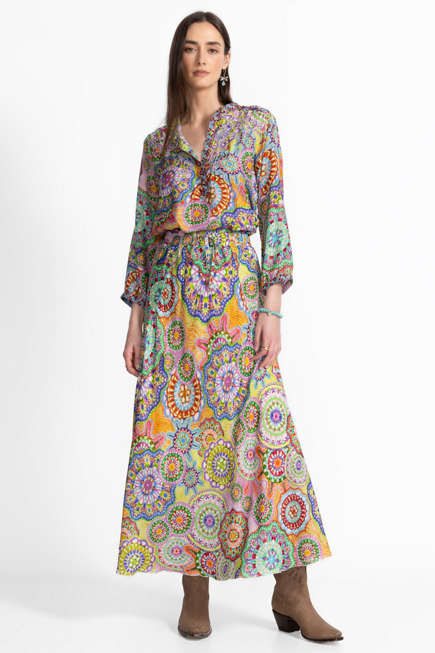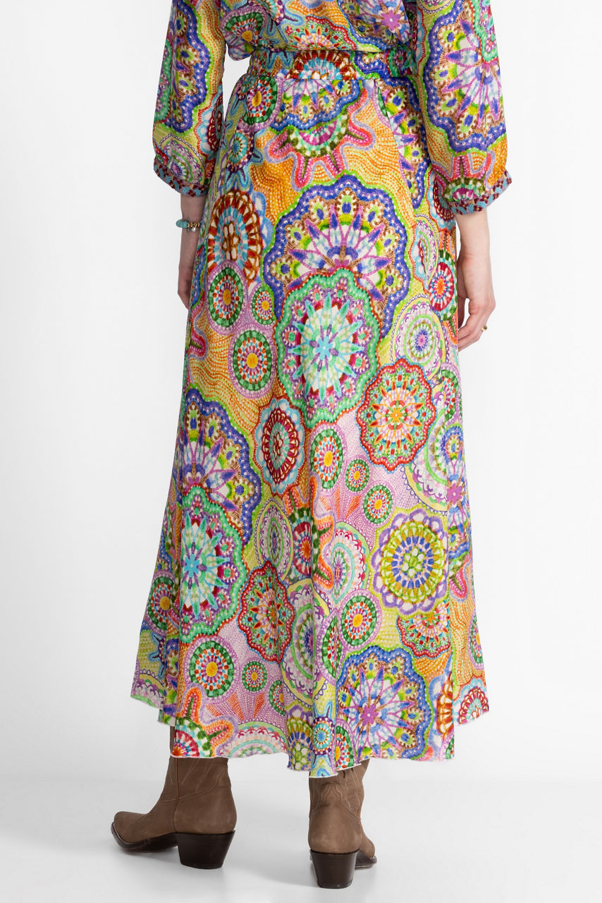 Embellished with stunning floral details in brilliant color, the Kiki Skirt is crafted from 100% flowing silk. Designed with an elastic waist with a drawstring for a customizable fit, this bias skirt offers a smooth drape that moves as you move. Pair with a silk cami and a denim jacket for a fresh casual ensemble.
