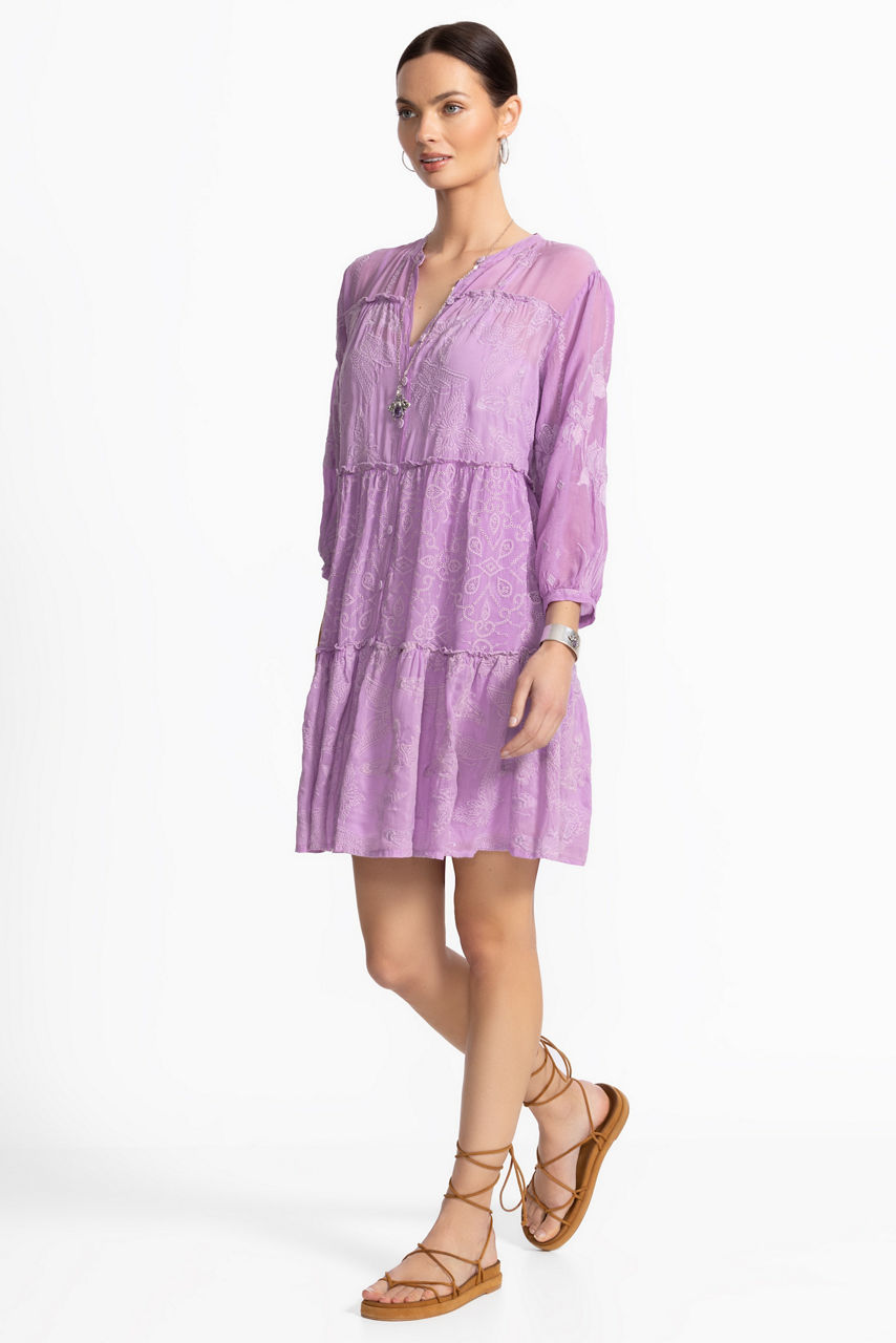 Brilliantly embellished with a subtle tone-on-tone pattern, the Kimberly Dress creates a classic feminine silhouette. Crafted from a lightweight breathable fabric, this stunning slip-lined dress features a classic button-front and 3/4 Bishop sleeves and is finished with a tiered skirt and pockets. Pair with a coordinating clutch and strappy heels for an elegant daytime event.