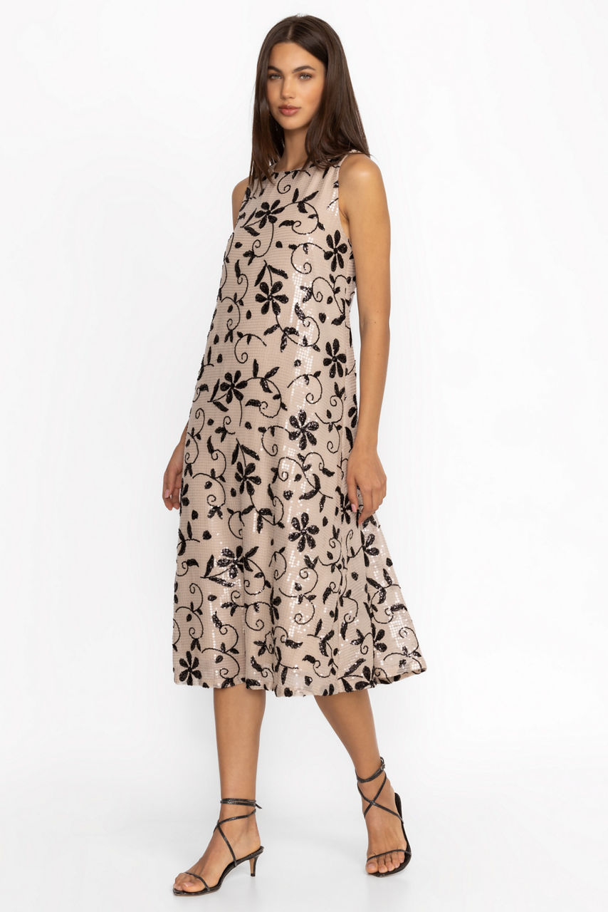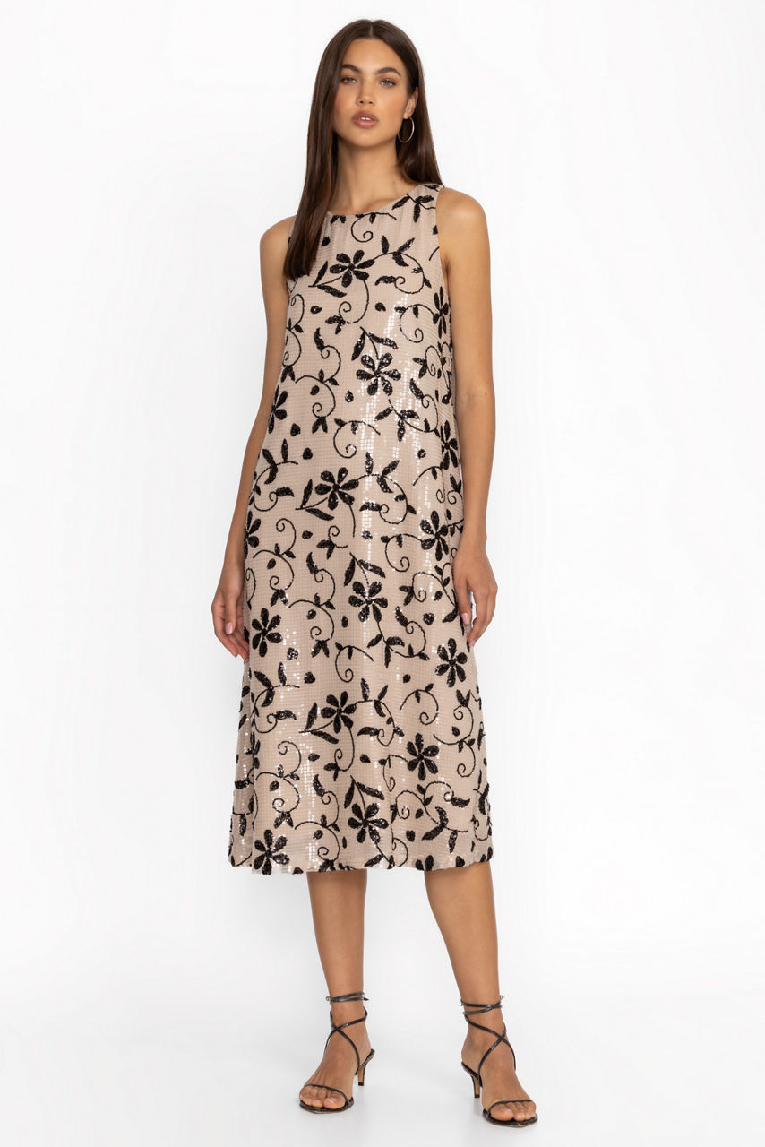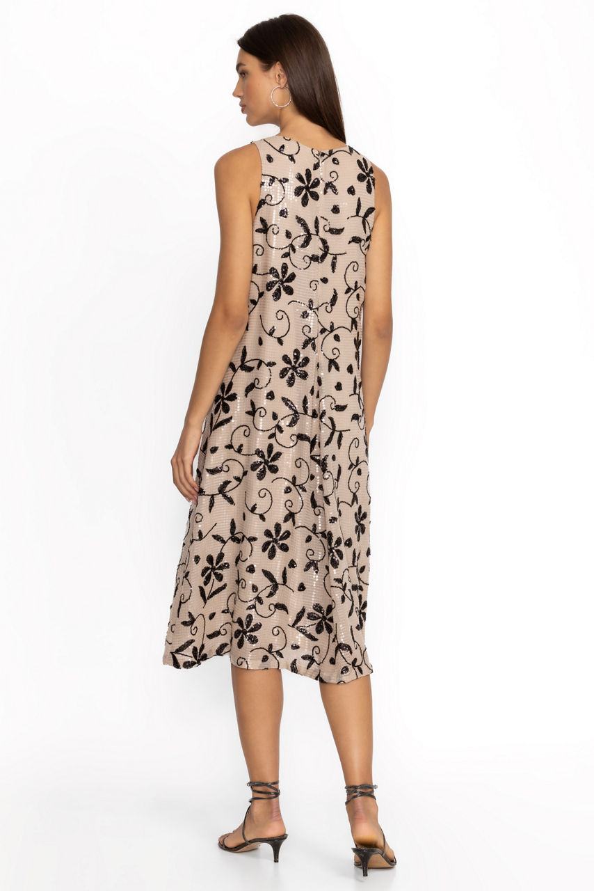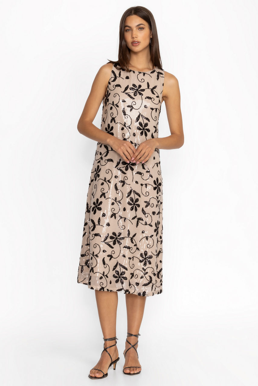 Crafted with elegant floral accents, the Kimmie Floral Dress is offered in rich earthy hues. Featuring a high rounded neckline with a zipper at the back, this sleeveless shift dress is finished with a flowing full-length skirt. Pair with black strappy sandals and a raffia back for a dinner out while on vacation.