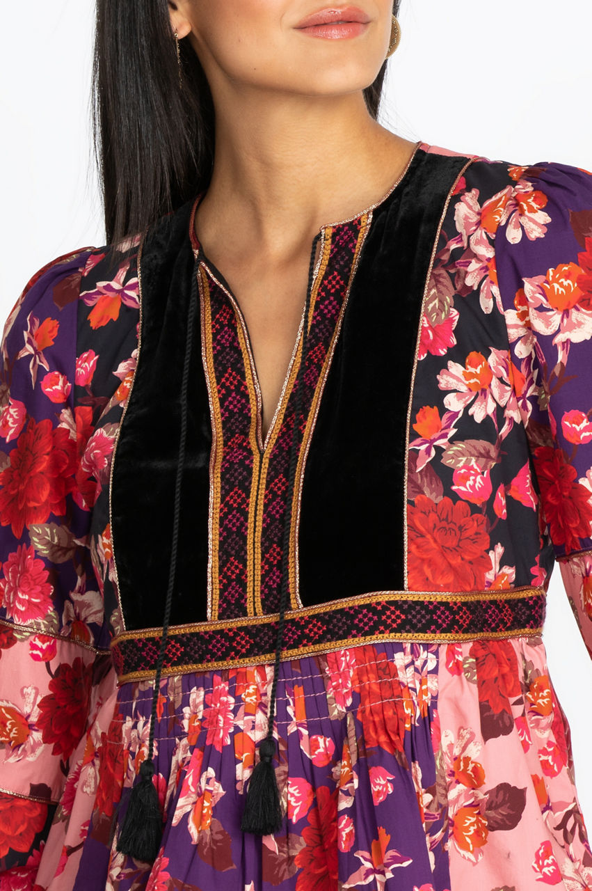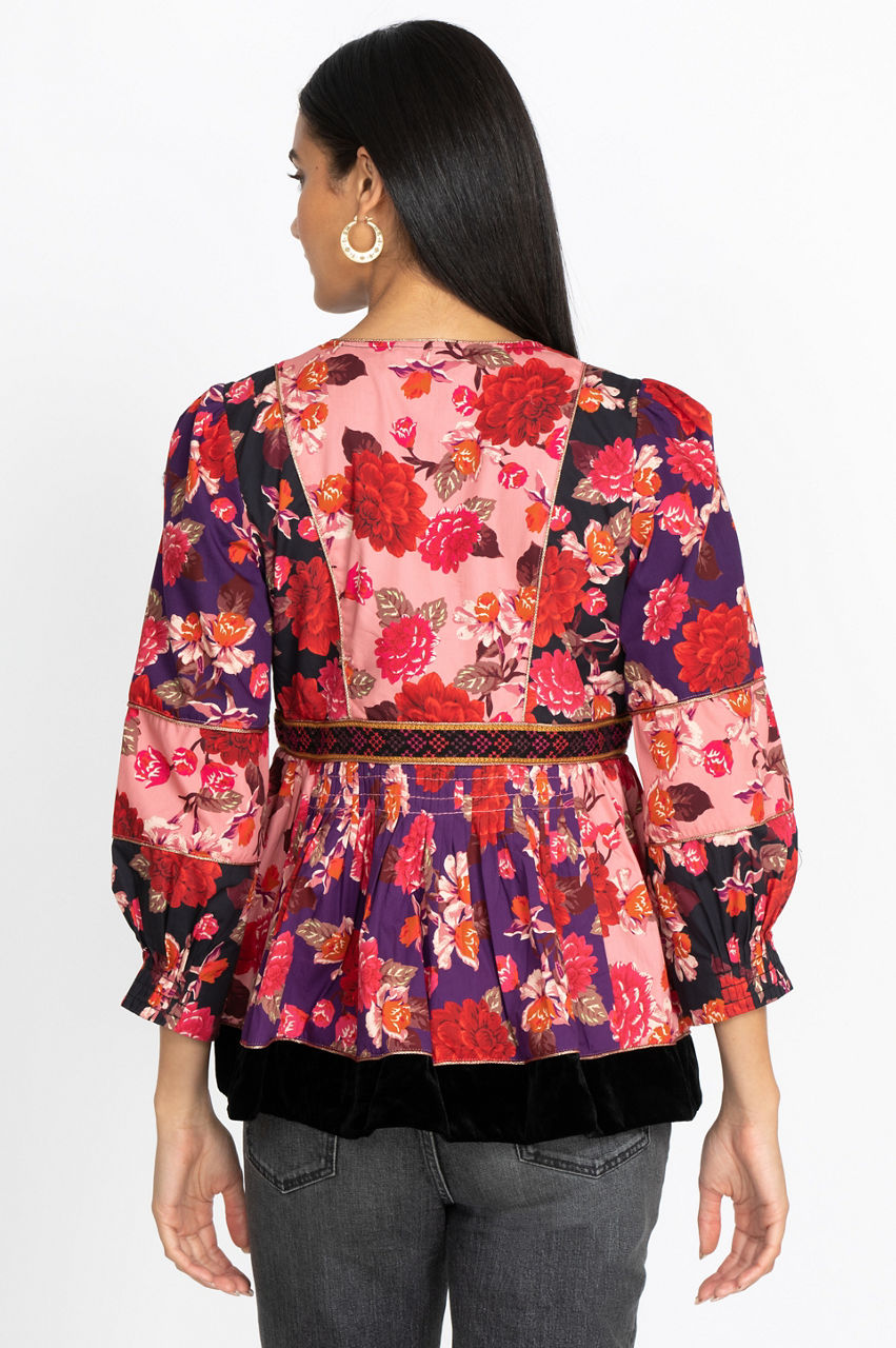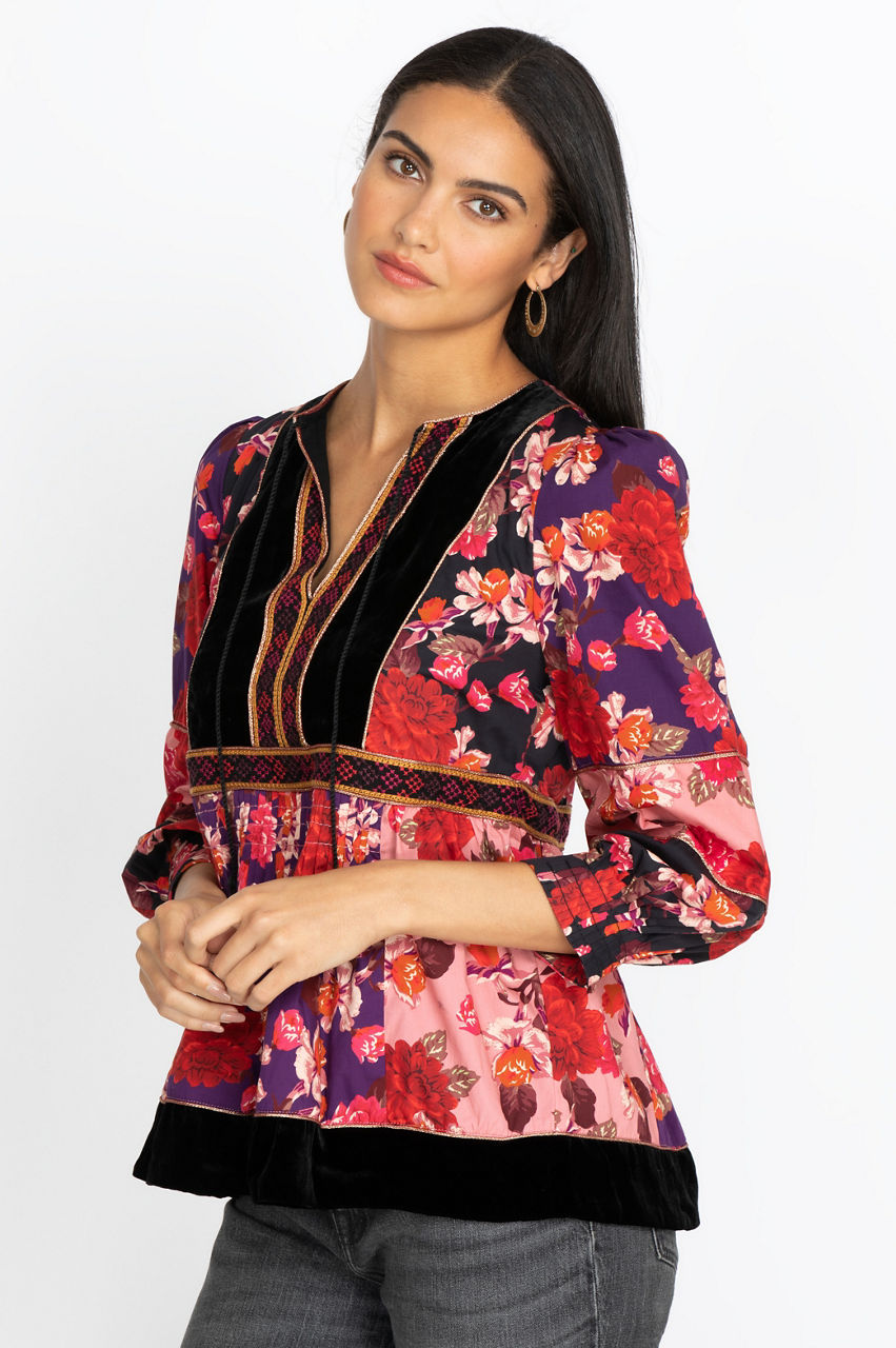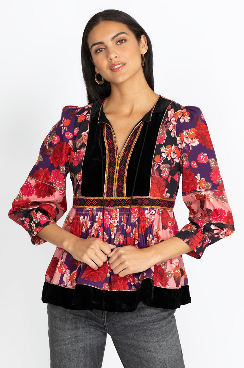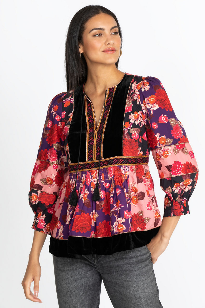 The Kimmy Peasant Top is an artisan-inspired piece with its floral and geometrical motifs, tassel detail, and a flowy cut. It s an elegant top that introduces vibrant contrast as well as a flattering cut with its bishop sleeves and V-neck. Emphasize the boho-chic feel of this blouse by wearing it with a statement necklace, some bootcut jeans, and a fringed handbag.