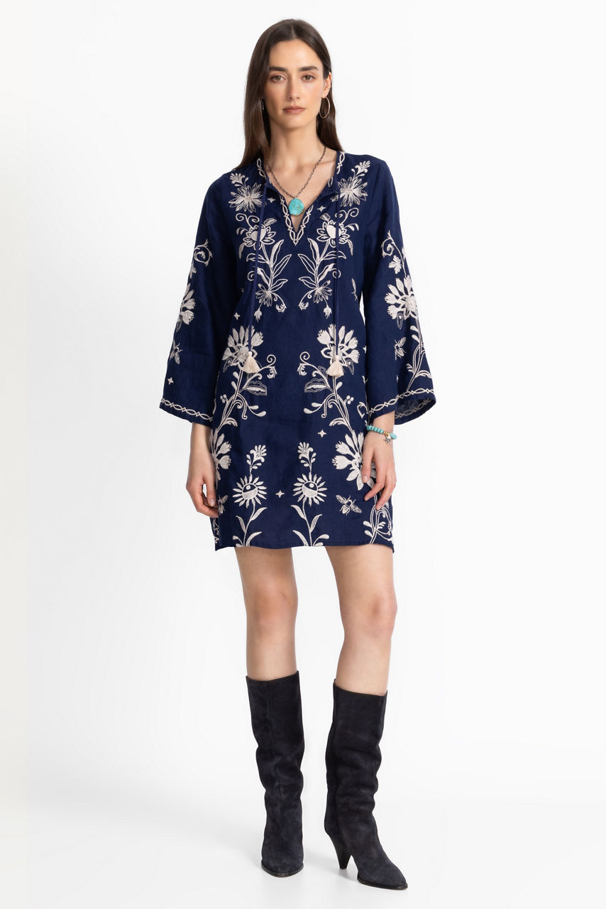 The Kimono Sleeve Relaxed Dress is crafted from 100% breathable linen and is perfect for the warmest days. Featuring a split V-neckline embellished with decorative tassels, this dress offers a relaxed silhouette and is finished with intricate embroidered detailing for a lovely finished look. Pair with sandals and coordinating cross-body bag for an easy vacation look.