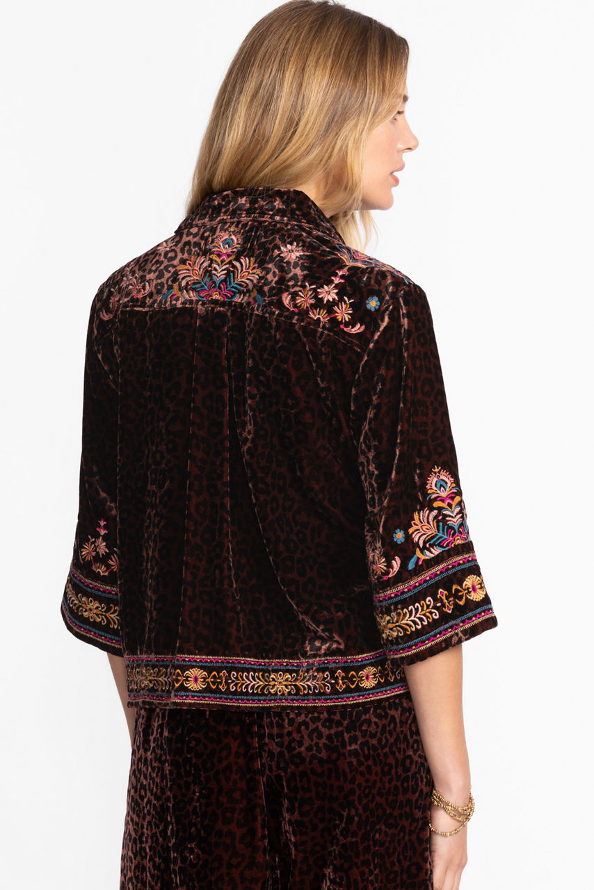Crafted from a lightweight, flowing fabric, the Brandi Kimono Sleeve Shirt is embellished with an ornate pattern in vibrant color. Designed with a collared button-front and wide kimono sleeves, this rich shirt is finished with intricate embroidered detailing. Pair with palazzo pants and easy flat sandals for a resort-inspired look.