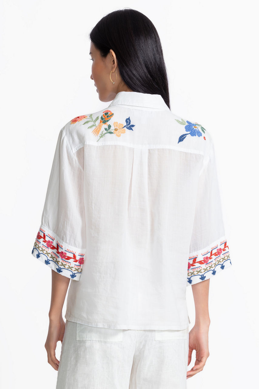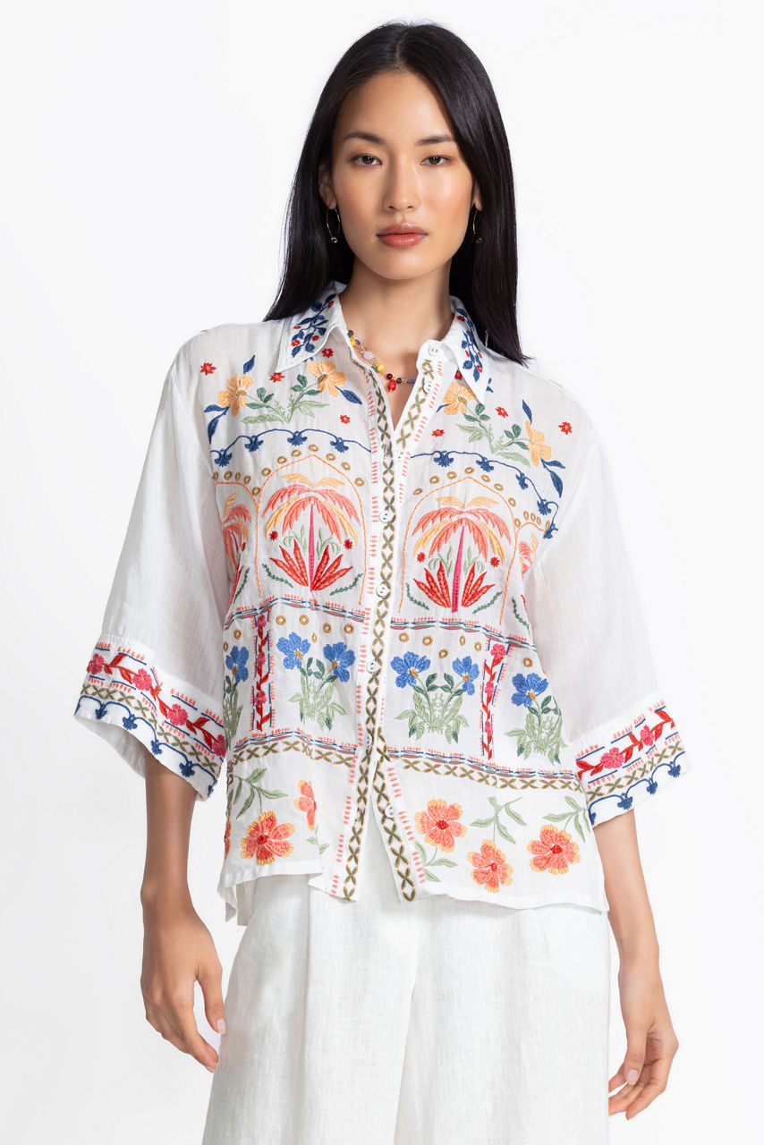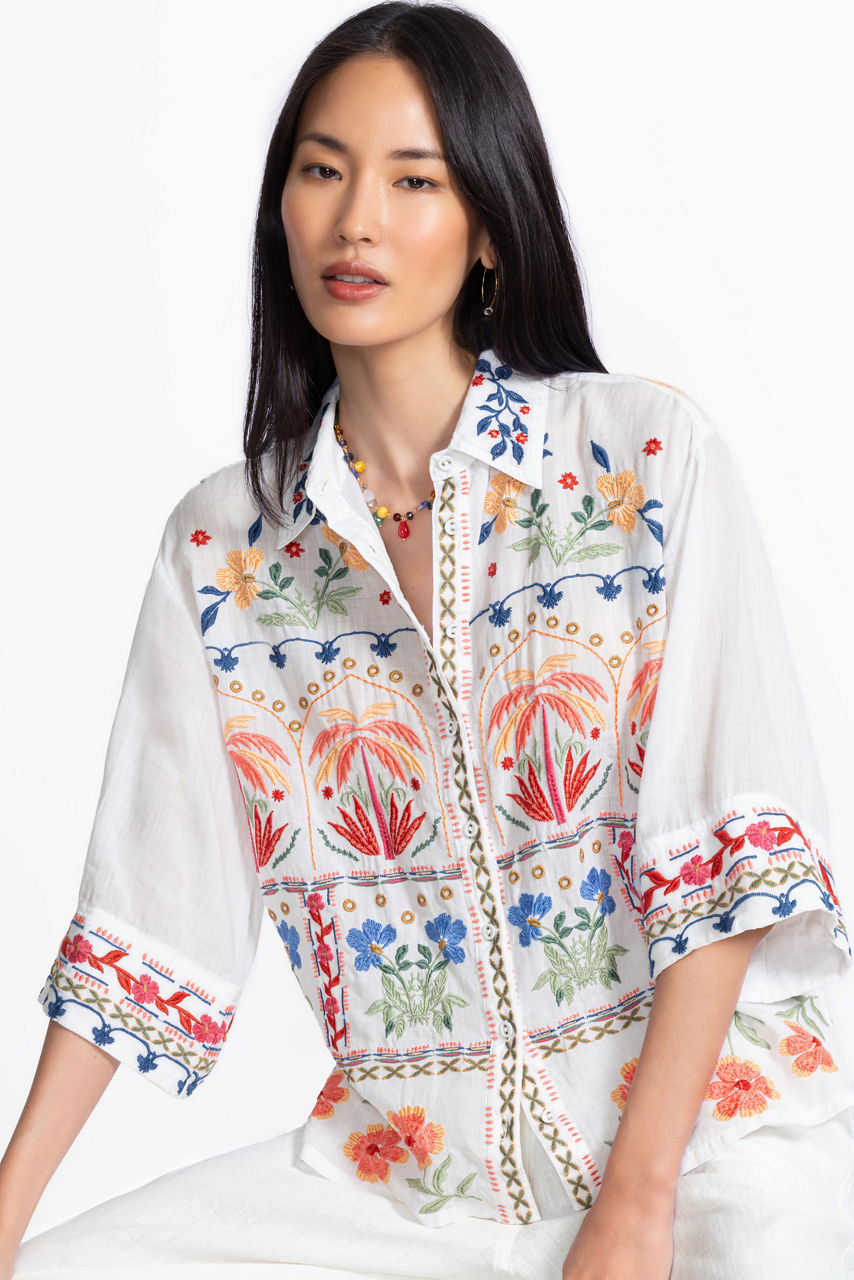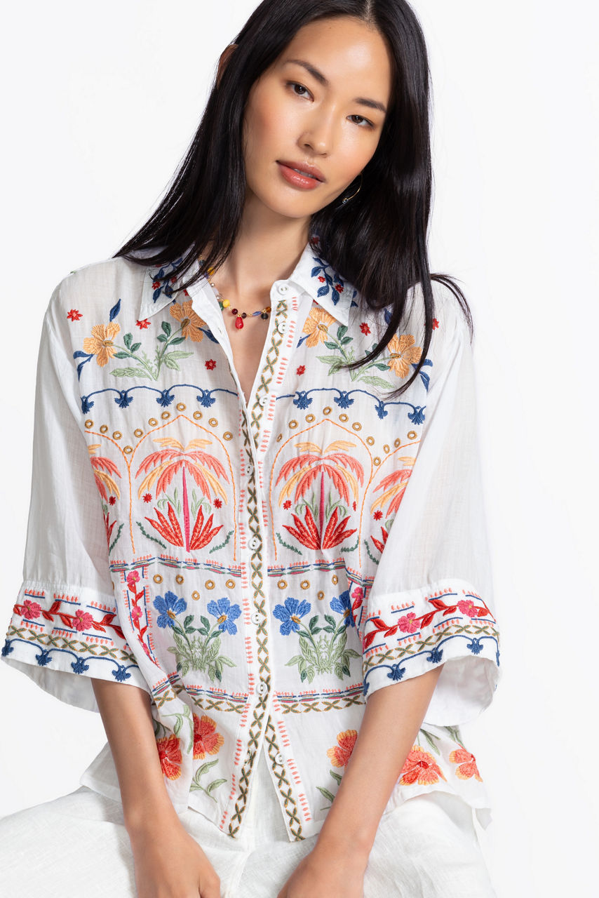 Featuring stunning embroidered details and vibrant patterns, the Kimono Sleeve Shirt is crafted from a lightweight flowing fabric. Designed with a classic collared button-front, this modern top is enhanced with wide kimono-style sleeves and a box pleat at the back for a relaxed fit and silhouette. Pair with classic jeans and flats for a polished casual look.