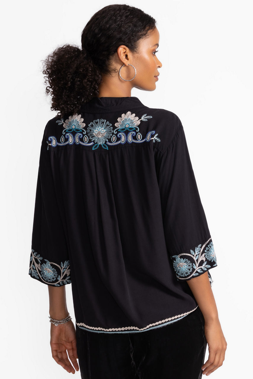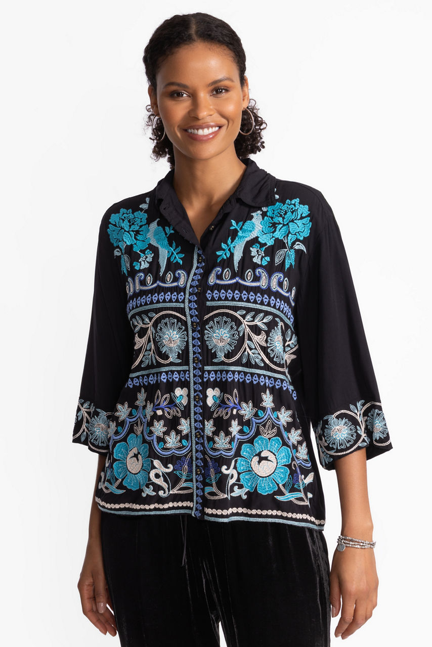 Crafted from a lightweight, flowing fabric, the Kikio Kimono Sleeve Shirt is embellished with an ornate pattern in vibrant color. Designed with a collared button-front and wide kimono sleeves, this rich shirt is finished with intricate embroidered detailing. Pair with palazzo pants and easy flat sandals for a resort-inspired look.