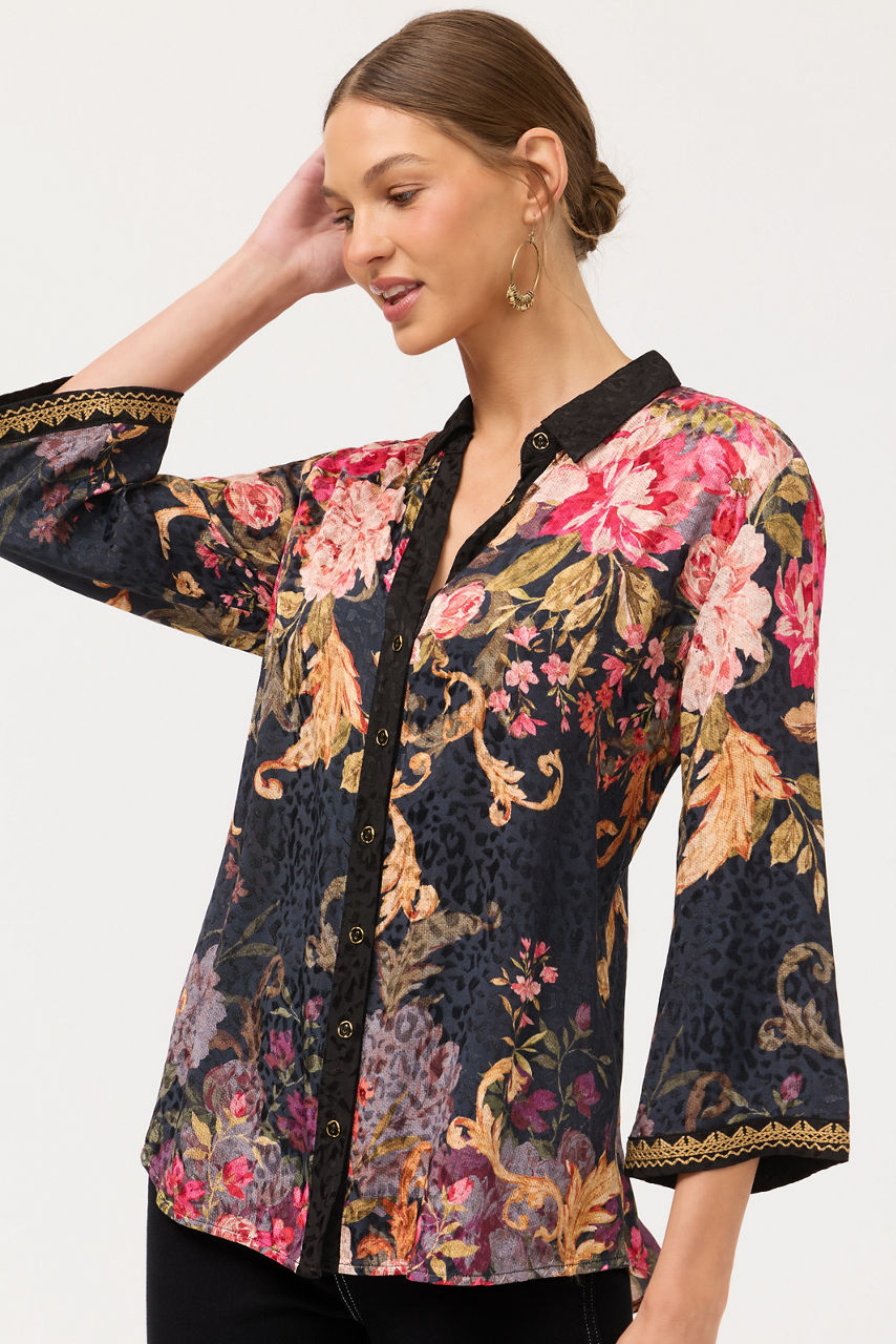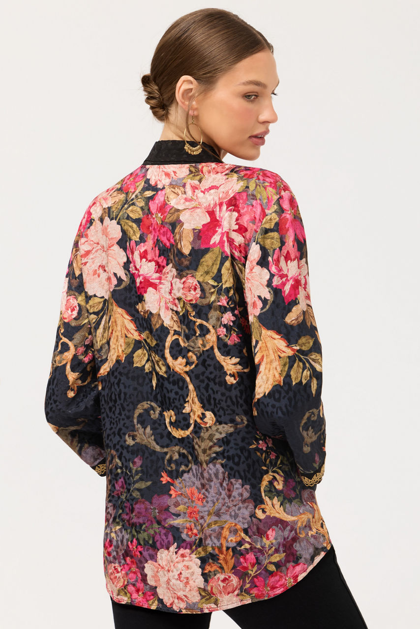 Adorned with a bold floral motif with rich color, the Kimono Sleeve Shirt offers a fresh take on a classic button-down. Featuring a contrasting collared button-front and wide kimono sleeves, this unique blouse is finished with embroidered detailing at the cuffs and a gently curved hemline. Pair with a pencil skirt and classic pumps for a modern workday look.
