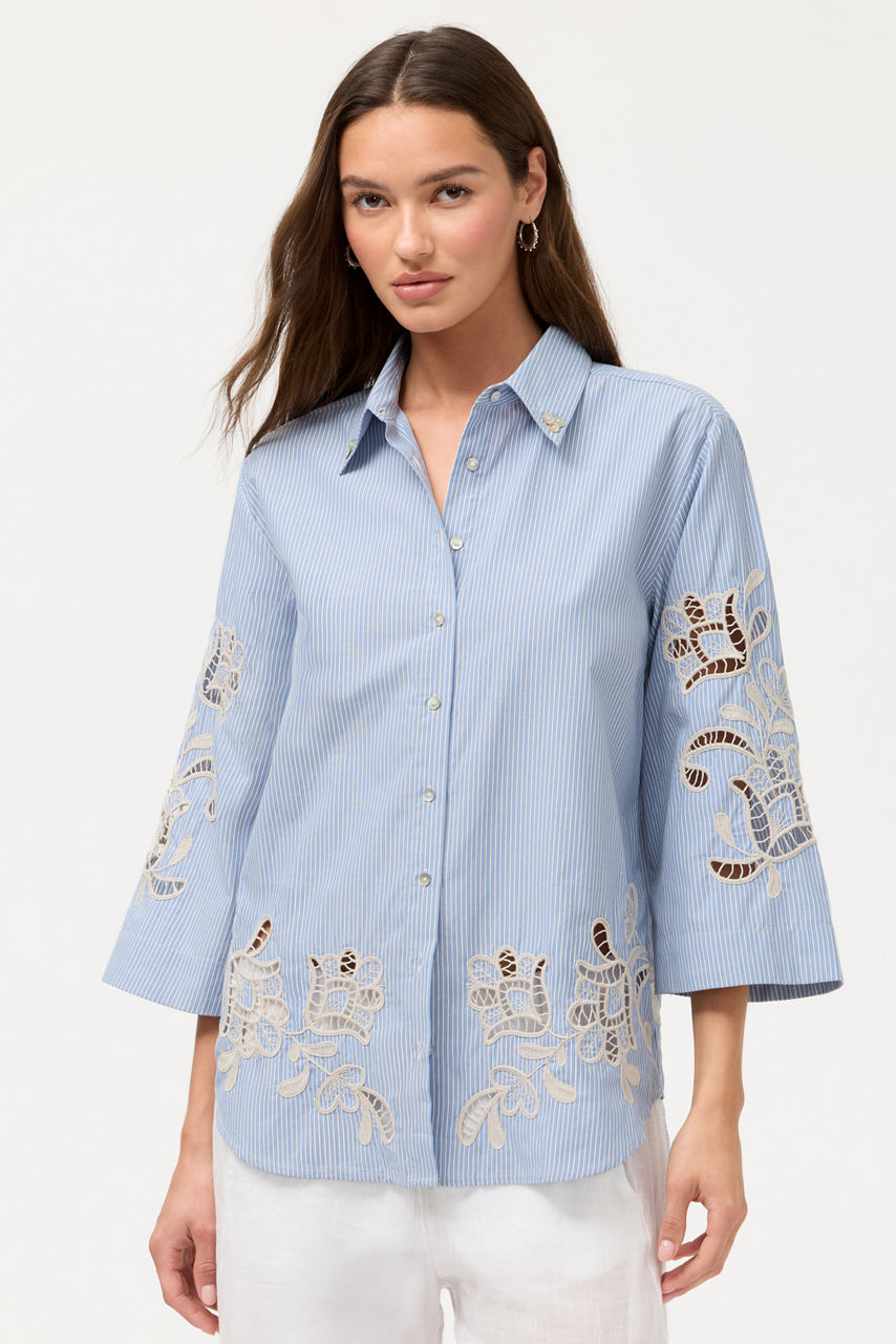 The Christine Eyelet Kimono Sleeve Shirt thoughtfully combines classic shirting with the elegance of a traditional kimono. Designed with a classic collared button front, this unique shirt features wide kimono sleeves and an intricate floral eyelet embroidery for a distinctly feminine touch. Pair with classic white chinos and easy slide sandals for a modern take on casual dressing.