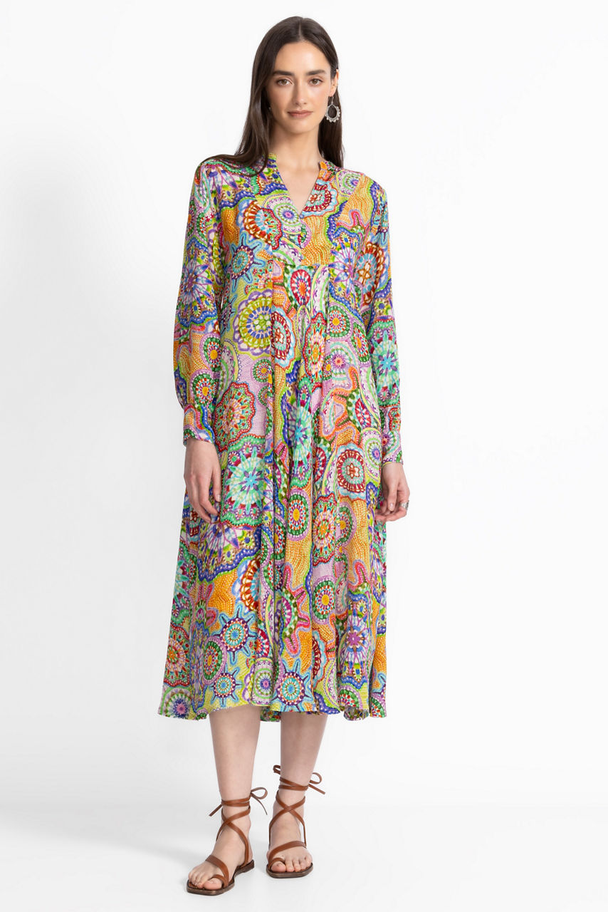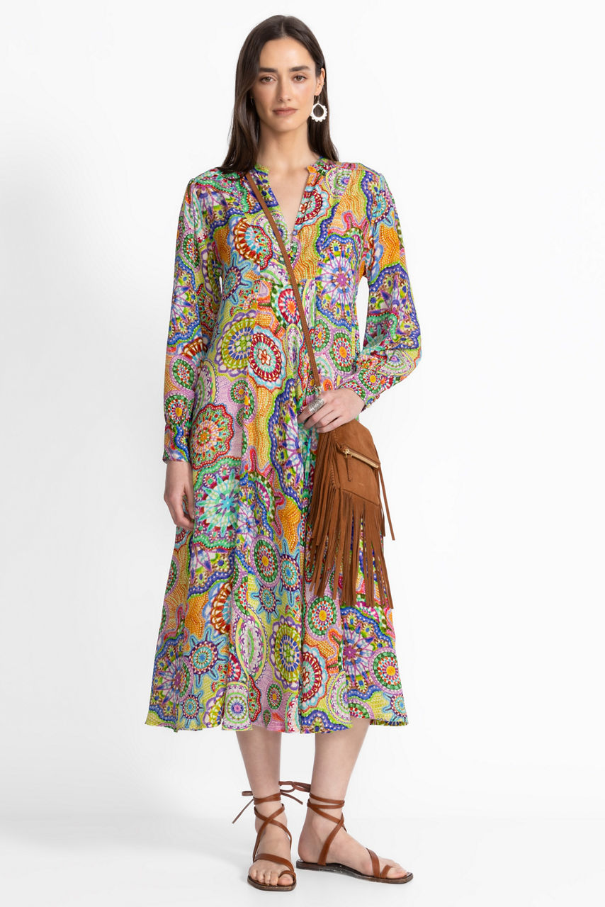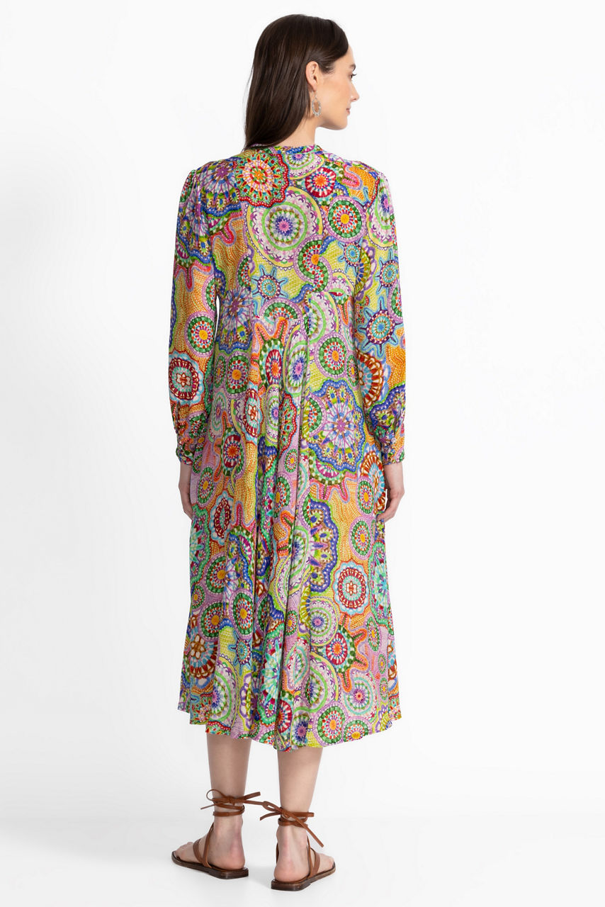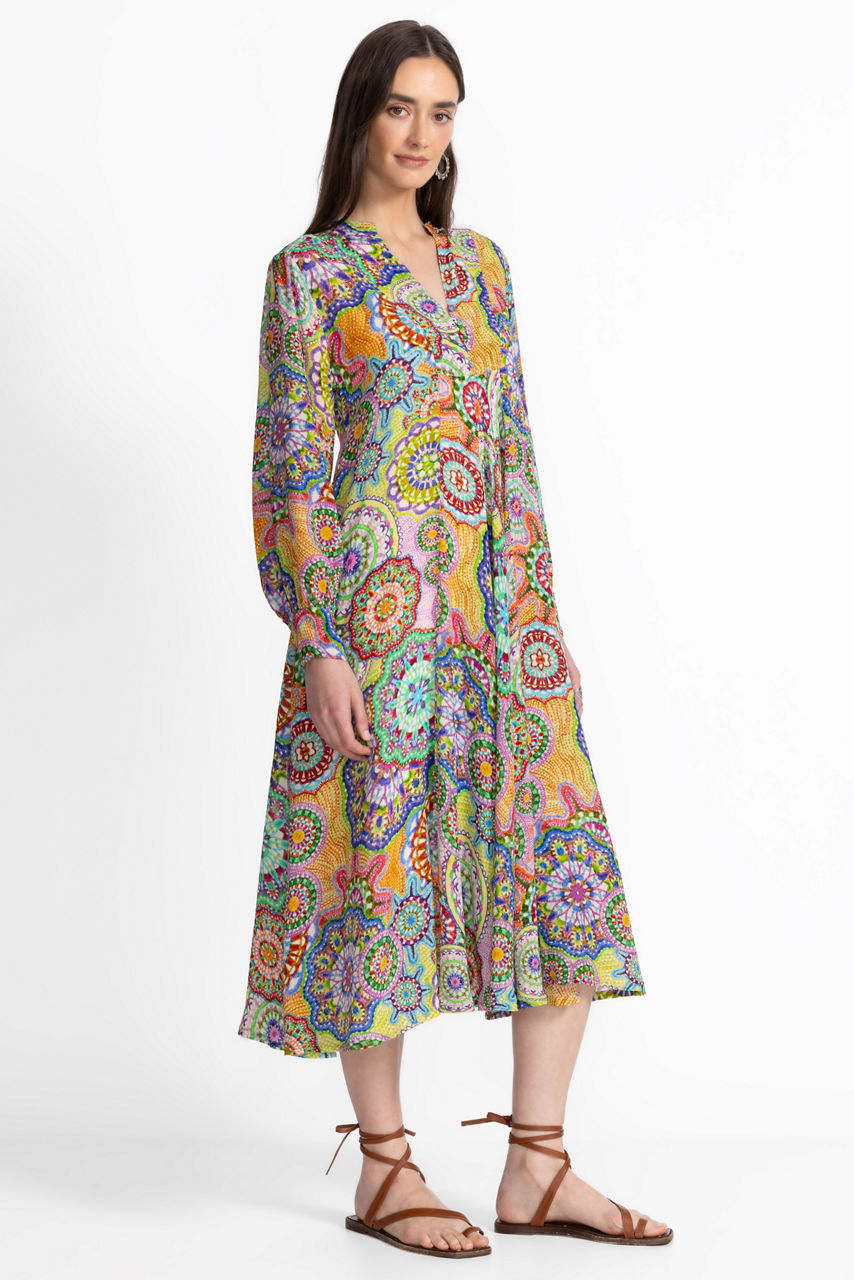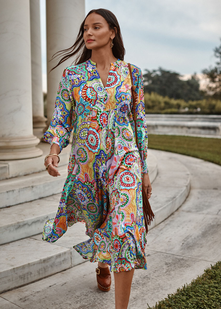 Crafted from 100% sumptuous silk, the Kionah Dress is adorned with vibrant color and an eclectic pattern. This unique, retro-inspired dress features a split V-neckline with a button and loop closure and is finished with a slip lining and gathers at the sleeves. Pair with a wide-brim sun hat and strappy sandals for a resort-ready look.
