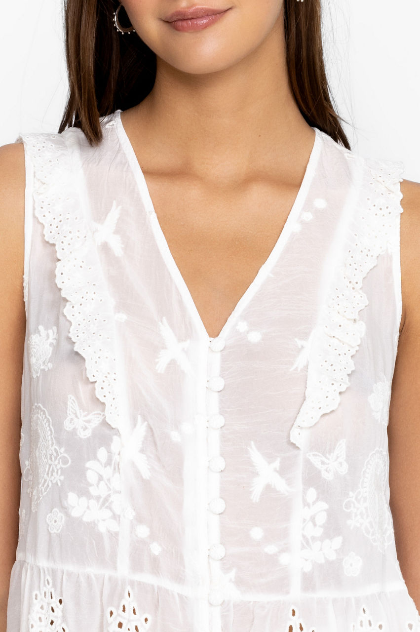 Designed from a breathable material, the Kit Anitta Tank brings a carefree spirit and a touch of whimsy to your warm-weather repertoire. Perfect for tropical destinations and sun-lit afternoons, this tank boasts a V-neck, a button front, a detailed embroidery, and scallop trims and ruffled shoulders for a fanciful finish. Pair with jeans and sandals for an effortless daytime ensemble.