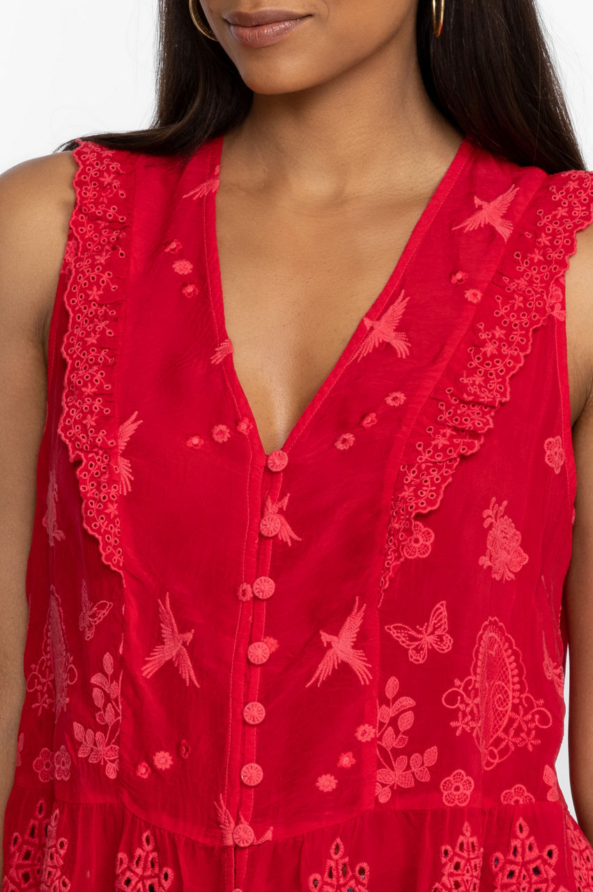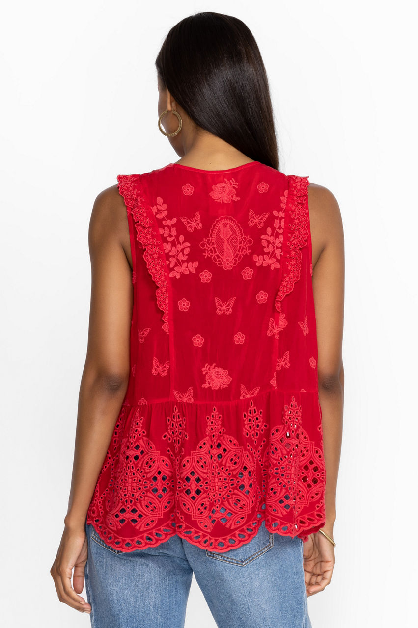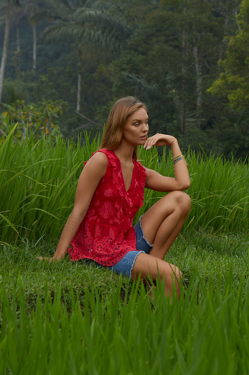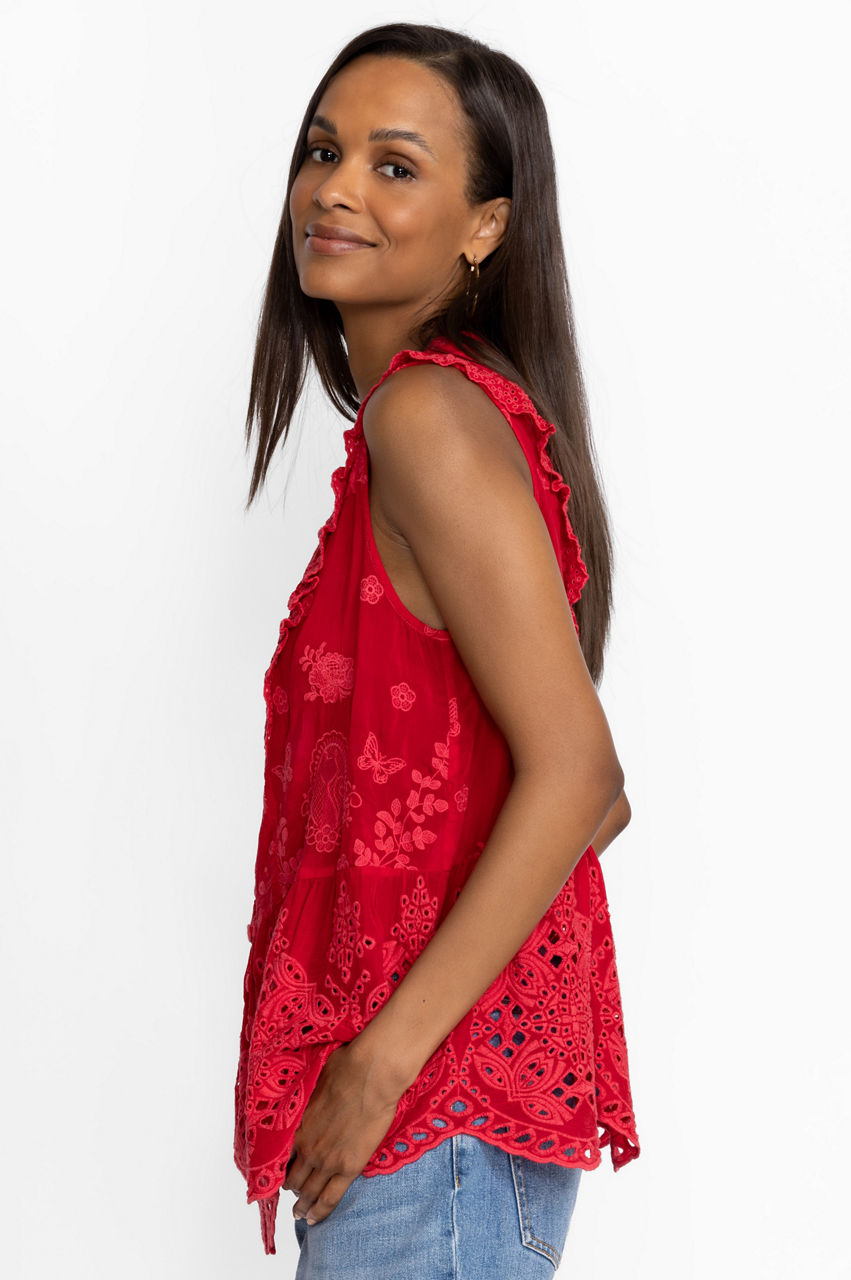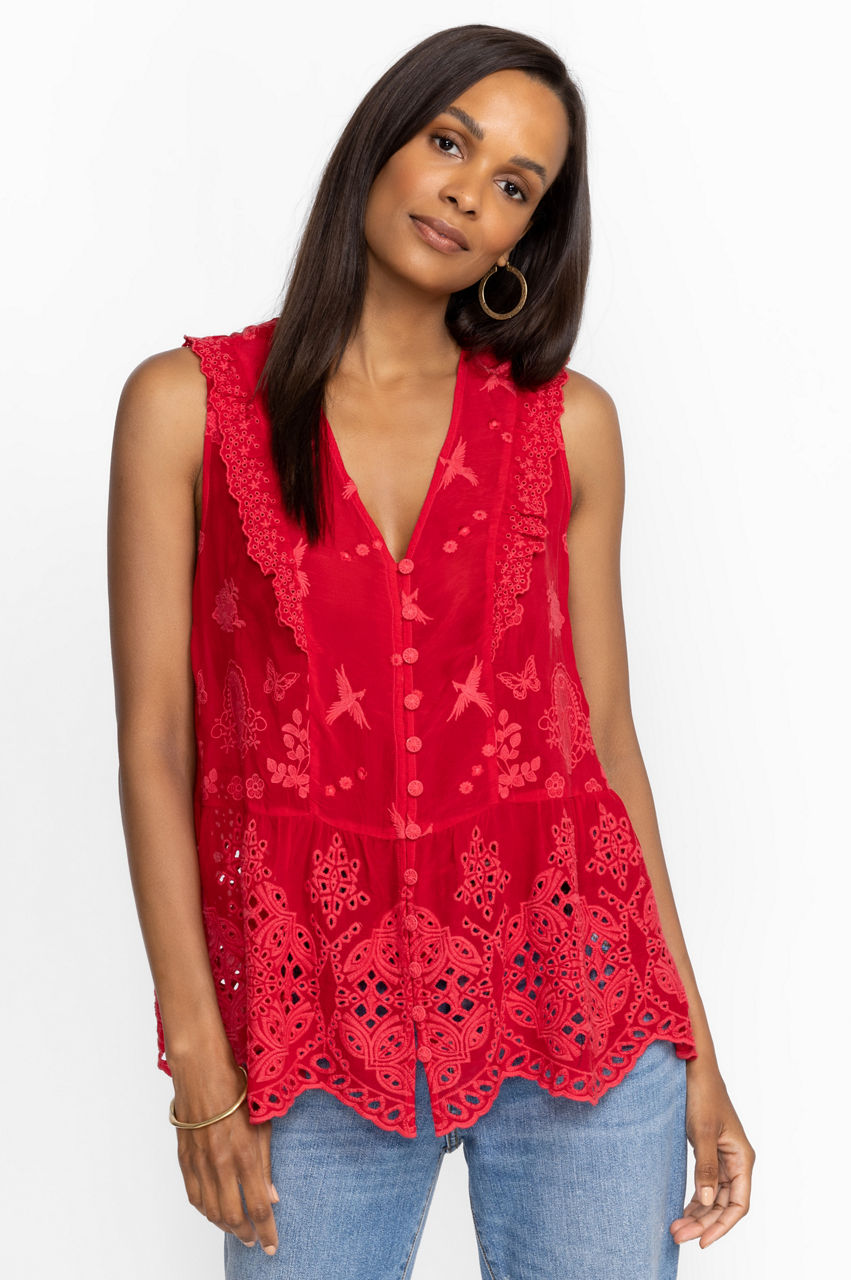 Designed from a breathable material, the Kit Anitta Tank brings a carefree spirit and a touch of whimsy to your warm-weather repertoire. Perfect for tropical destinations and sun-lit afternoons, this tank boasts a V-neck, a button front, a detailed embroidery, and scallop trims and ruffled shoulders for a fanciful finish. Pair with jeans and sandals for an effortless daytime ensemble.