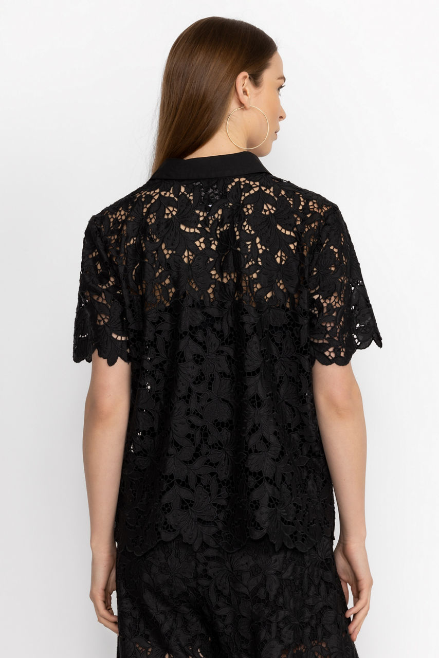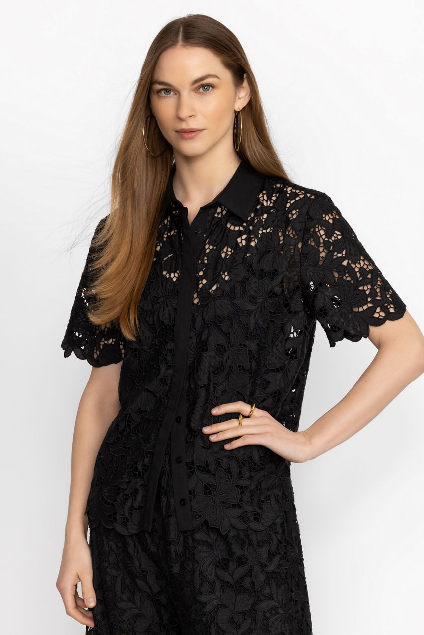 Offering a fresh, feminine take on classic shirting, the Kitt Lace Button Down Shirt is a modern wardrobe staple. Crafted from a cotton blend this button-front shirt is slip lined and finished with delicate scalloped lace edges. Pair with fitted pants and classic pumps for a polished workday look.