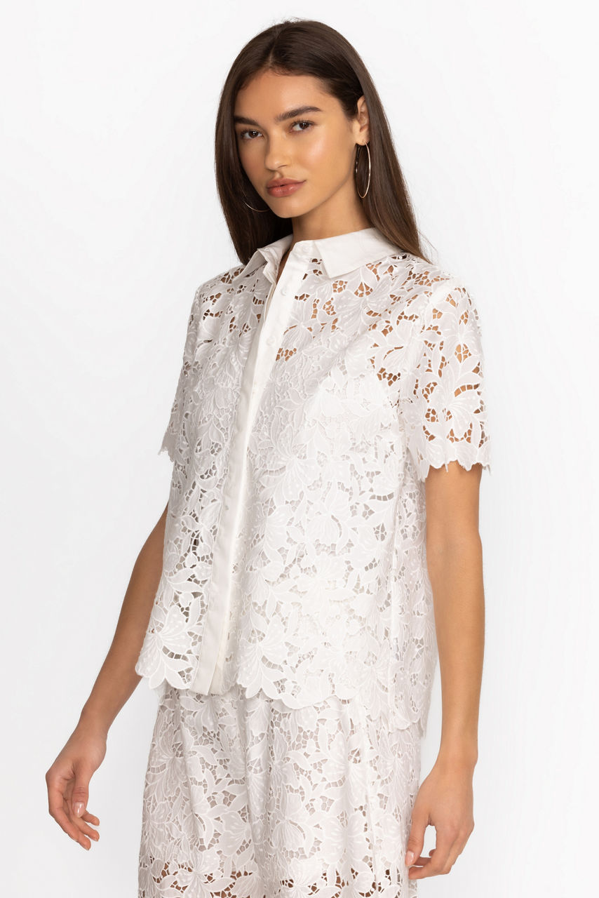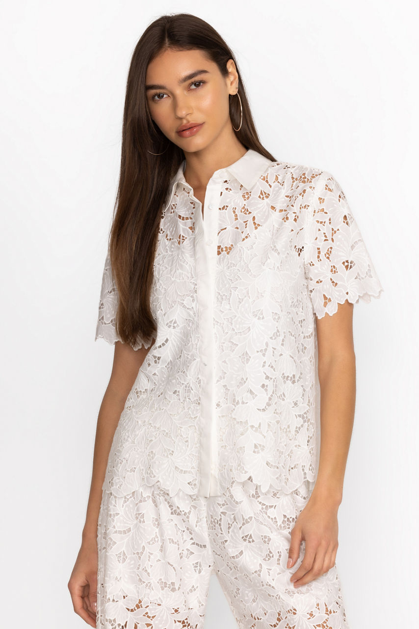 Offering a fresh, feminine take on classic shirting, the Kitt Lace Button Down Shirt is a modern wardrobe staple. Crafted from a cotton blend this button-front shirt is slip lined and finished with delicate scalloped lace edges. Pair with fitted pants and classic pumps for a polished workday look.