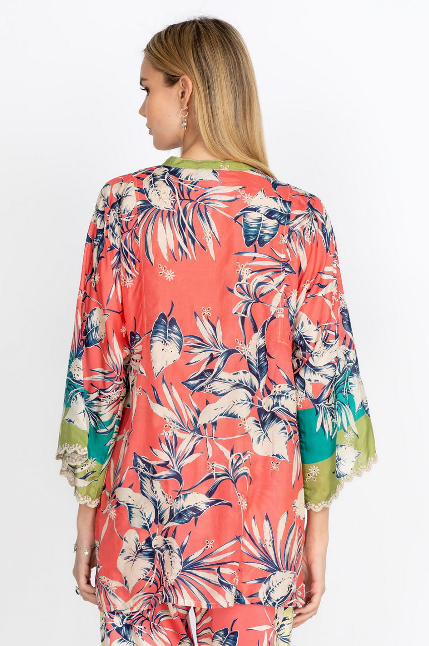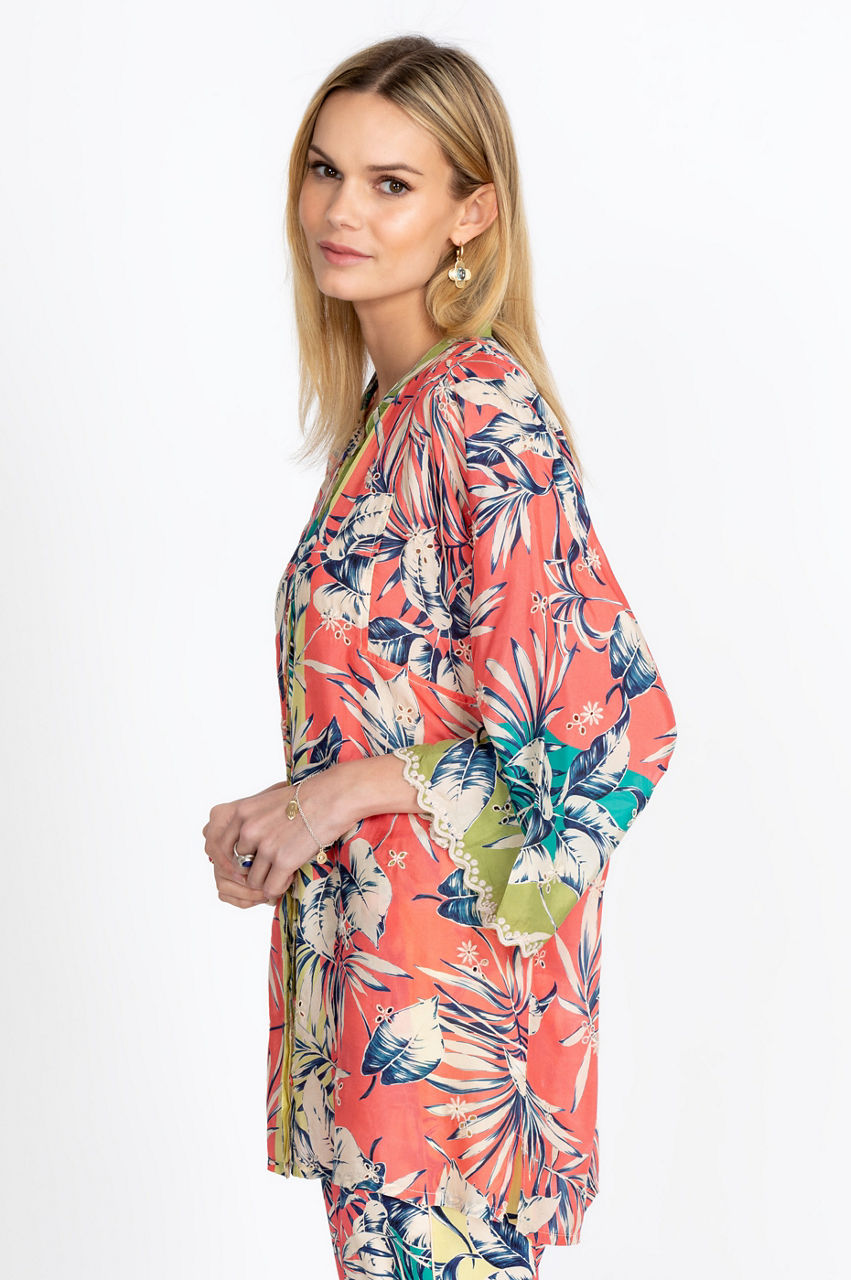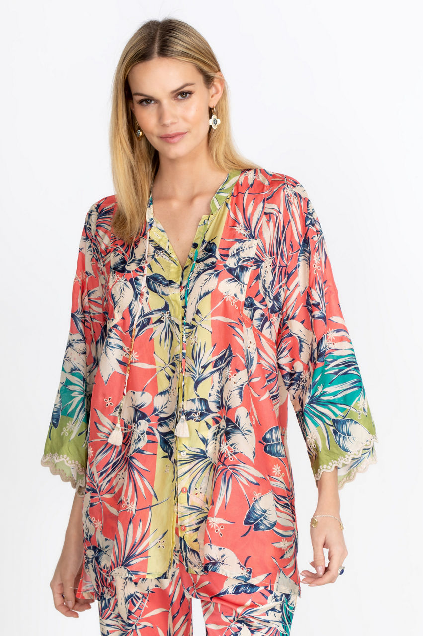 The Kygo Marianna Tunic instantly stands out with its unique design. From the Mandarin collar to the discreet sleeve hem cutouts, every detail evokes sophistication. The multicolored print will add a splash of color to your outfit while the large floral motifs create a retro feeling. Create a refined contrast by wearing this top with black dress pants or play with color patterns by pairing it with colored denim.