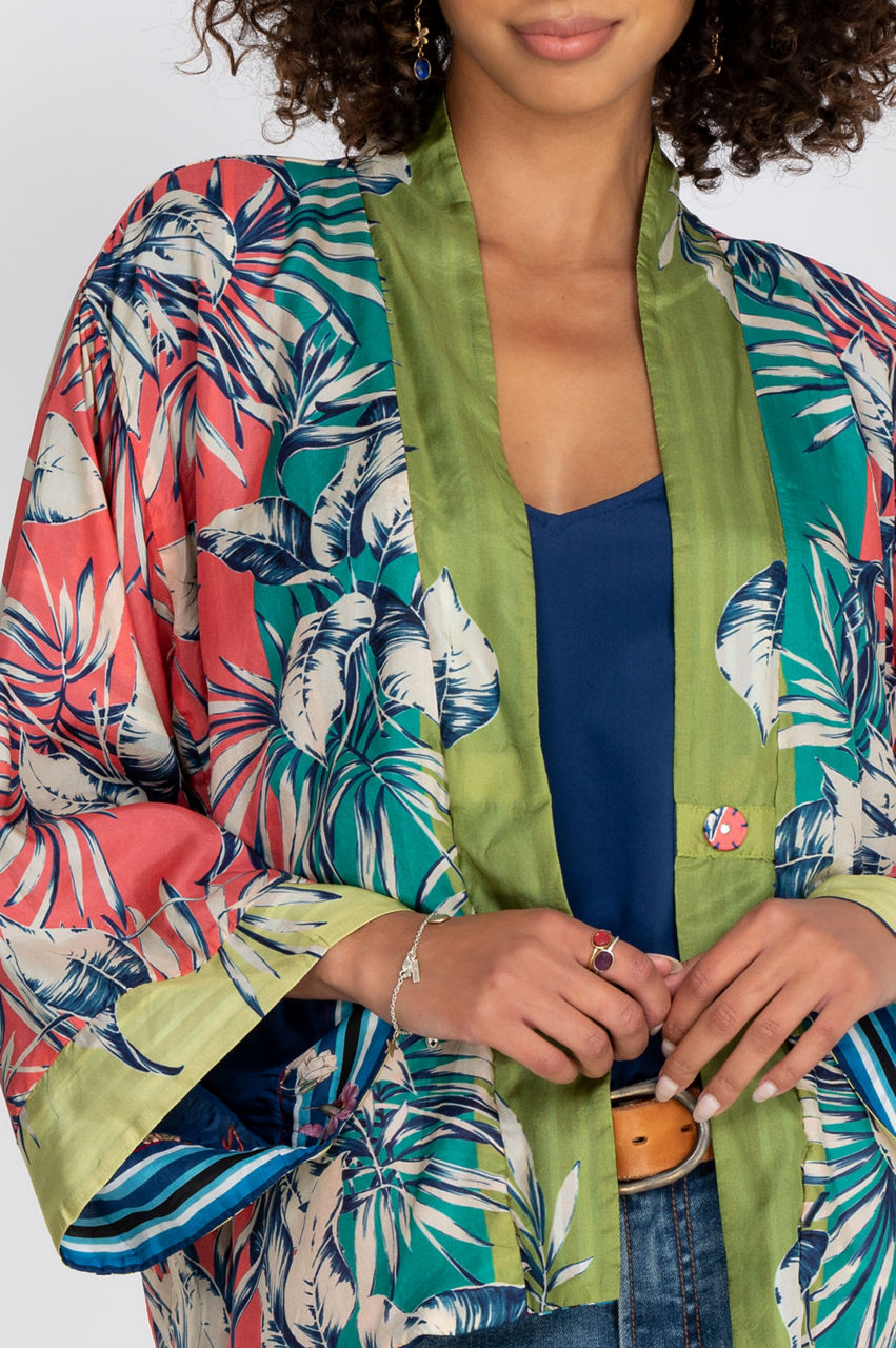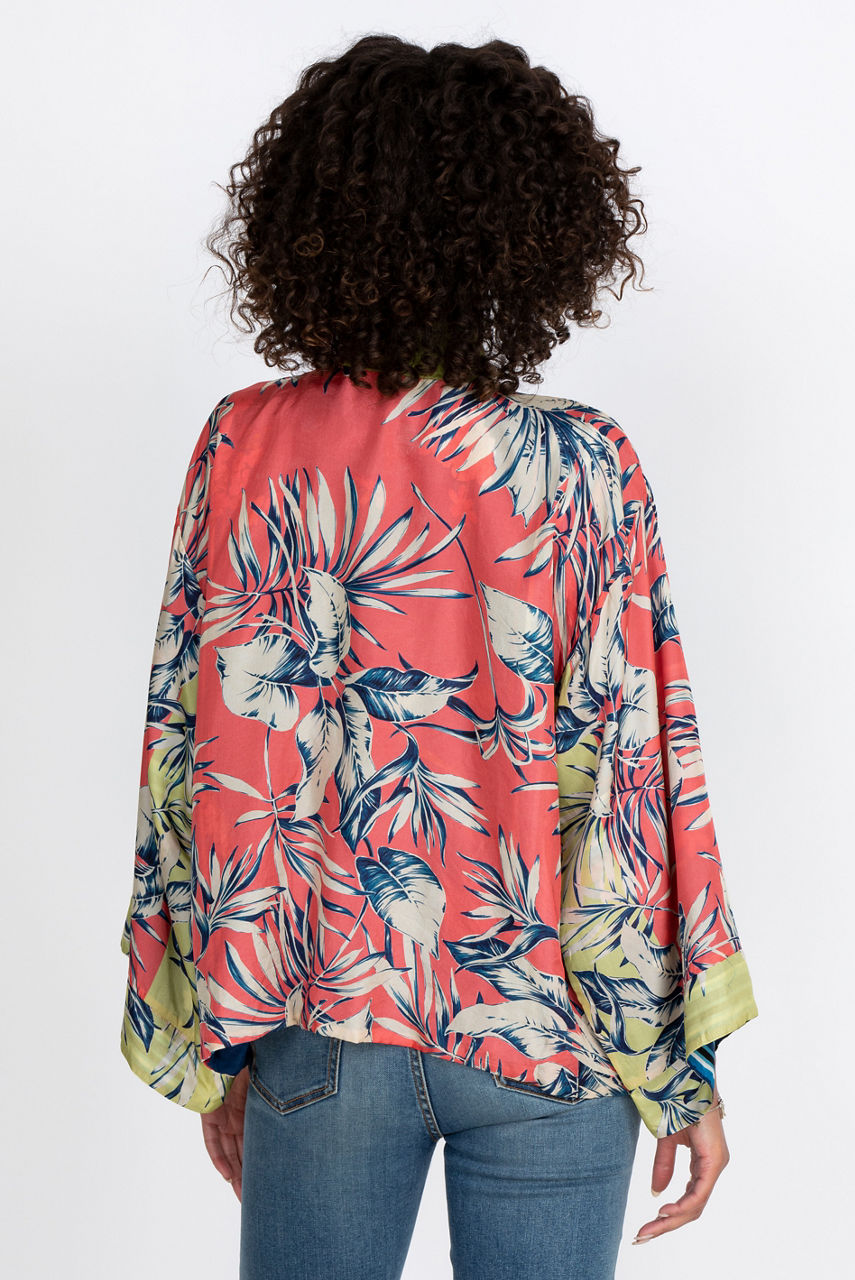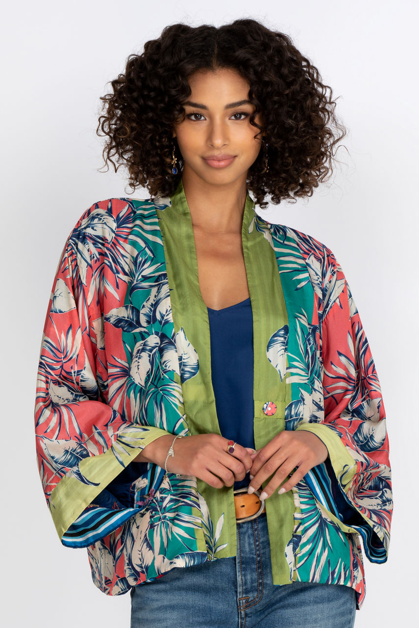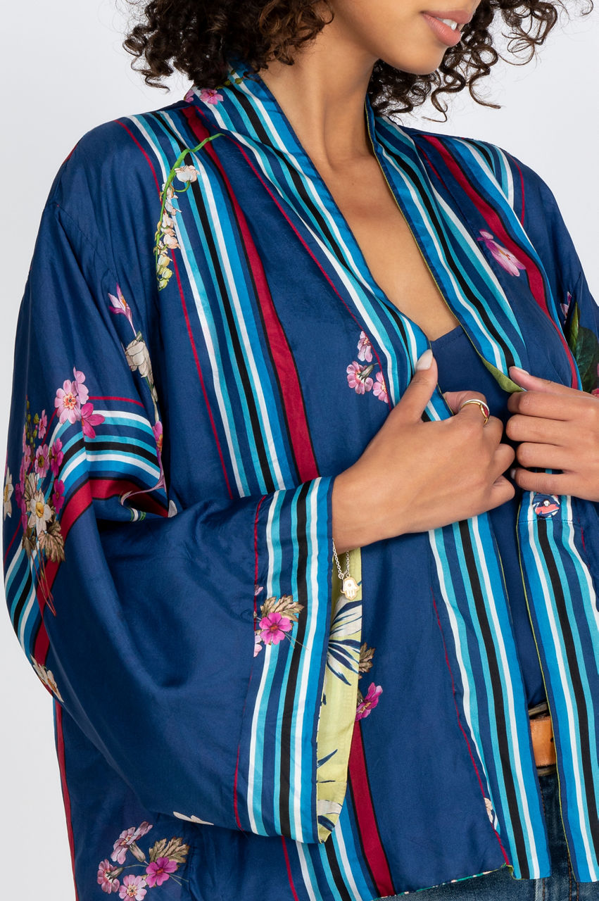 Add a touch of style to your wardrobe with this elegant and comfortable silk kimono. The large floral motifs stand out against a colorful background that creates a delicate contrast while the cut of the kimono creates a loose and flowy fit. You can combine this reversible kimono with your favorite leggings for lounging or style it like a blazer for a special occasion.