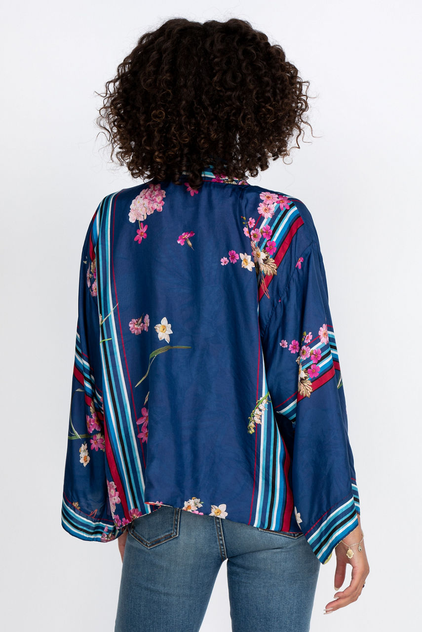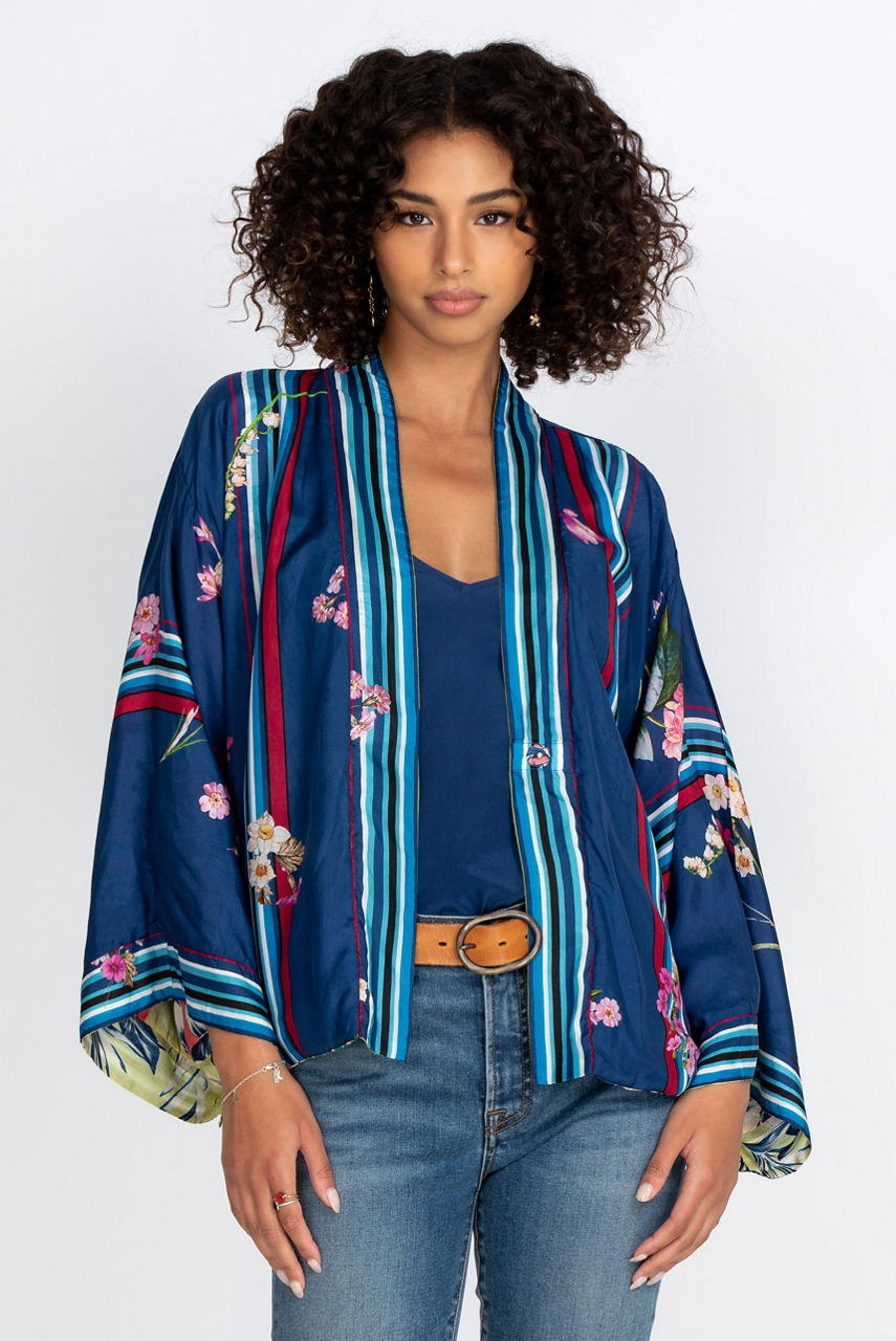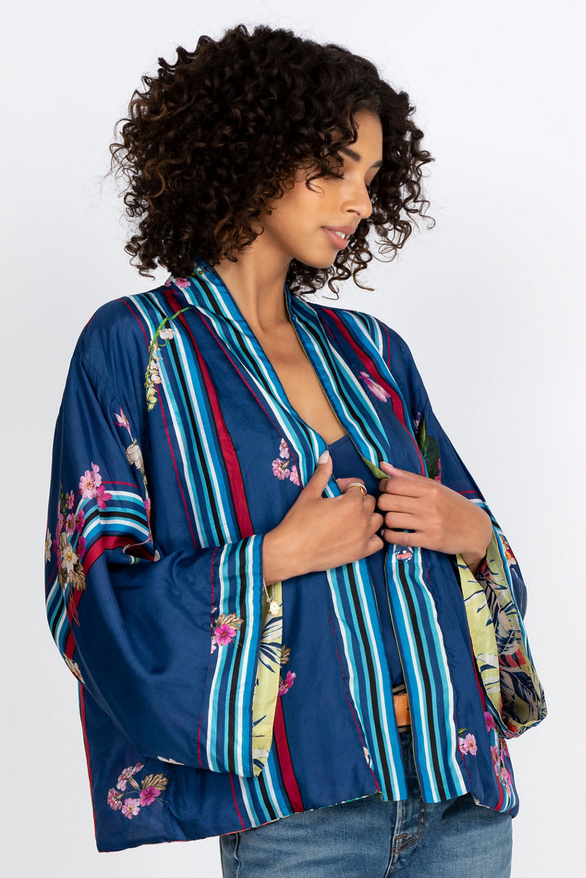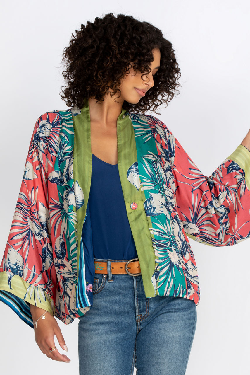 Add a touch of style to your wardrobe with this elegant and comfortable silk kimono. The large floral motifs stand out against a colorful background that creates a delicate contrast while the cut of the kimono creates a loose and flowy fit. You can combine this reversible kimono with your favorite leggings for lounging or style it like a blazer for a special occasion.