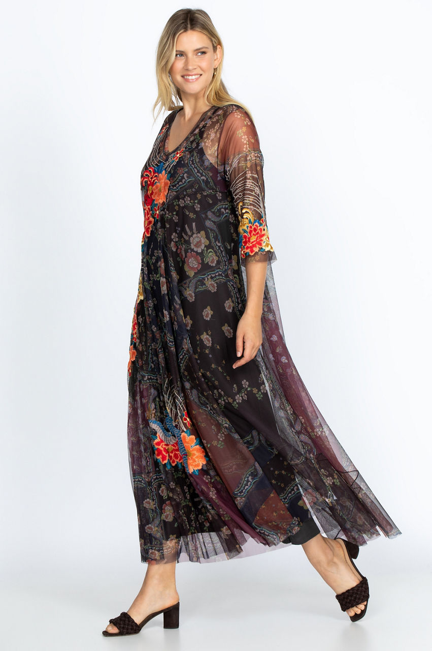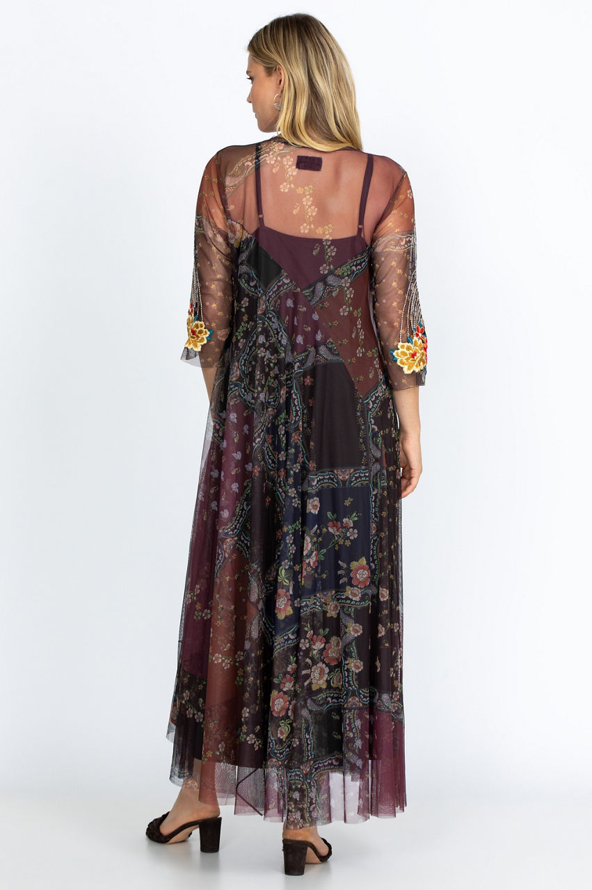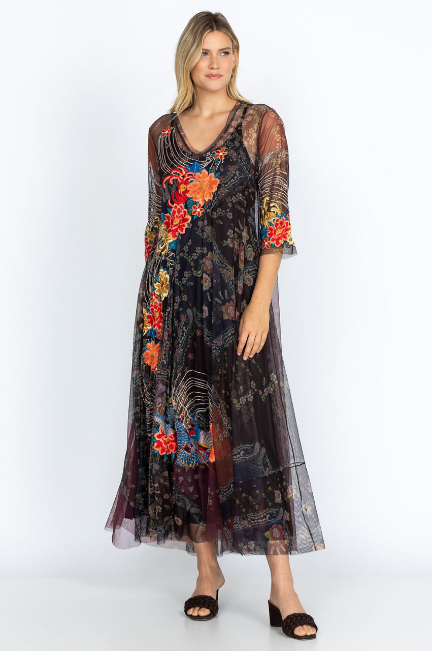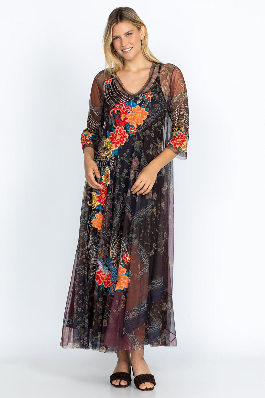 The perfect mix of boho and autumn flair is in our Kyler Mesh Dress. With a V-neck, flowy silhouette, and quarter sleeves, this dress flatters and puts you together in one sweep. The floral patchwork design blends perfectly with those blustery fall days in the park or having lunch with friends. Pairs great with necklaces and light scarves.