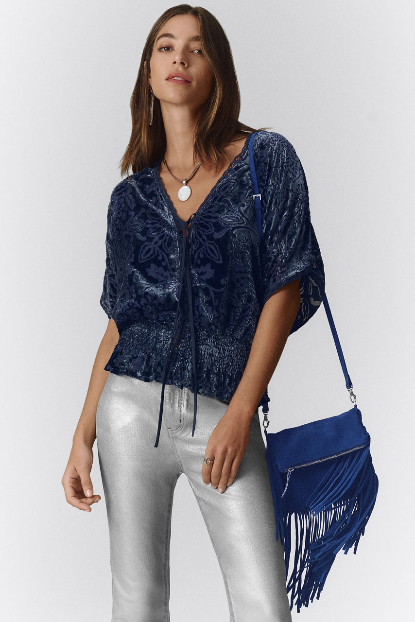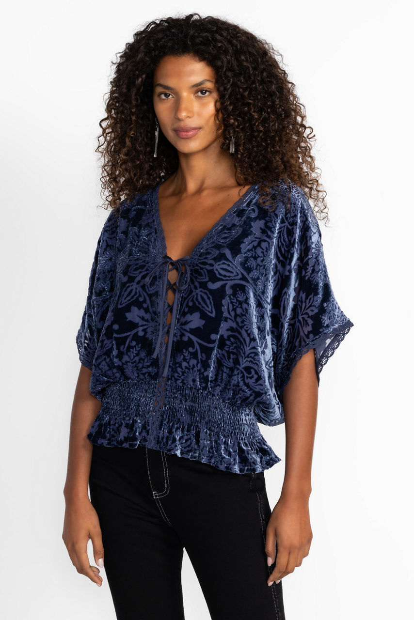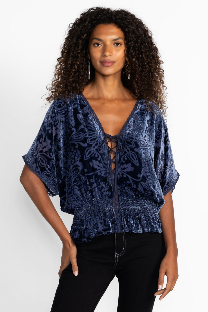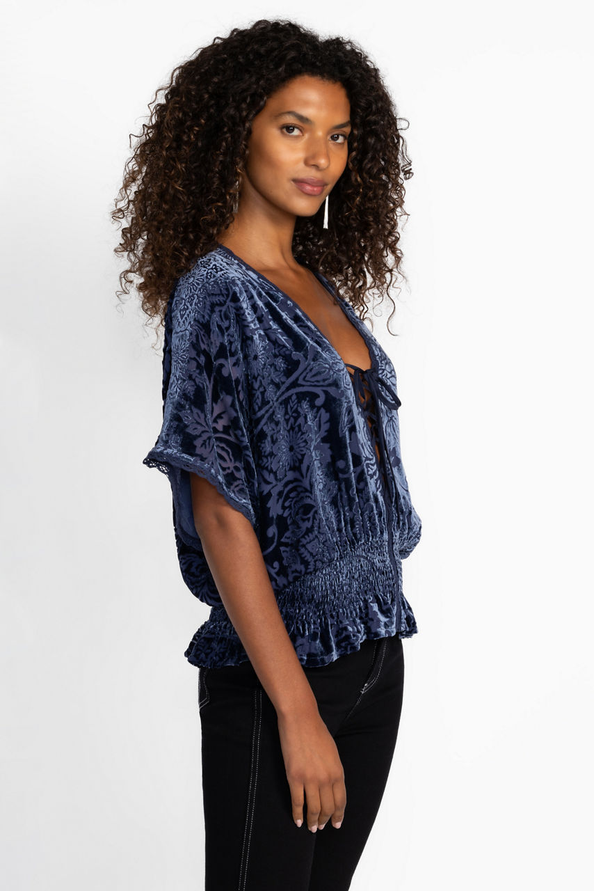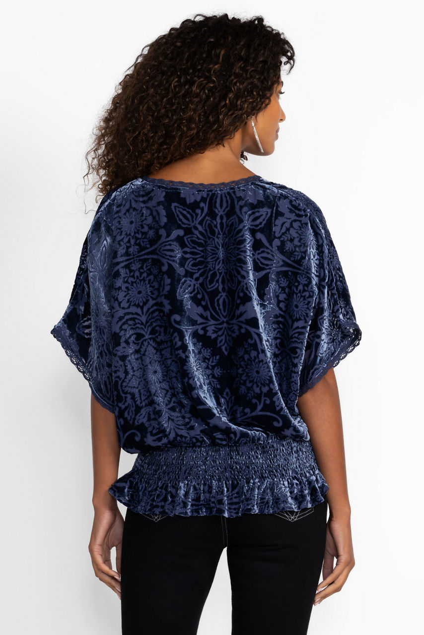 Washed in a rich sapphire blue, the Kyoto Smocked Blouse is embellished with an intricate tone-on-tone pattern. Crafted from a luxurious silk blend, this ornate blouse is finished with drop sleeves and a smocked waist for a unique silhouette. Pair with a sleek pencil skirt and delicate jewelry for a polished evening look.