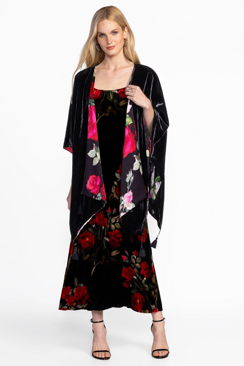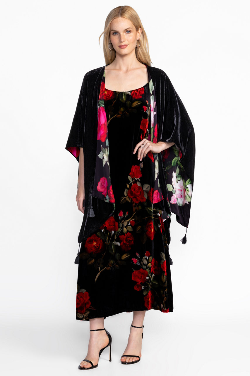 Designed to sit comfortably across the shoulders, the Kyria Velvet Cape adds an air of sophistication. Lined with a bold contrasting pattern, this beautifully draped cape is finished with decorative beaded tassels at the front and back. Layer over a stunning dress and pair with heels for a polished evening look.