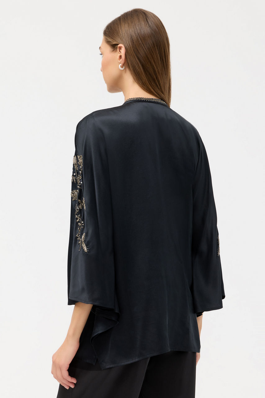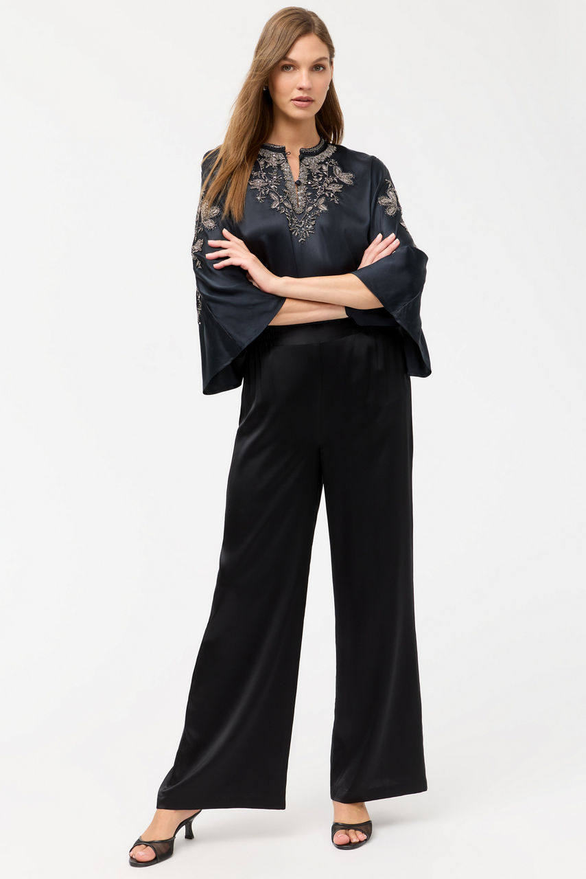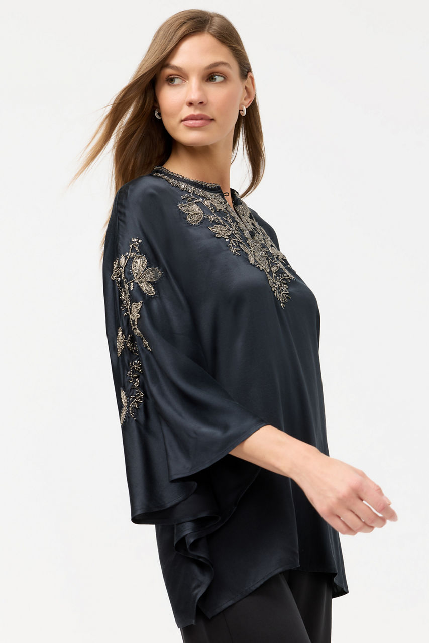 Crafted from 100% luxurious silk, the La Jolla Kaftan Top offers elegant styling with a relaxed feel. Designed with a V-neckline and batwing 3/4 sleeves, this flowing top is embellished with intricate beading. Pair with the La Jolla Pants and easy slide sandals for a casual look with polish and style.