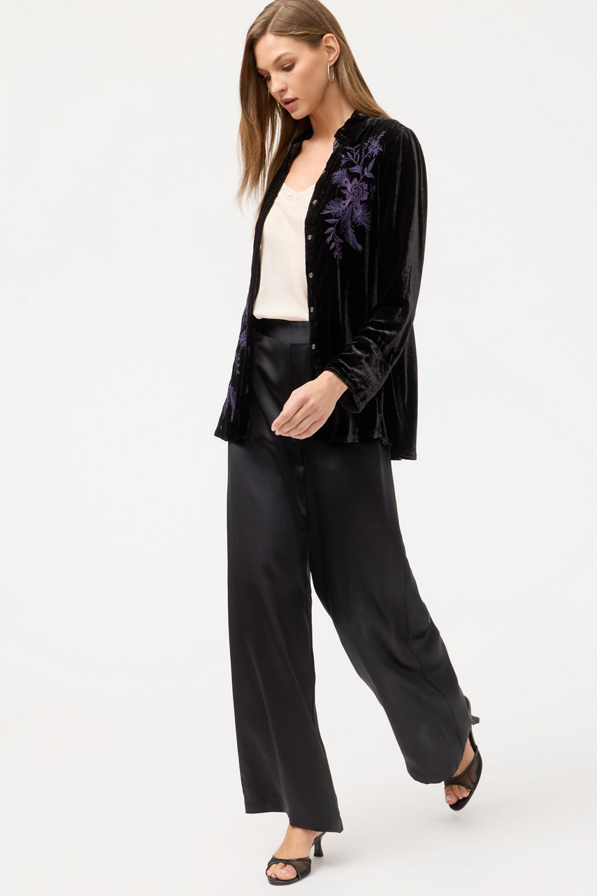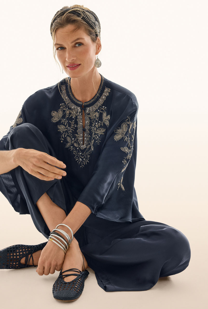 Crafted from 100% sumptuous silk, the La Jolla Pants are an updated wardrobe staple that captures effortless elegance. Designed with a comfortable elastic waist and flowing flared legs, these lightweight trousers move beautifully with every step. Ideal for all seasons, they pair seamlessly with the La Jolla Kaftan Top for a vacation-inspired ensemble