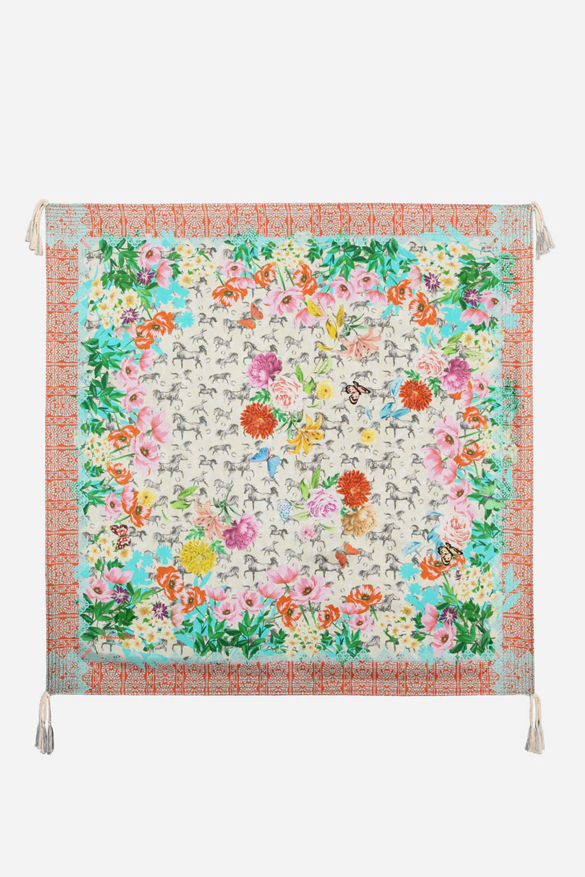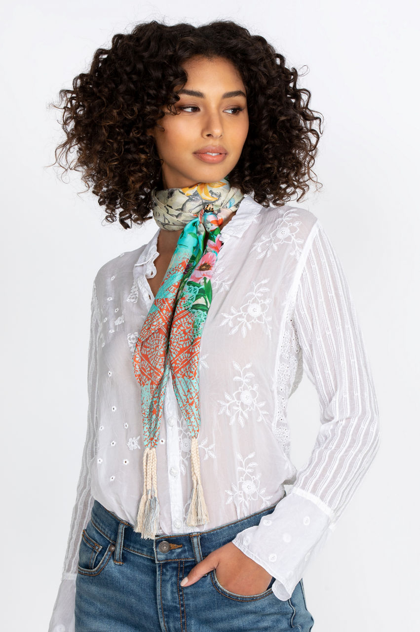 The soft floral blooms and vivid botanical details of our Lace Garden Scarf pop against the dark background. The perfect finishing touch for any boho look, pair this elegant silk piece with your favorite late summer look or tie to the strap of a leather bag for an on-trend pop of color.