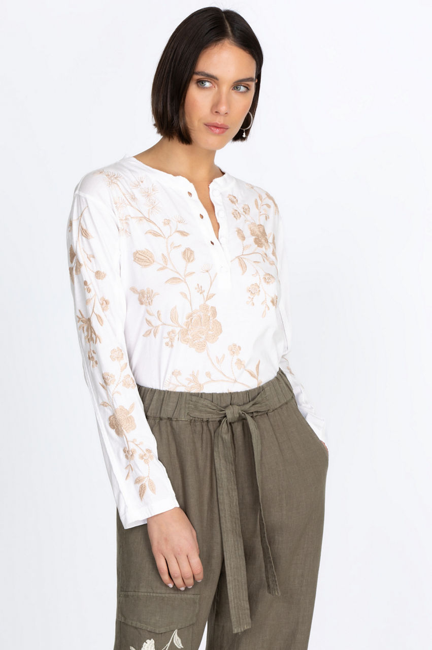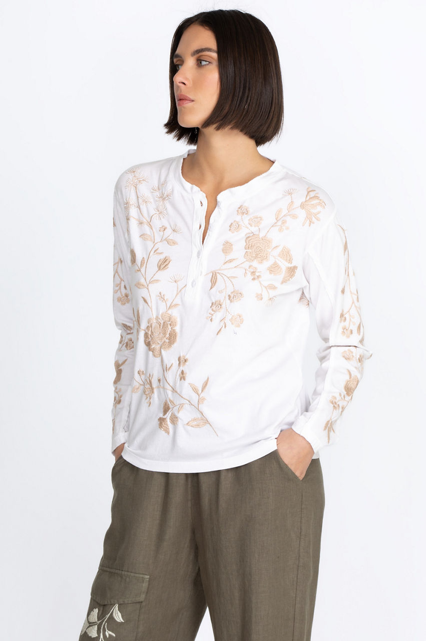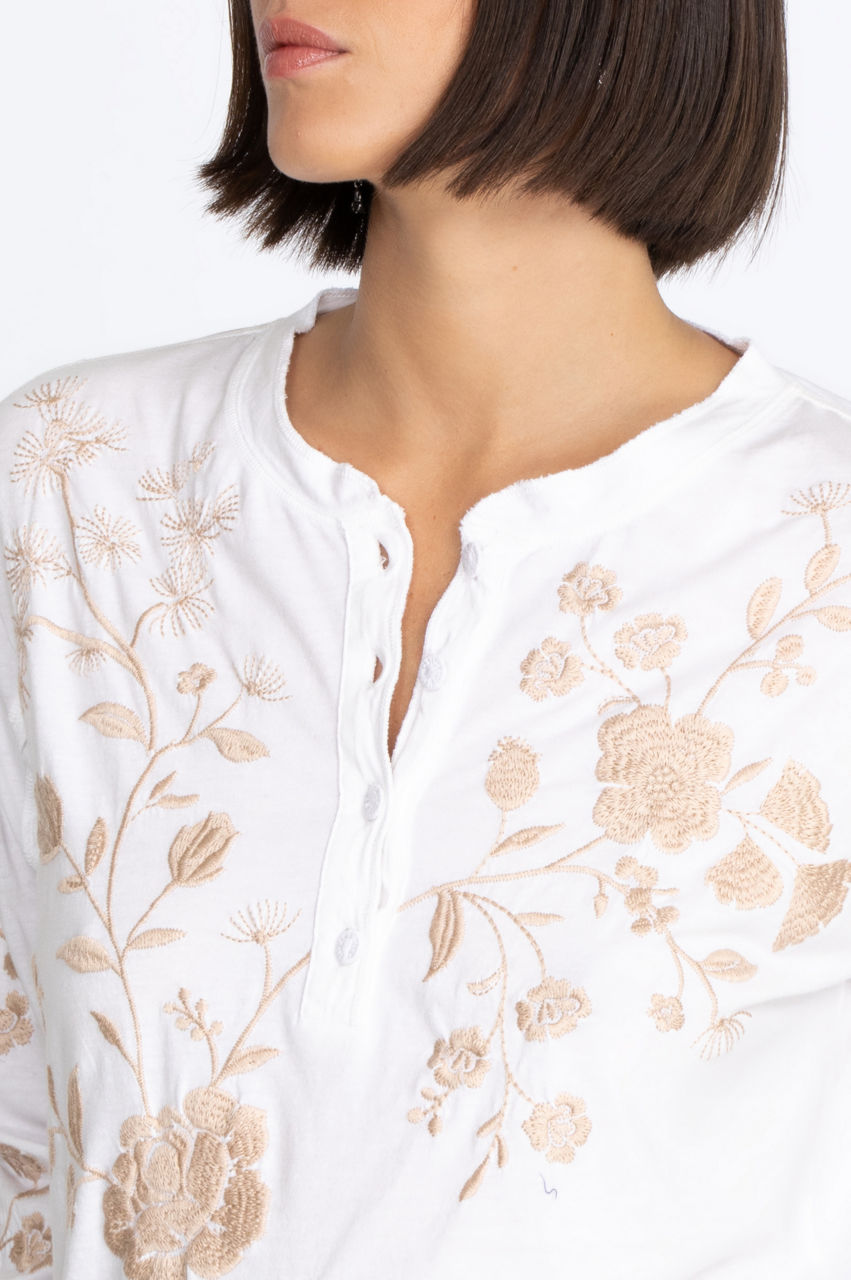 Perfect for travel or relaxing days, the Lael Raw Seam Henley Tee is an elevated take on a daily wardrobe essential. Adopting a classic silhouette, this tee is redefined with a dainty floral embroidery and finished with a button placket and crew neck. Wear it with denim or a soft pair of leggings for a cozy at-home outfit.