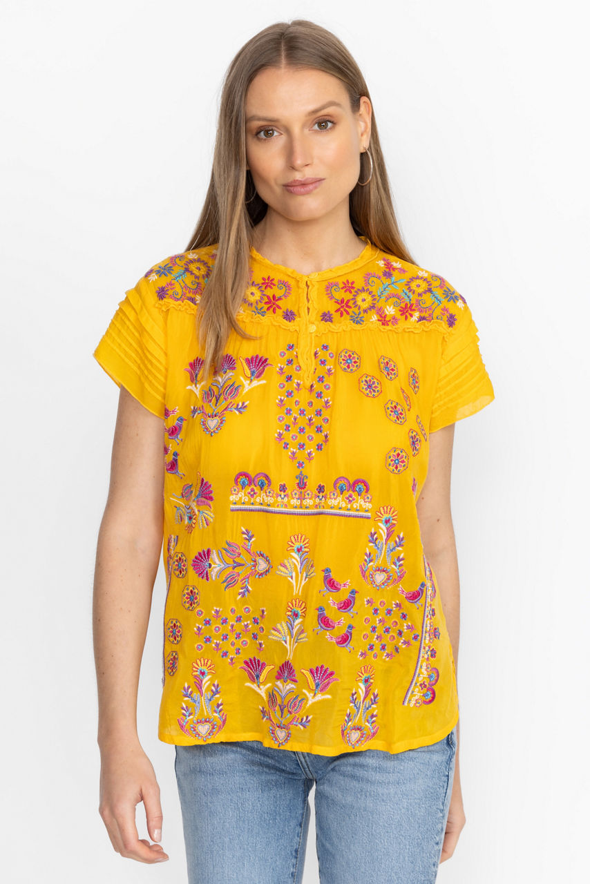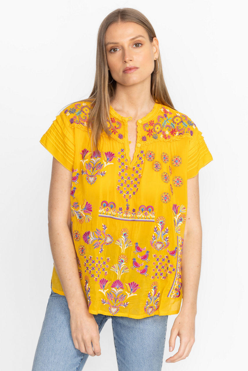 Vibrant and bold, the Lafaret Blouse is generously embellished with intricate placement embroidery. Featuring a split V-Neckline with embroidered trim, this casual blouse offers ruffled cap sleeves and gathers along the front and back for added texture. Pair with linen palazzo pants and wedge sandals for a vacation-worthy ensemble.