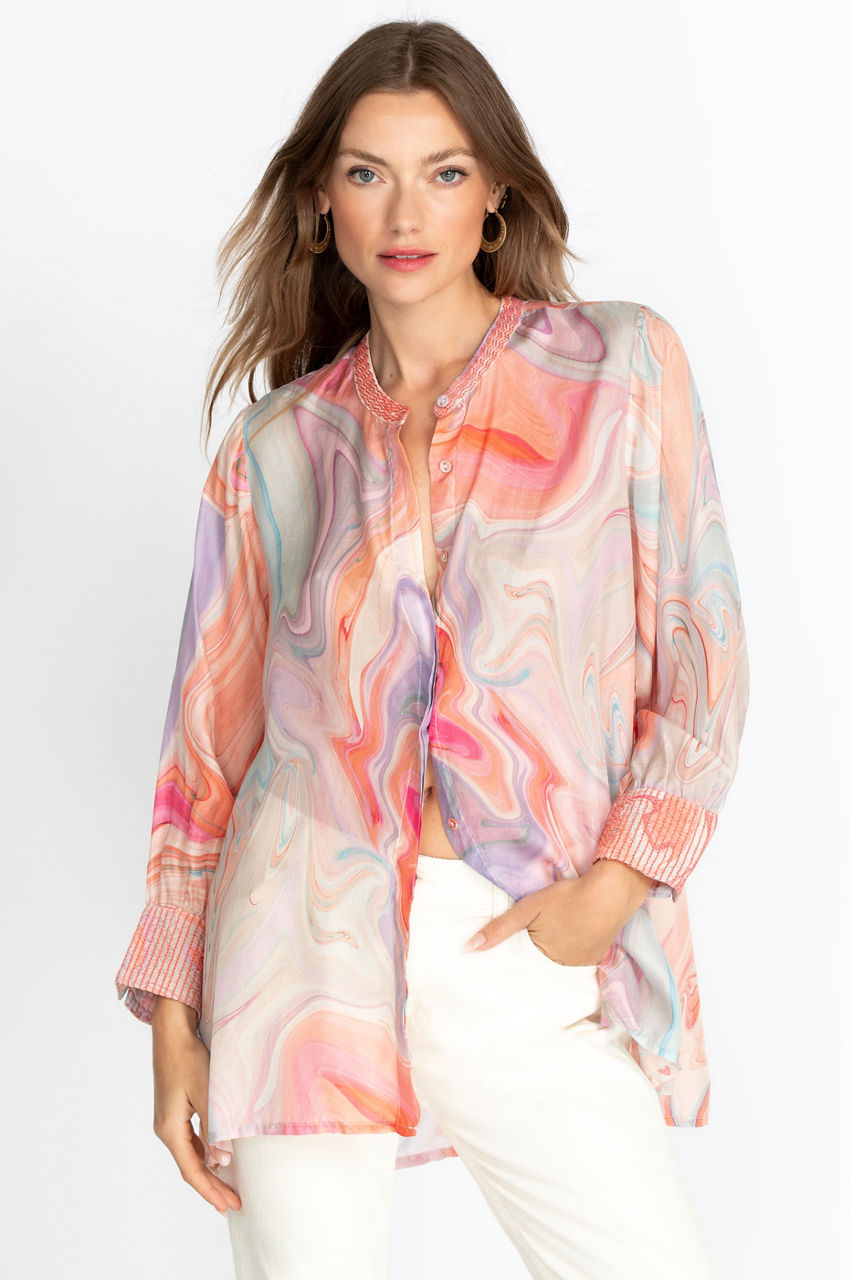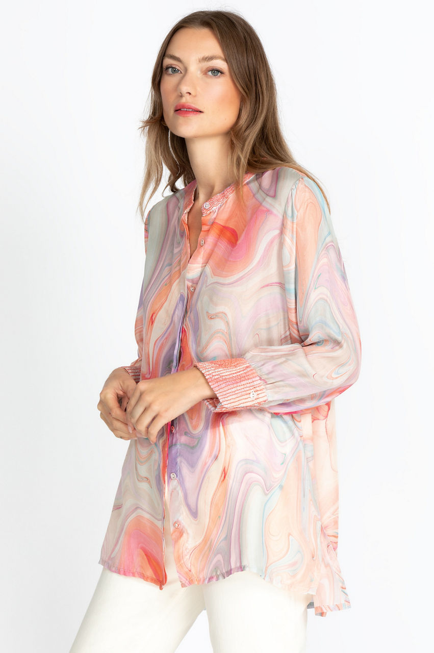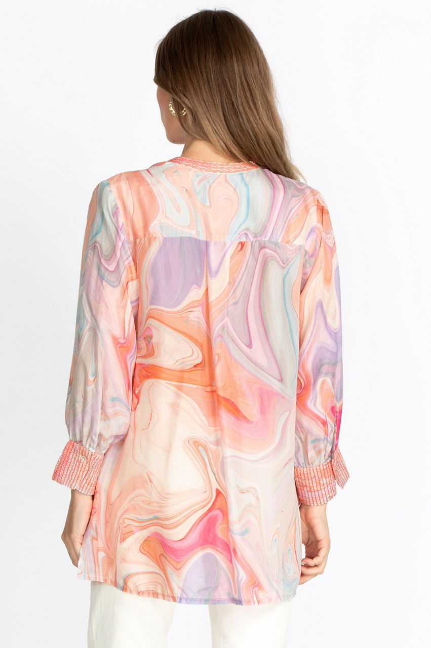 This flattering silk tunic will soon become a staple of your wardrobe with its modern high-low hem and flowy fit. The swirl pattern mixes vibrant hues for a sophisticated result, and the round collar and V-neck are perfect for showcasing colorful jewelry that will echo the dashing swirl motif. Have fun creating interesting contrasts by pairing this stunning piece with a dark denim wash!