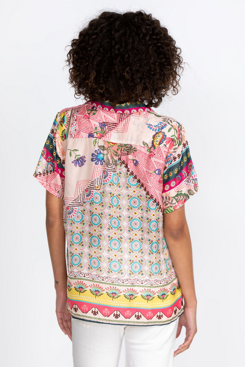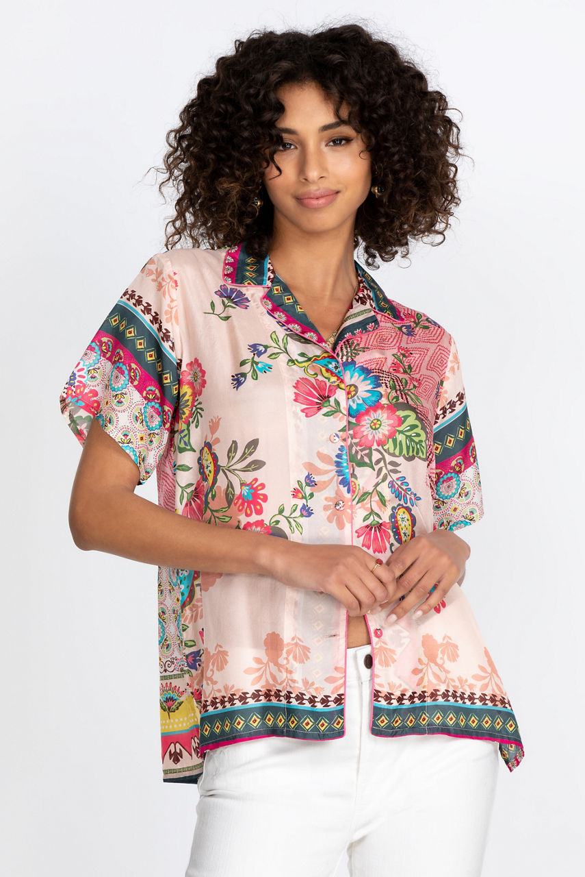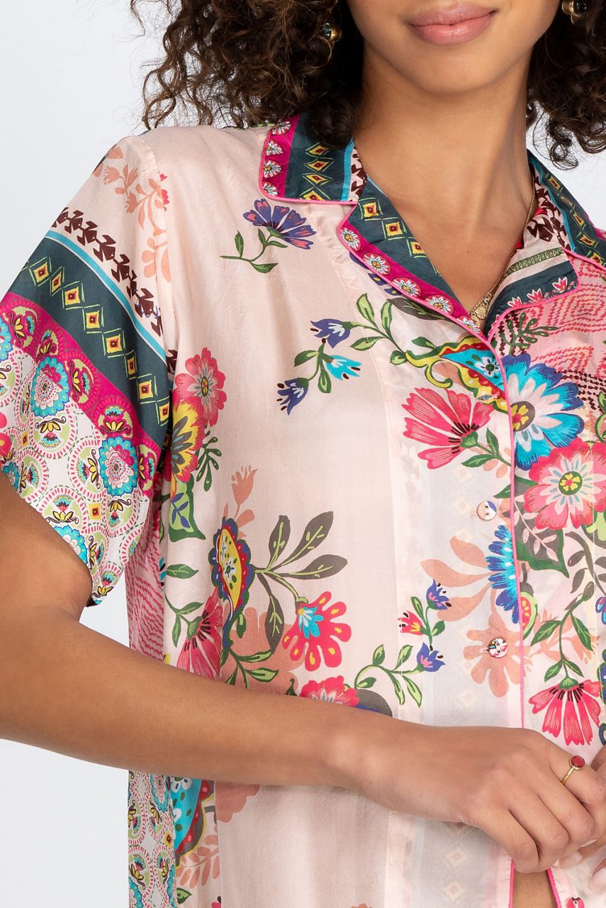 This delicate silk button-up top combines the classic construction of a front-closure blouse with loose-fitting sleeves and large floral motifs. The result is a colorful top that can add structure and originality to your outfit. Emphasize the contrasting motifs of the collar by wearing a geometric pendant and create a subtle pattern with the darker blue tones of the print by tucking this top into a pair of dark jeans.