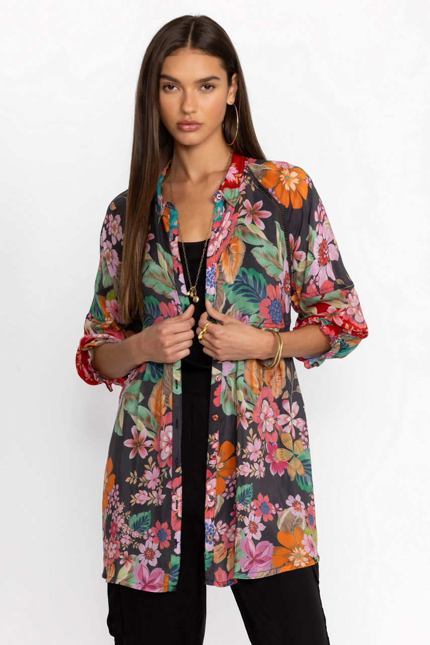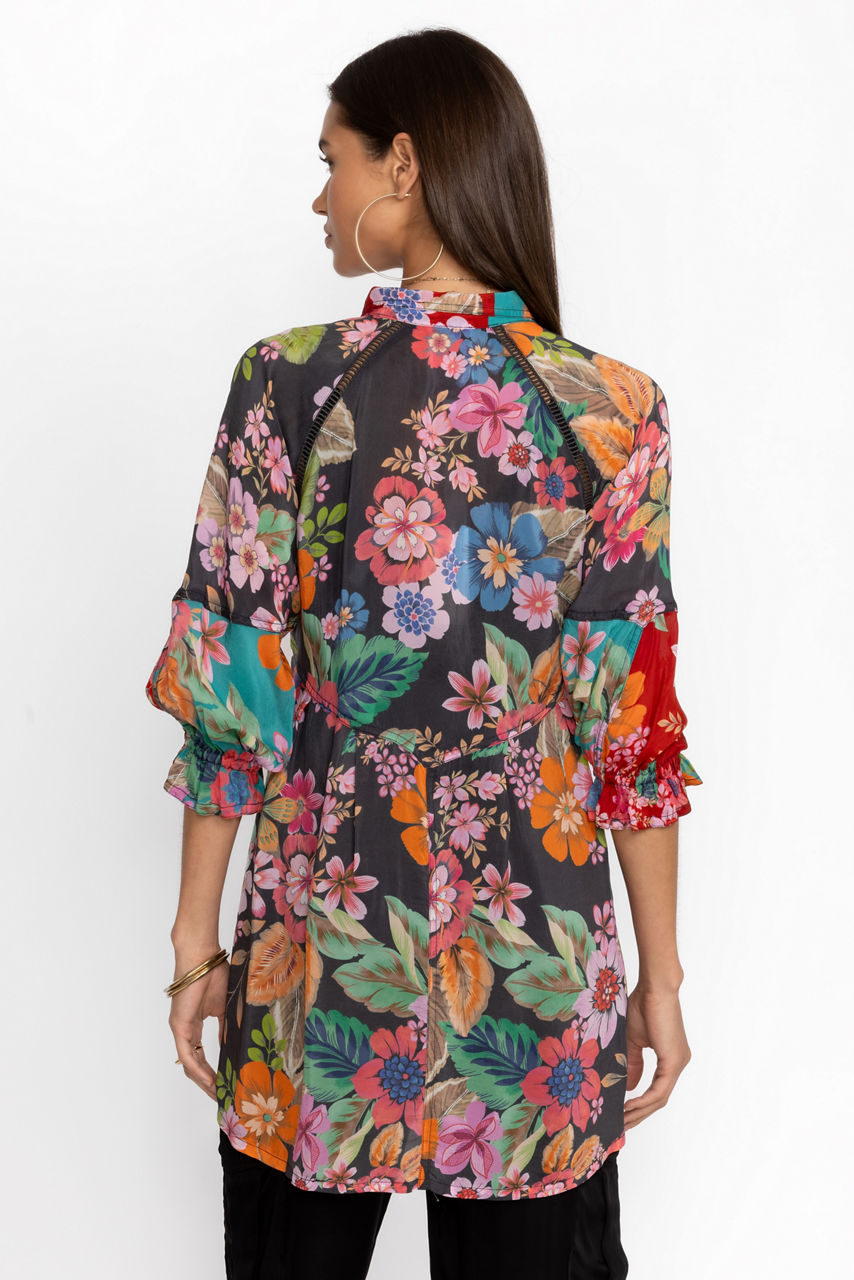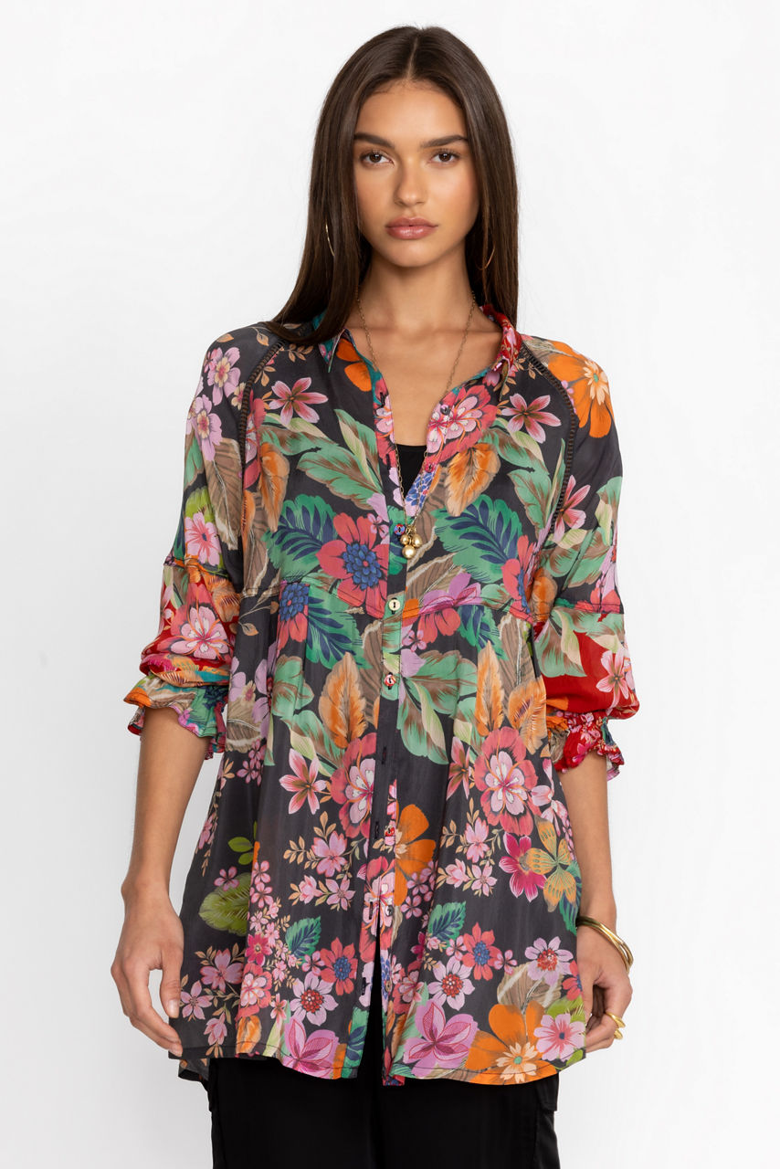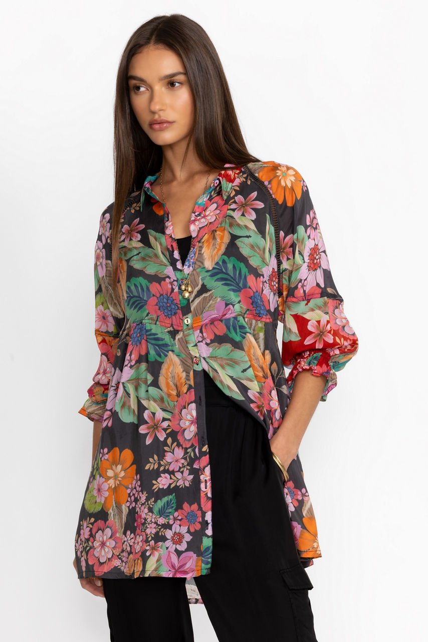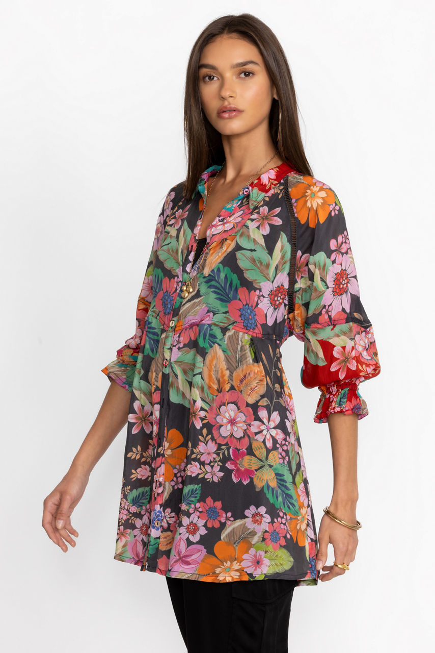 Defined by delightful floral bouquets, the Lapham Adonia Tunic offers a combination of vibrant color and a stunning silhouette. Featuring a button front neckline and relaxed raglan sleeves, this top is delineated by intricately detailed seaming for added texture. Pair with fitted pants and flats for a vibrant look.