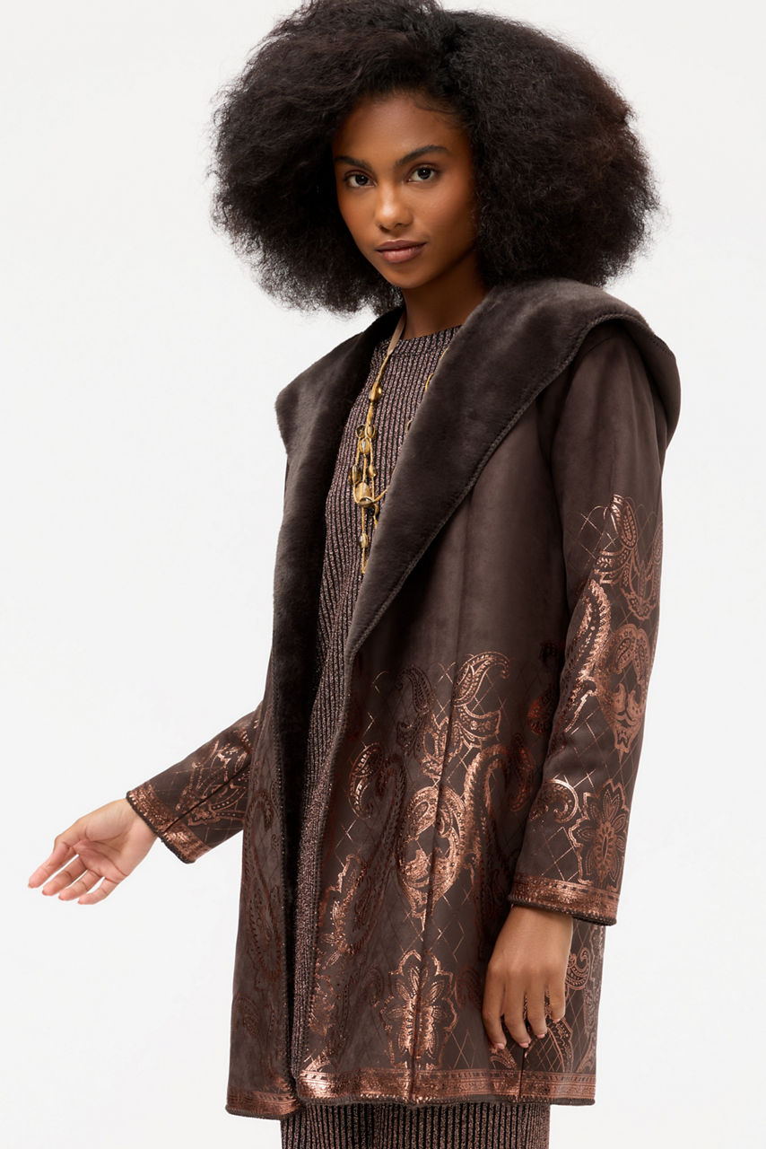 Crafted from a cozy blend of materials, the Lasei Faux Suede Fur Coat is embellished with a rich foil print. Designed with an attached hood and intricate blanket stitching at the edges, this unique coat is finished with slip pockets at the sides. Layer over a lightweight pullover and classic denim for a polished casual ensemble.