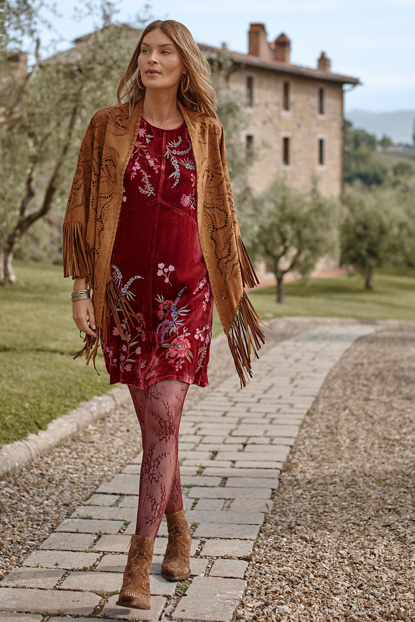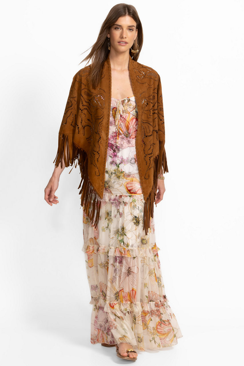 Crafted from luxurious 100% suede, the Laser Cut Italian Suede Poncho is an unforgettable layering piece. Embellished with intricate laser-cut detailing and fringe throughout, this open front poncho is tacked under the arms for a tailored fit. Layer over a denim shirt and linen skirt and pair with western-style boots for a fresh weekend look.